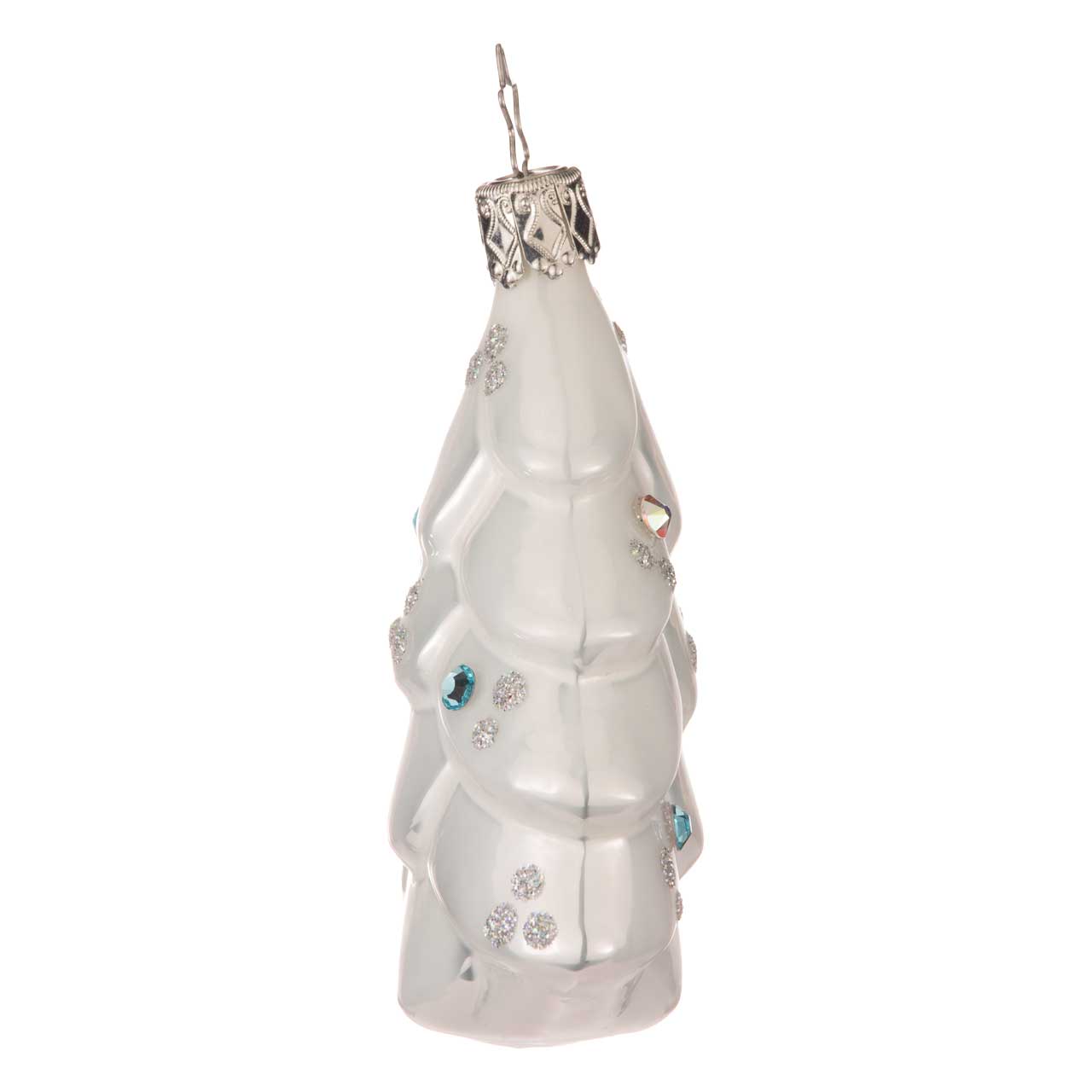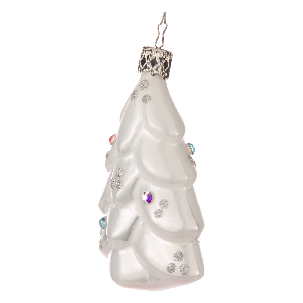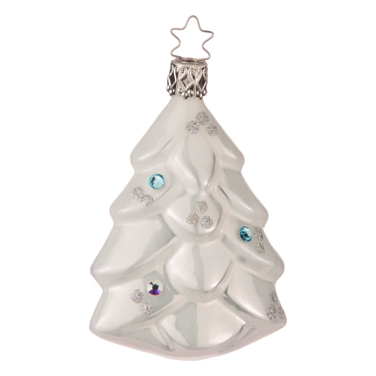 El adorno presenta un abeto estilizado con un brillo blanco nacarado. Las ramas curvadas están decoradas con brillantes detalles de purpurina plateada y varias piedras preciosas azules que parecen pequeños cristales de hielo. La forma es plana y claramente estructurada, lo que resalta especialmente el elegante motivo.