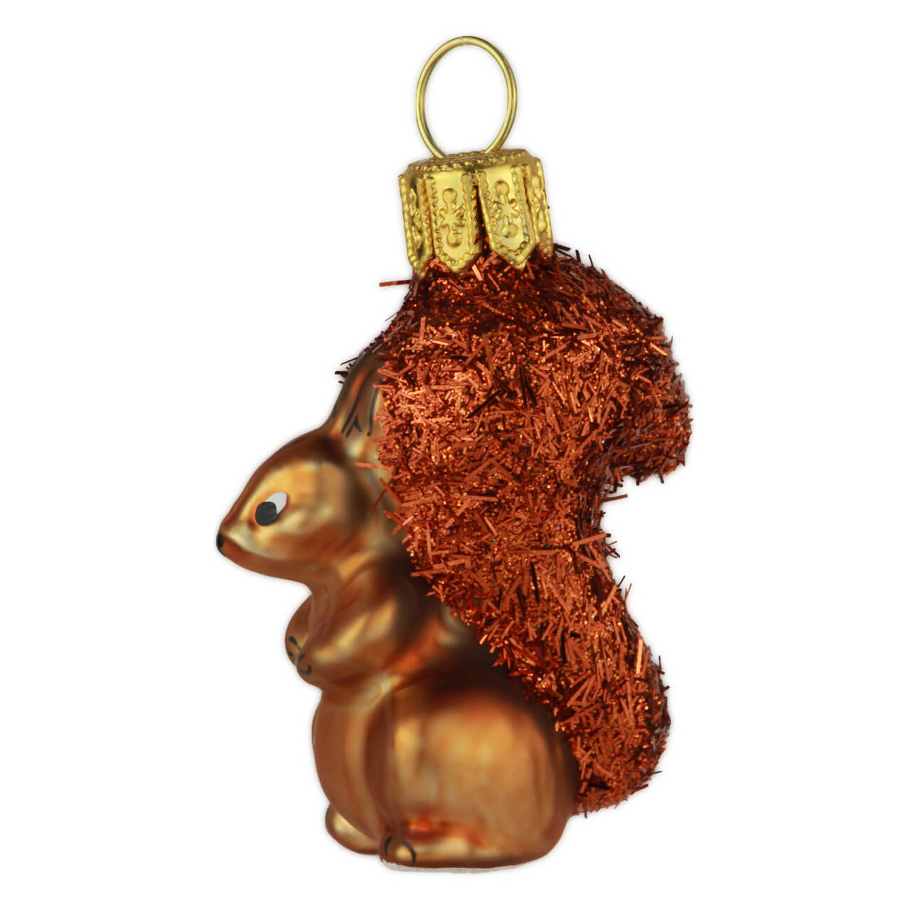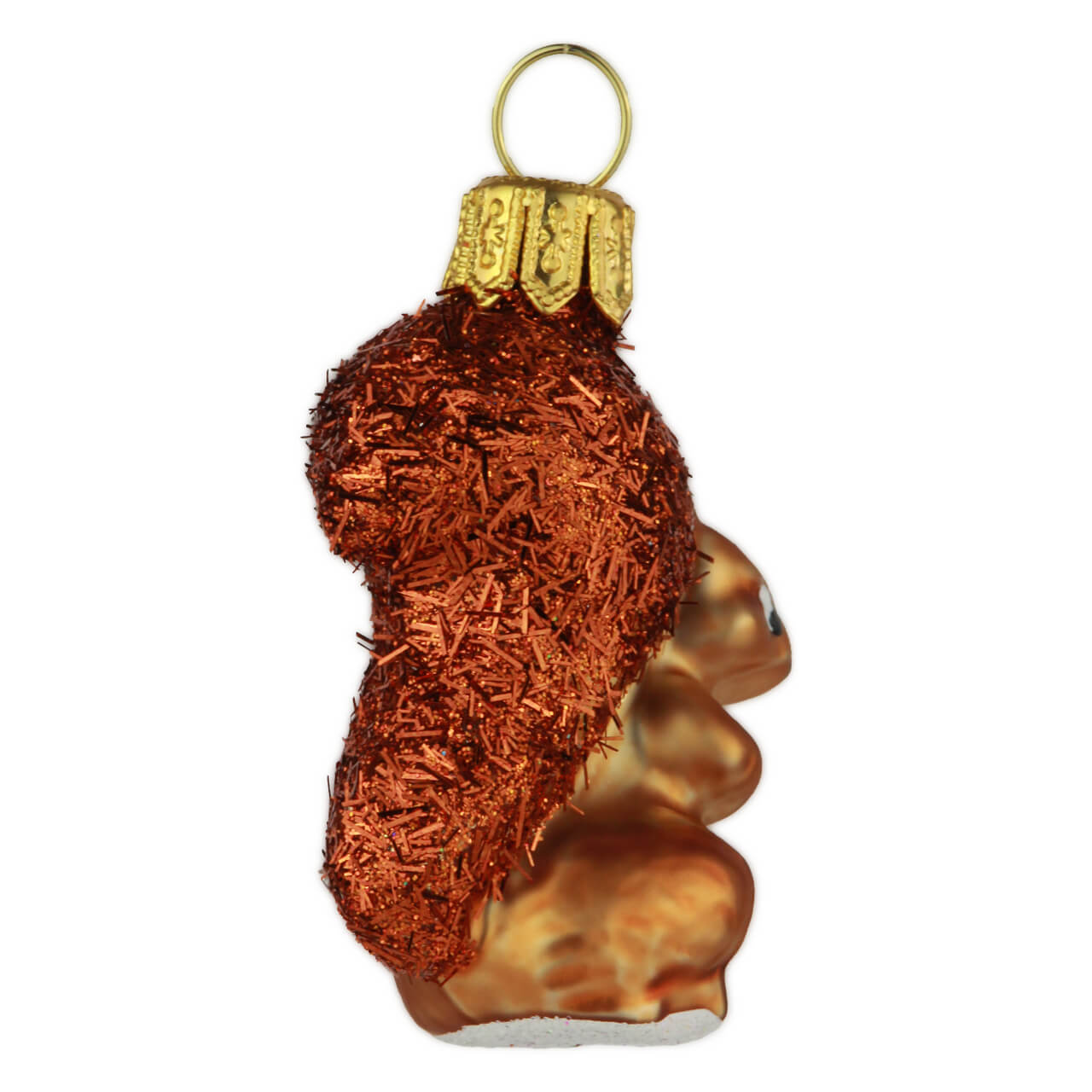 Esta pequeña ardilla de color marrón rojizo con ojos de botón blancos y negros es demasiado mona. Cuelga erguida en la típica postura masculina de la copa dorada. Sus patas traseras y la parte inferior del cuerpo están espolvoreadas de purpurina blanca como la nieve. Y su característica cola marrón con purpurina: ¡qué llamativo!