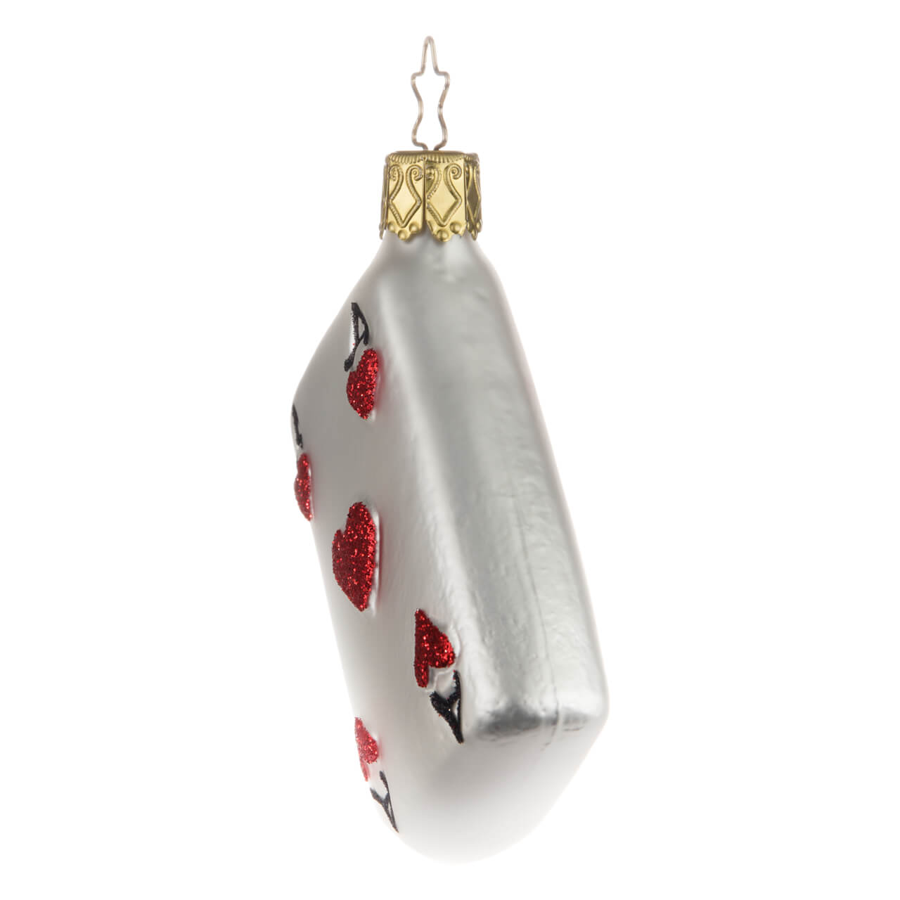Los hermanos Skat, los amigos de Doppelkopf e incluso los amantes de los cuentos (estrictamente hablando, el as forma parte de la serie Alicia en el País de las Maravillas) estarán encantados con el motivo, pero también con la maestría artesanal con la que se ha fabricado la figurita de cristal. Soplada en vidrio fino, pintada de blanco mate, la parte trasera está decorada con una línea de purpurina roja en forma de rectángulo, la delantera con cinco corazones brillantes y cuatro grandes letras A negras en cada esquina. ¡Tu árbol puede presumir de verdad!