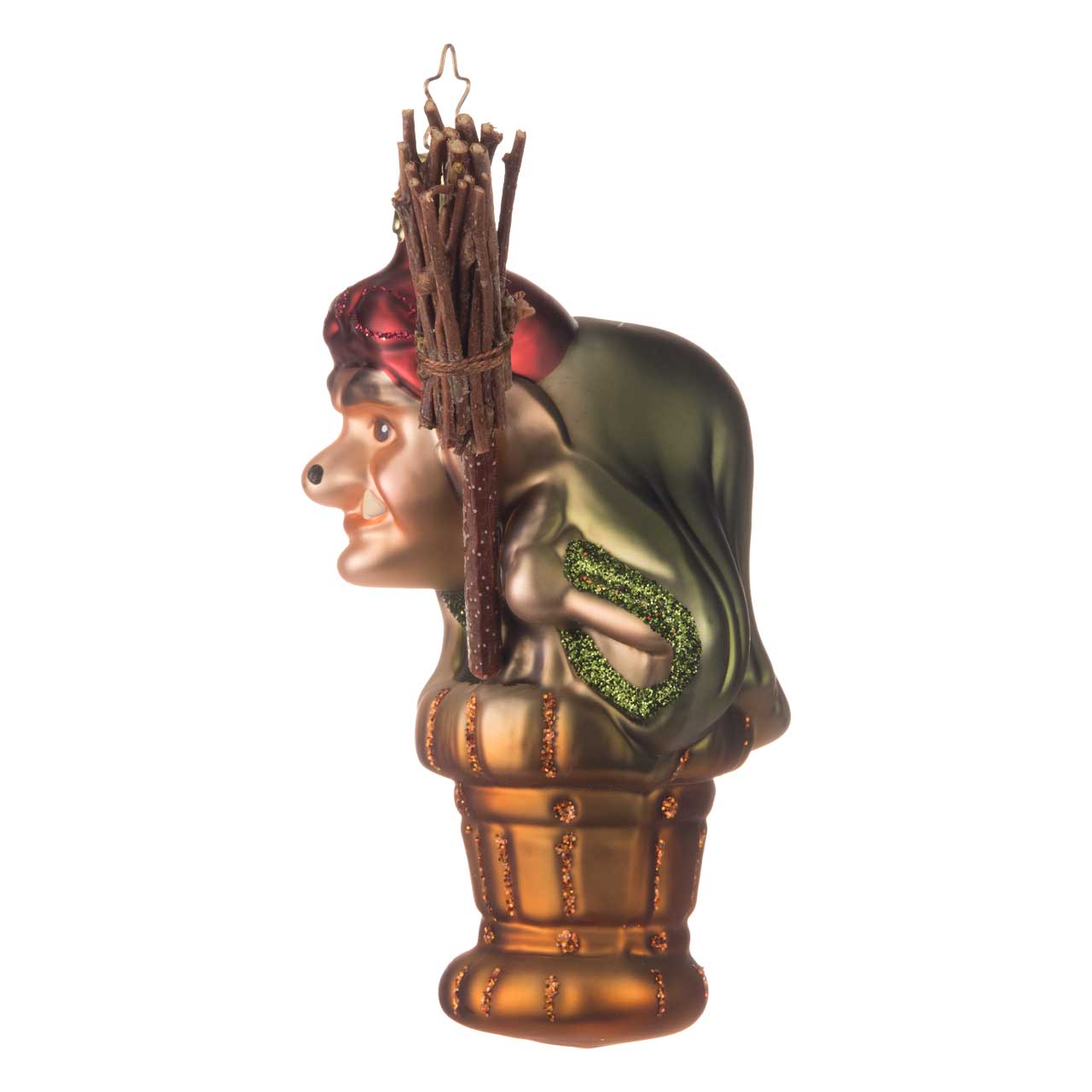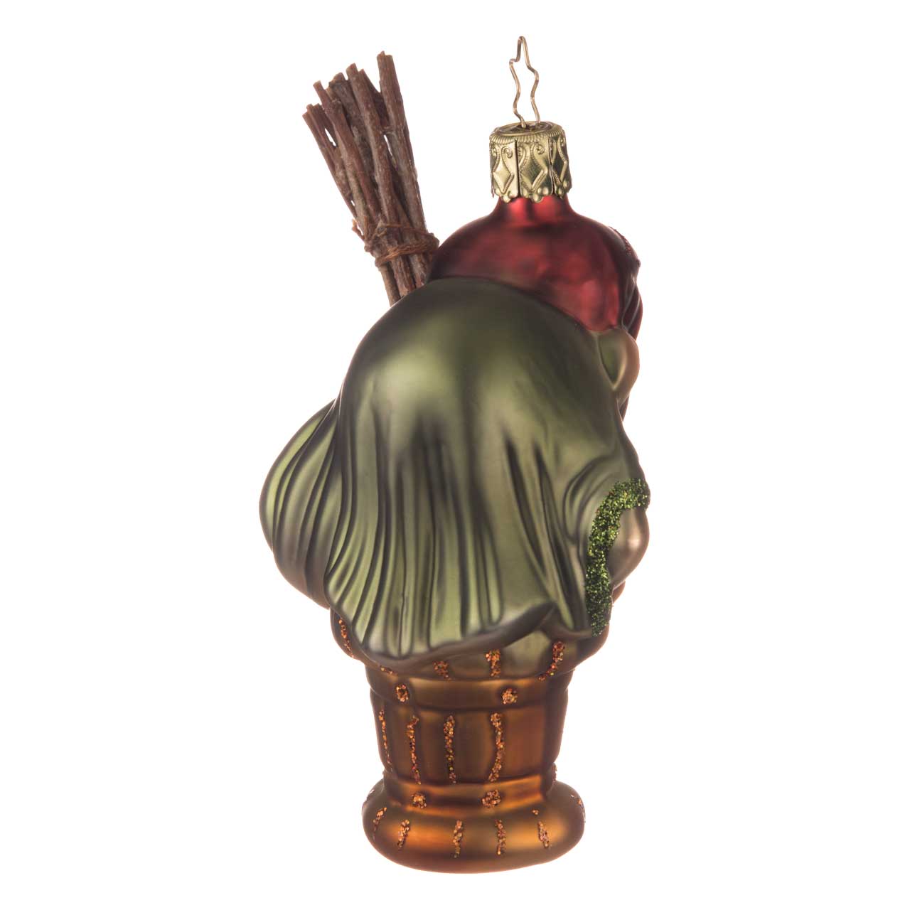 La figura muestra a una bruja con un rostro inconfundible, tocado rojo y brillantes detalles verdes en su túnica. Se apoya en una cesta marrón, que sujeta con ambos brazos, y sostiene en la mano una pequeña escoba hecha con ramitas de verdad. Los colores van desde los tonos marrones y verdes terrosos hasta los acentos brillantes de purpurina que acentúan el carácter misterioso del personaje.