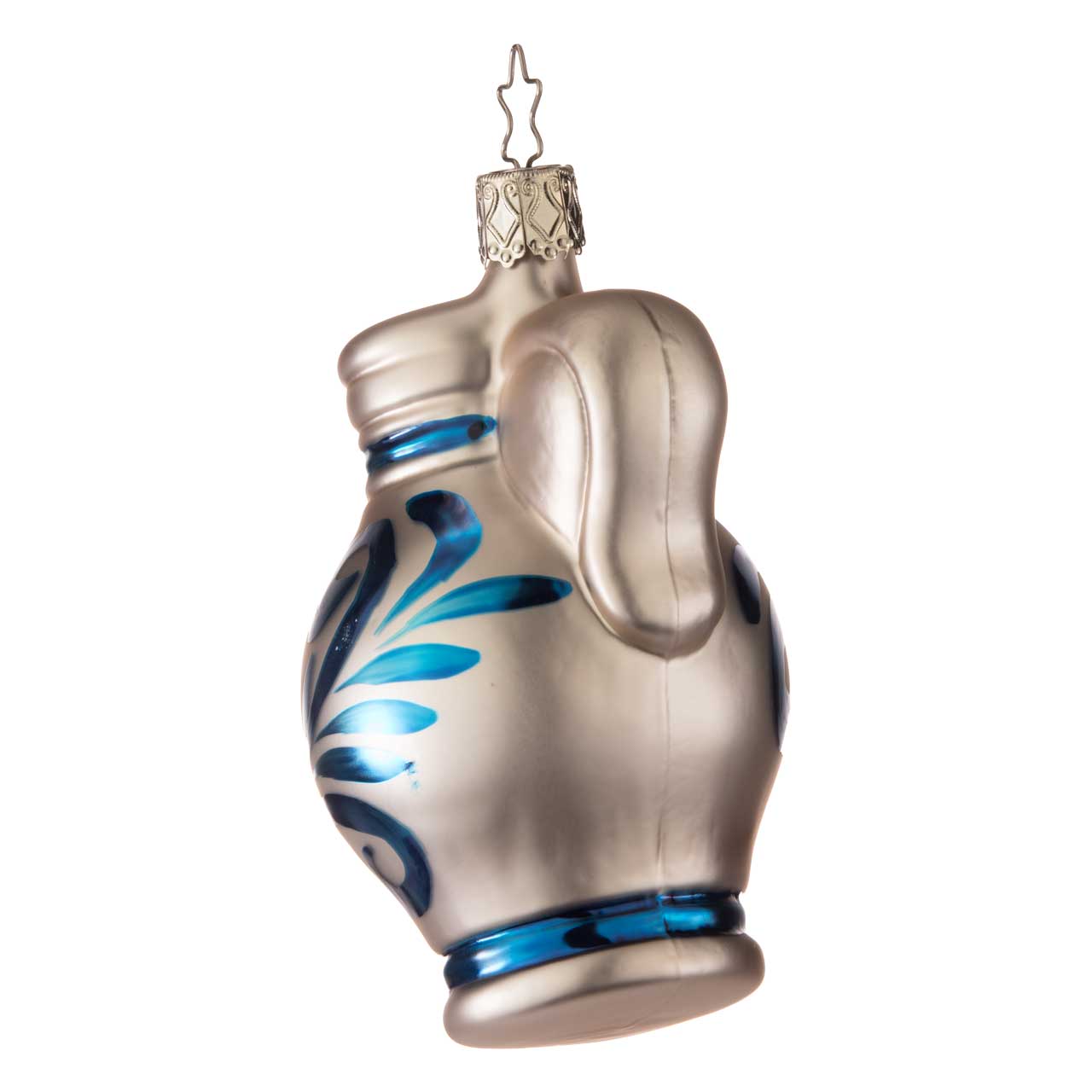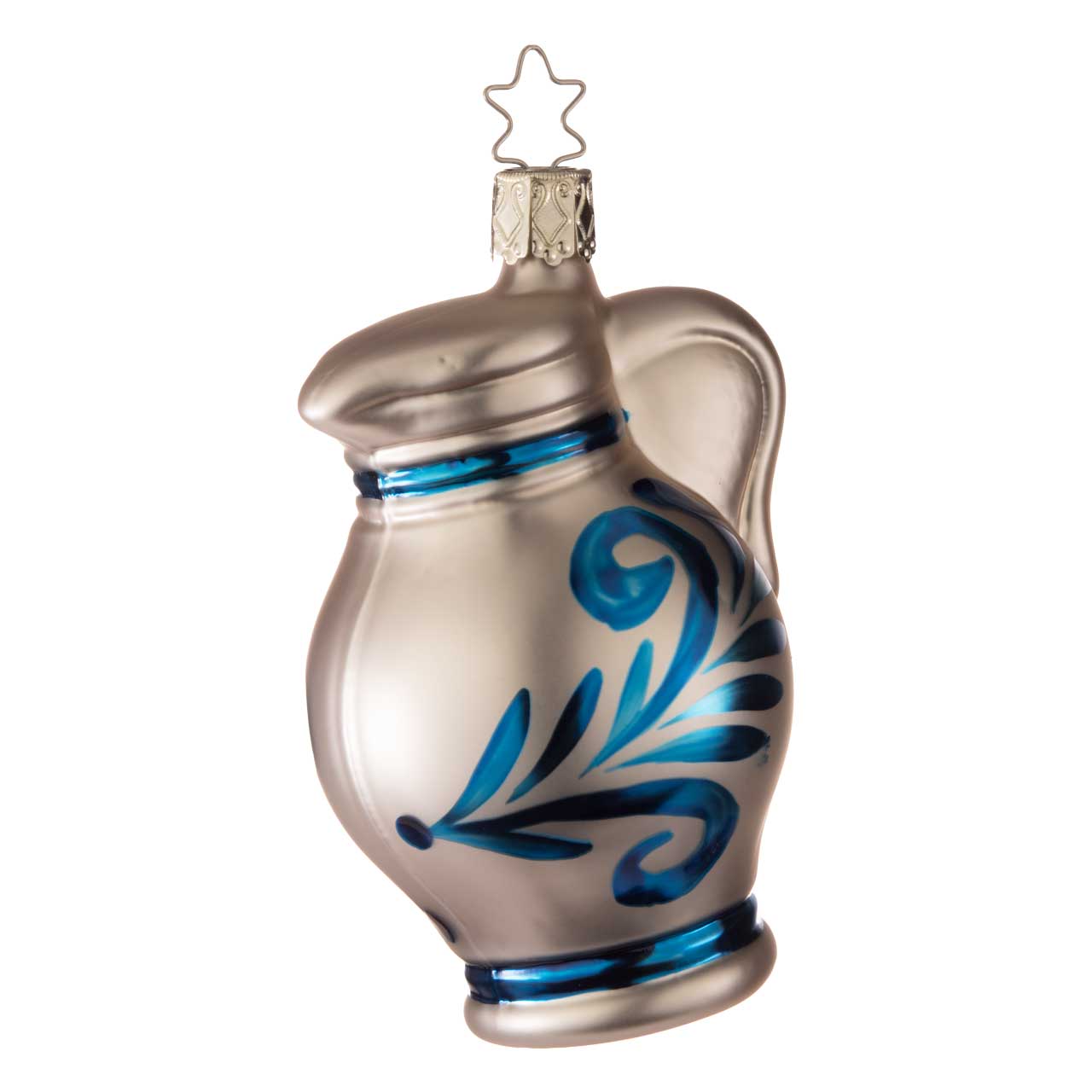 Esta figurita reproduce fielmente la forma característica del Bembel, con su asa curvada y su cuerpo bulboso. En gris mate y decorada con brillantes ornamentos azules, su aspecto es a la vez tradicional y elegante. La armoniosa combinación de colores y la llamativa forma de jarra hacen de esta bola un encantador centro de atención con un toque regional.