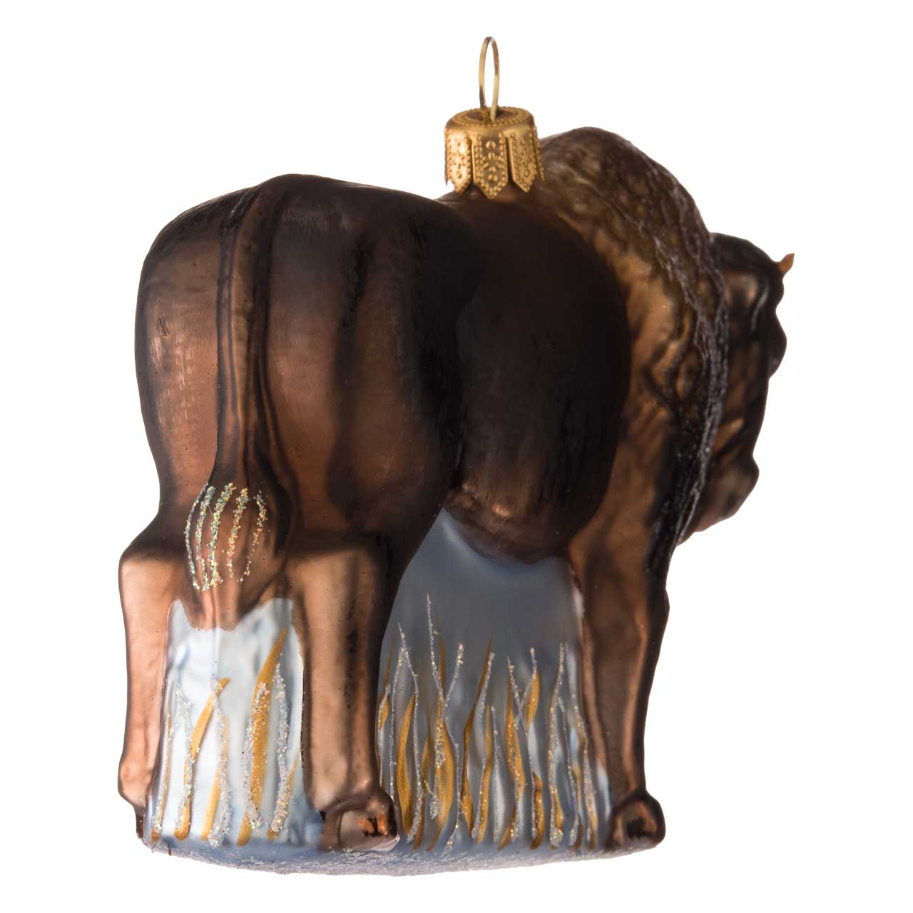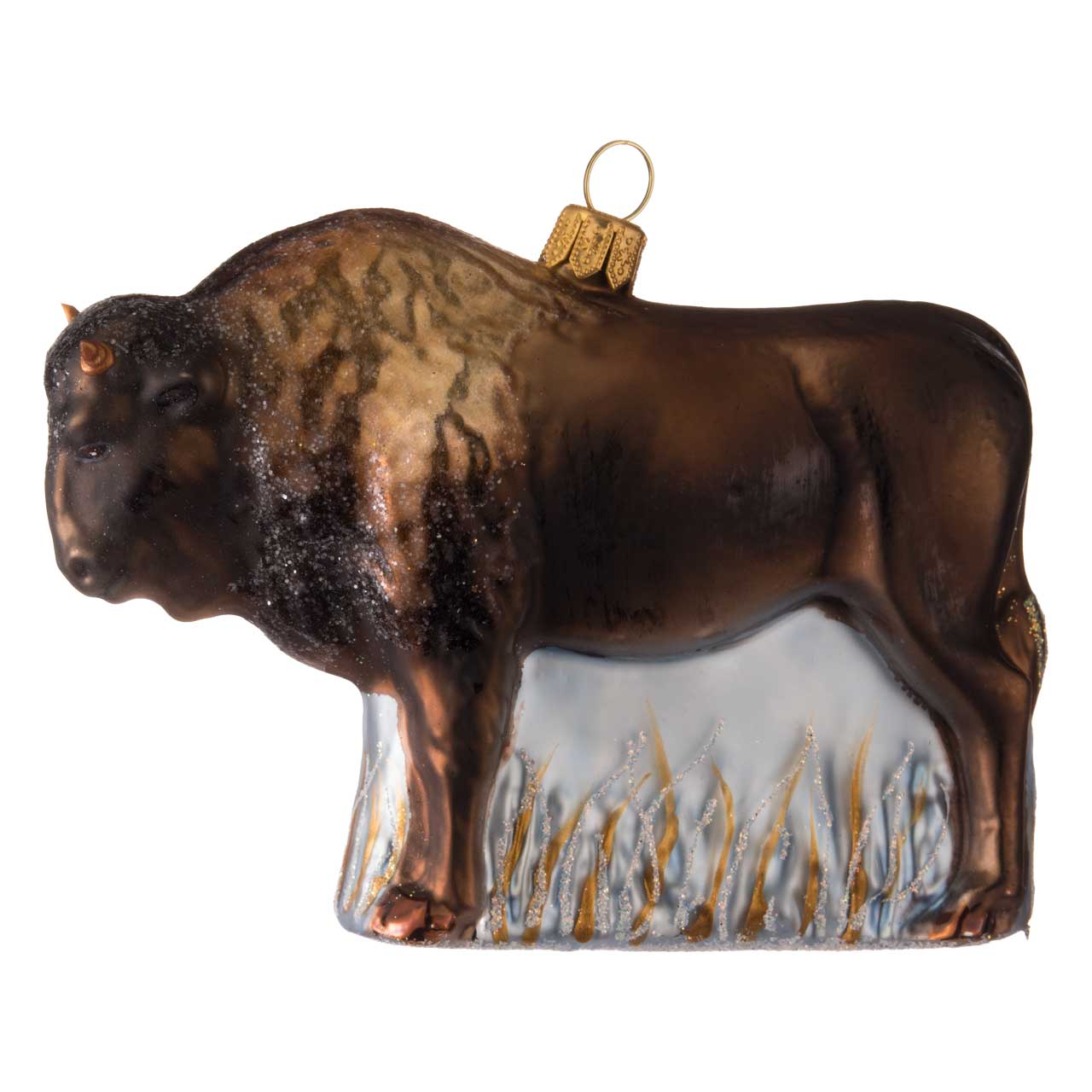 Esta detallada figura muestra al orgulloso bisonte en cálidos tonos marrones y negros con el pelaje ligeramente brillante. Los poderosos hombros y el desgreñado cuello están finamente modelados y tienen un toque de purpurina para resaltar la estructura del pelaje. El suave fondo gris y dorado recuerda a la hierba helada bajo la luz invernal