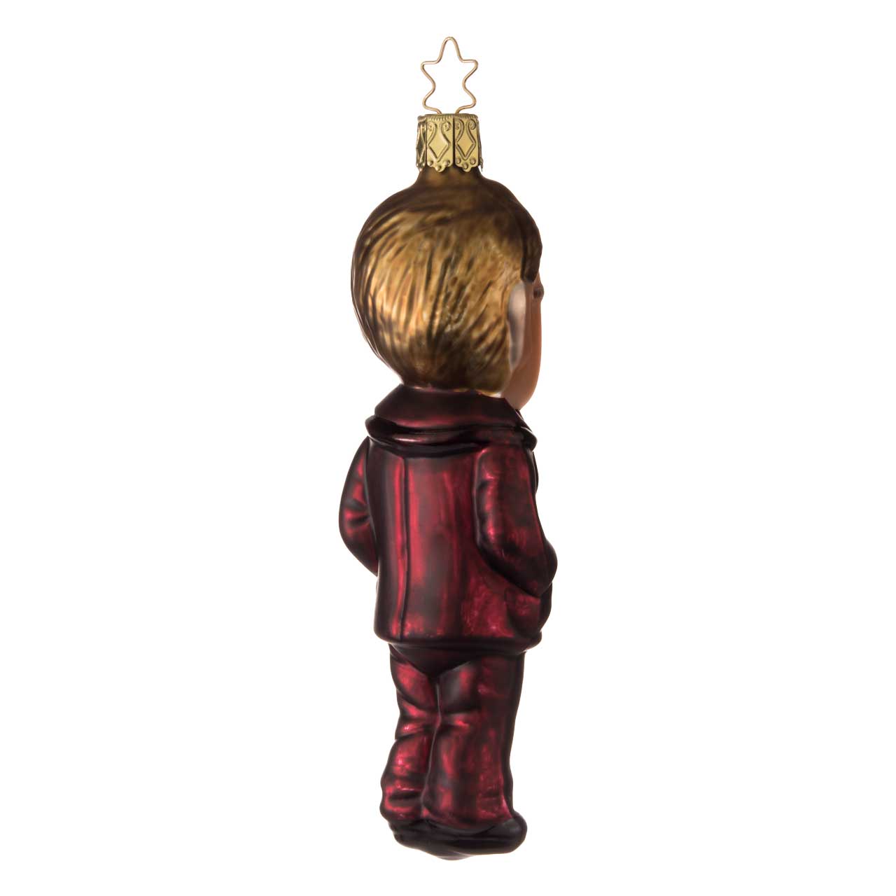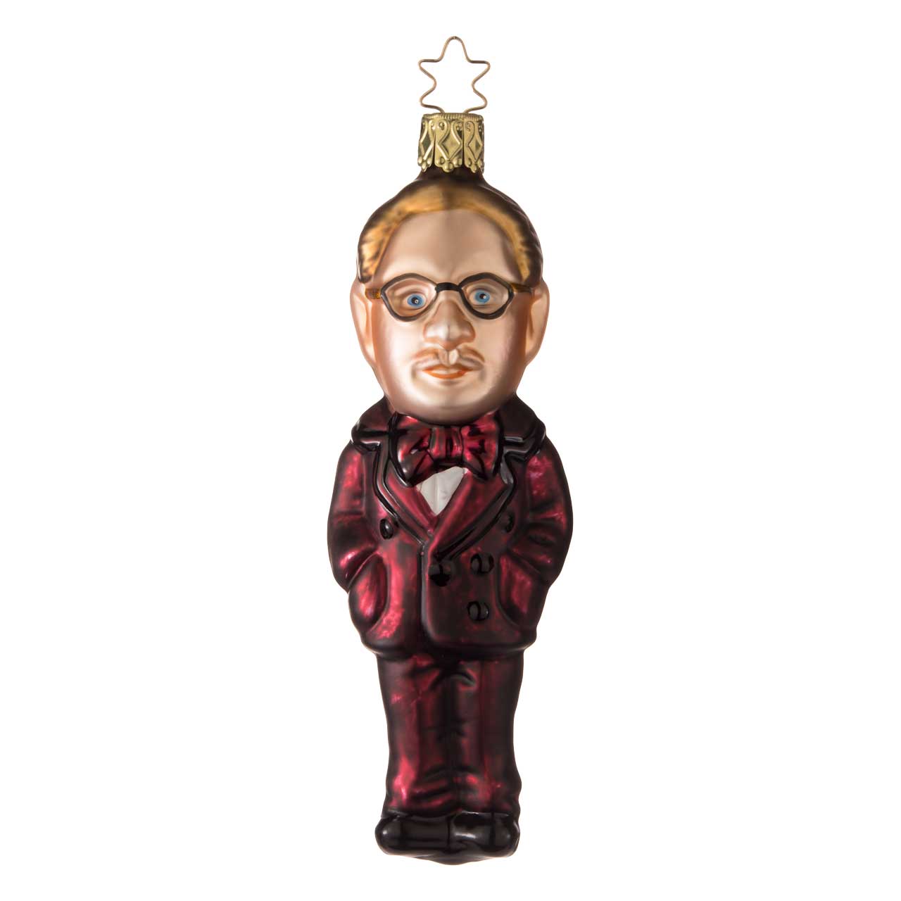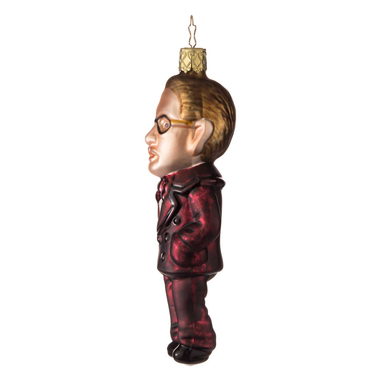 La figura es esbelta y alargada y muestra a un estilizado caballero con traje. La gama de colores está dominada por un rojo burdeos intenso y brillante para el traje, combinado con un cabello dorado, una tez clara y detalles negros como los zapatos y las gafas. El balón resulta elegante, ligeramente juguetón y destaca claramente gracias a su forma figurativa.