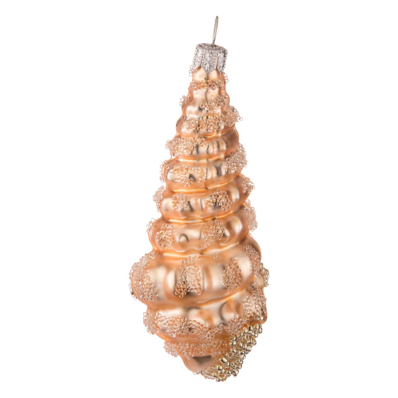 Este ejemplar tiene una concha esbelta y puntiaguda con una clara estructura en espiral. Brillos transparentes animan la estructura superficial del caracol. La boca está recubierta de purpurina dorada similar a la arena.