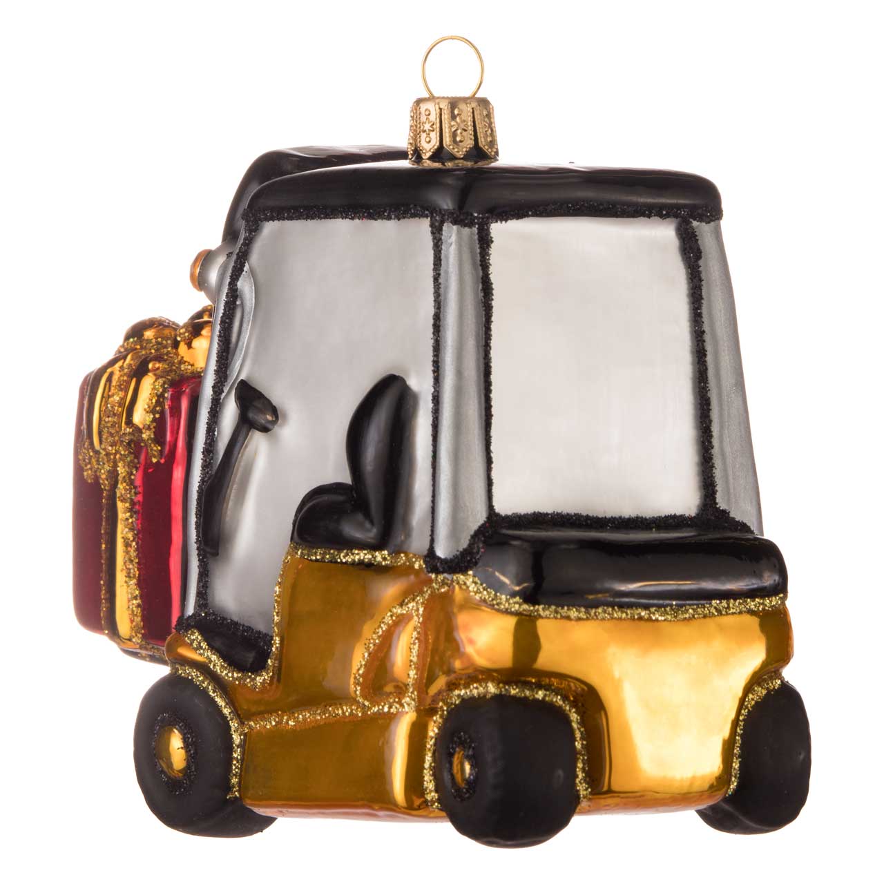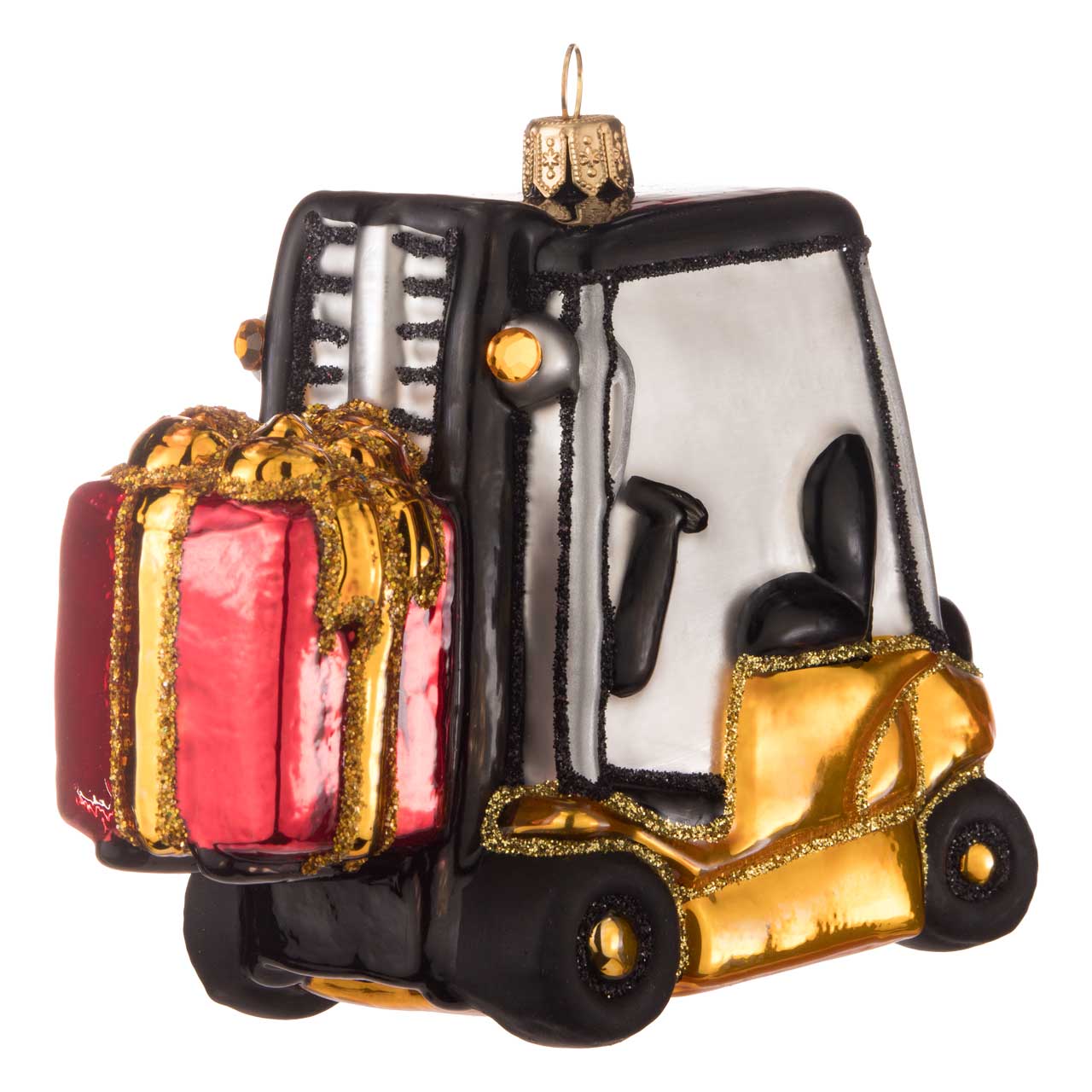 La carretilla elevadora con carrocería amarilla y ruedas, asiento y mecanismo de elevación negros hará sin duda su ronda por muchos centros logísticos con esta combinación de colores. Sin embargo, faltará el ribete brillante que da cierto glamour a este vehículo. En la horquilla hay un gran regalo envuelto en rojo brillante. Una cinta amarilla con un borde brillante sujeta y adorna la parte superior del paquete con un lujoso lazo.
