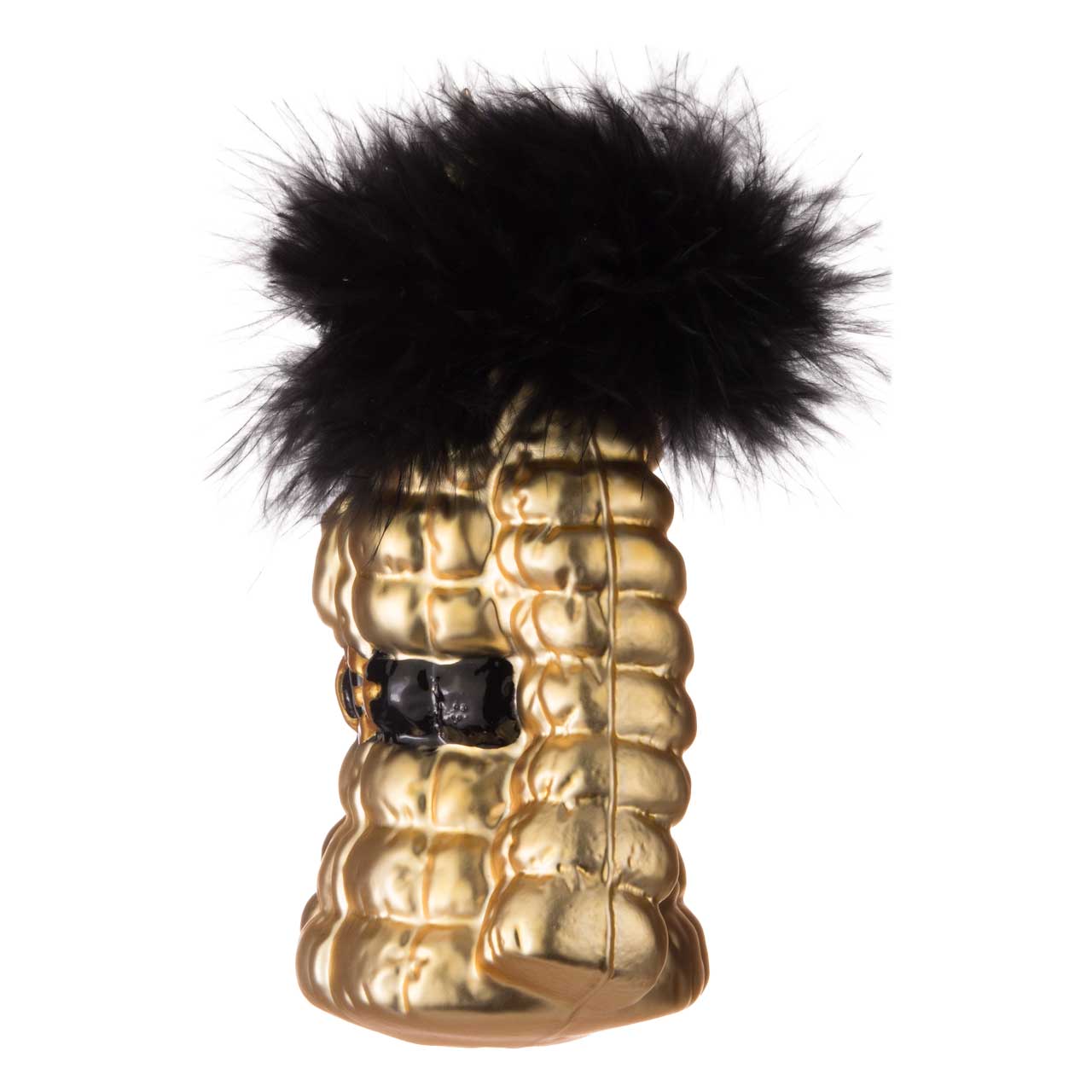 La figura muestra una detallada y brillante chaqueta acolchada dorada con un cinturón negro y un llamativo cuello de forro polar negro. La superficie texturizada acentúa el brillo metálico, mientras que las suaves plumas crean un emocionante contraste. Una extraordinaria pieza de diseño en dorado y negro con un lujoso encanto invernal.