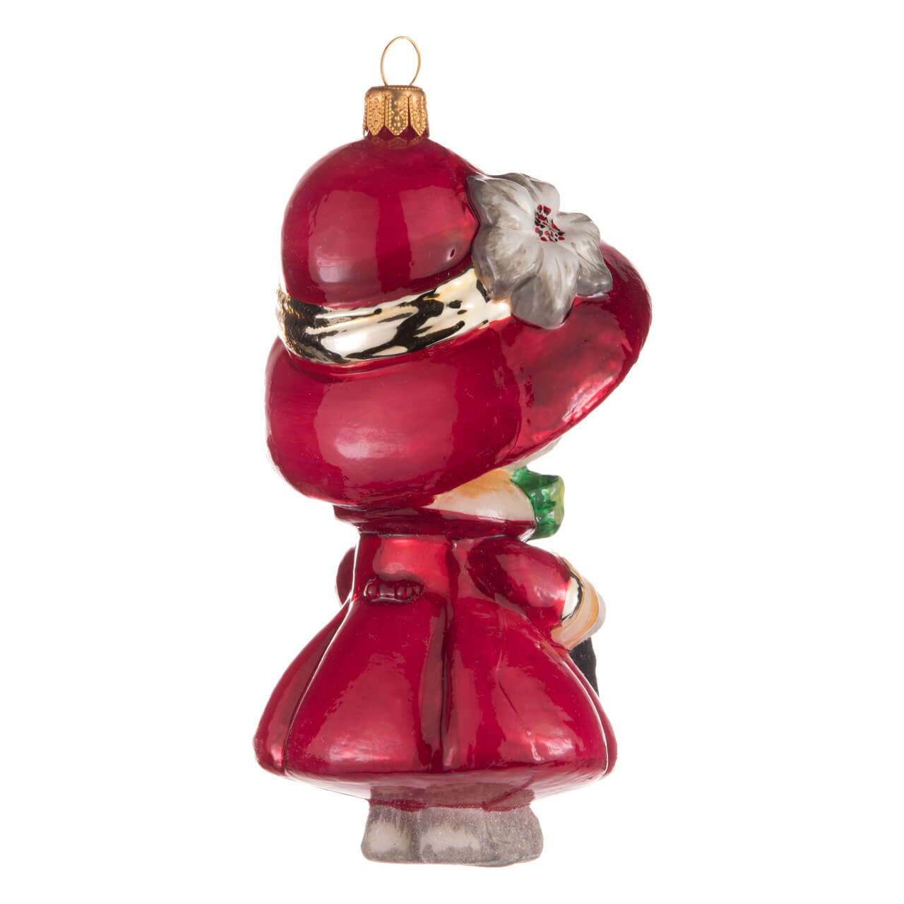 Como una joven dama: un vestido rojo con una amplia falda oscilante, cuello y puños color melocotón, un magnífico lazo XXL alrededor del cuello y un espléndido sombrero rojo en la cabeza con una flor gris y blanca y una cinta dorada que habría enorgullecido a las dos: Caperucita Roja o la Reina. Sí, definitivamente esta criatura sabe cómo vestirse.