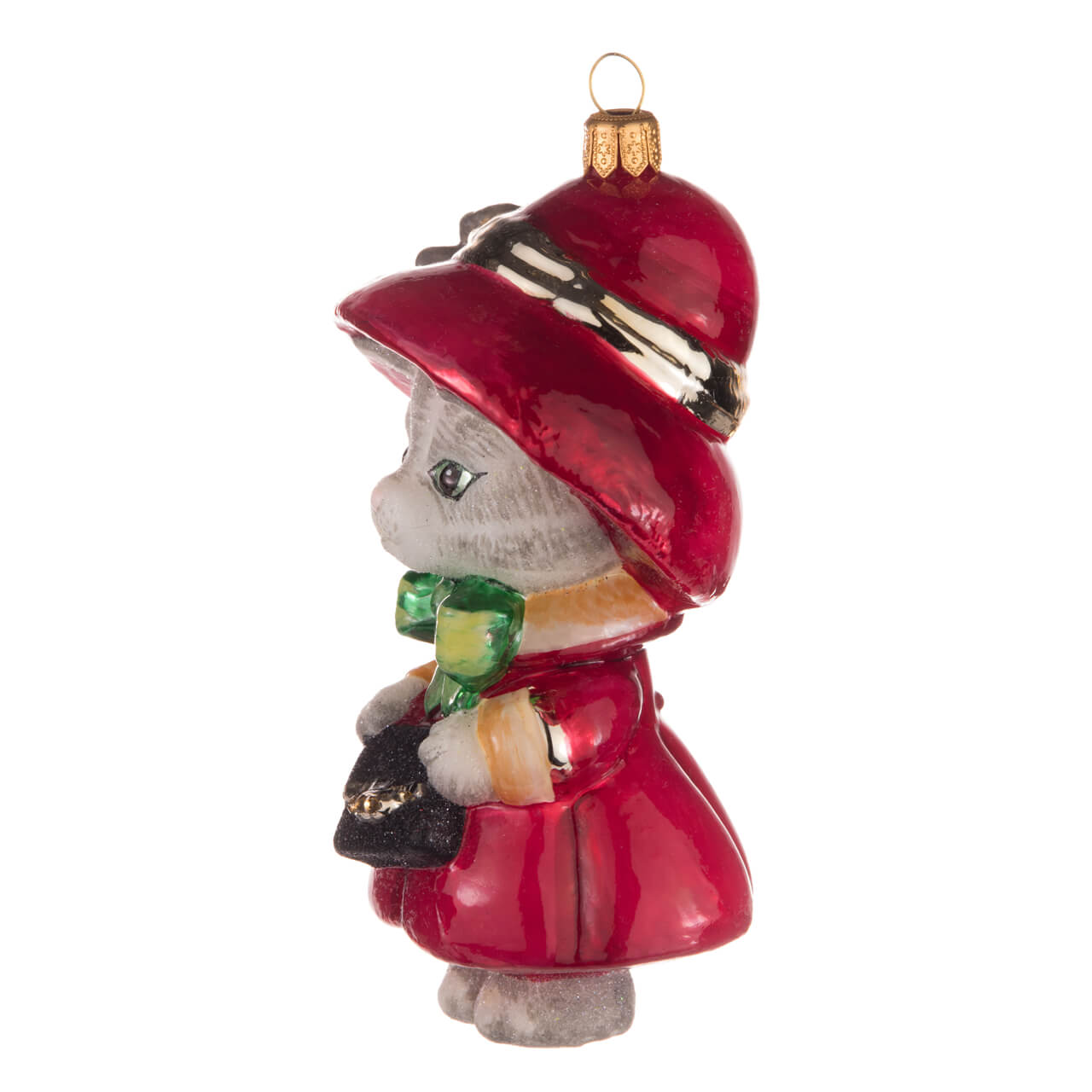 Sin embargo, cuando miras sus ojos verdes y almendrados con las características pupilas alargadas, enseguida queda claro que no es un humano, sino un gatito increíblemente mono que se ha disfrazado y nos derrite el corazón. Atigrada de color blanco grisáceo y espolvoreada con purpurina para darle el aspecto peludo perfecto, la gatita se mantiene erguida sobre sus patas traseras. El simpático hociquito brilla en rosa claro y el accesorio que lleva en las patas delanteras también llama la atención: un clásico bolso negro de señora que brilla con glamour con una solapa delantera enmarcada en plata brillante y un cierre decorado con tres brillantes dorados.