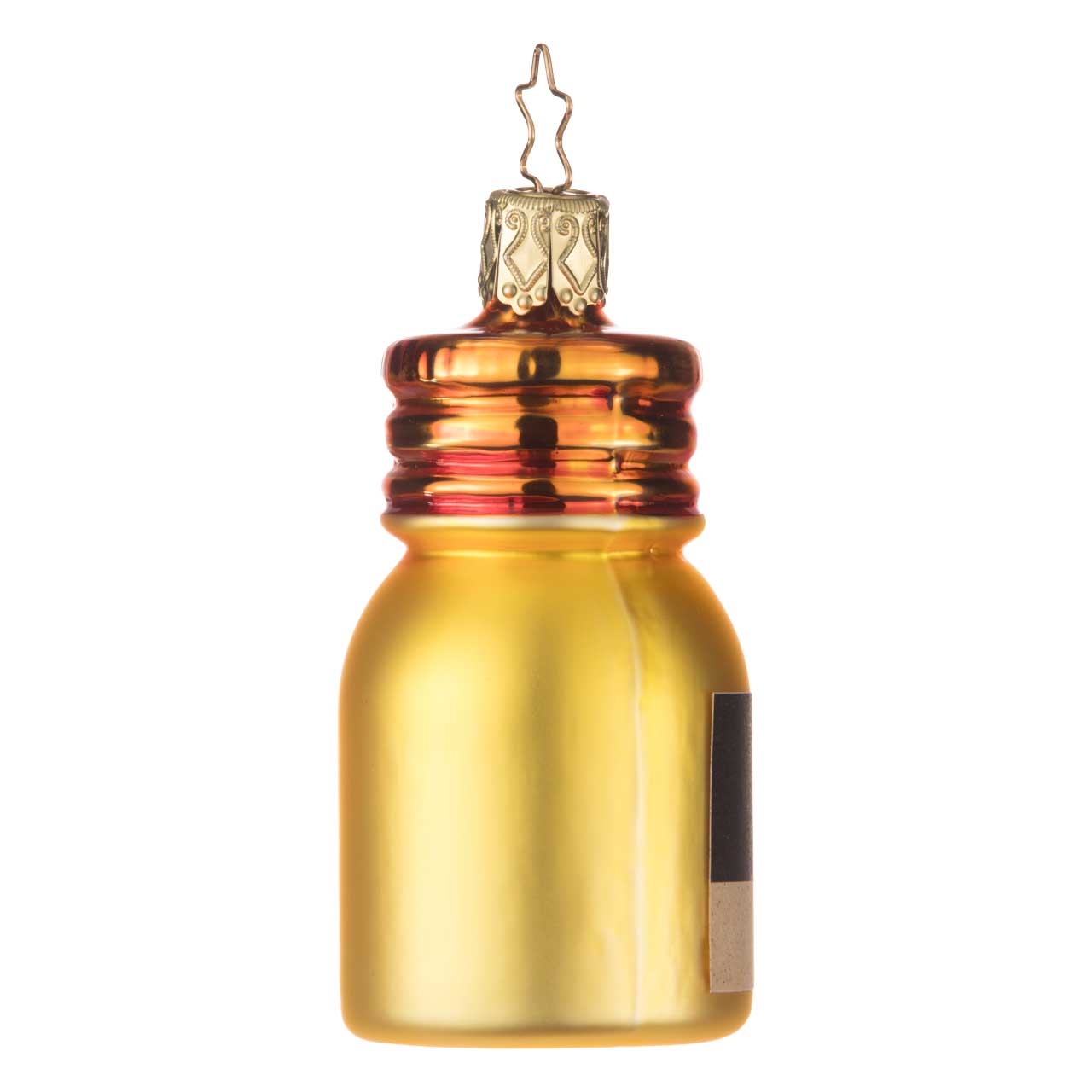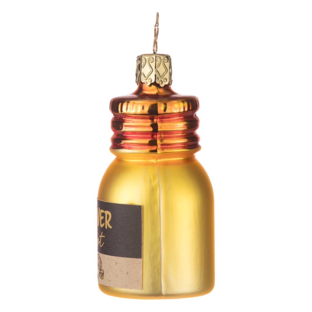 La pequeña botella es redondeada y compacta en la base, con un cuello escalonado en la parte superior. El cuerpo brilla en un intenso color dorado, mientras que la tapa resplandece con brillantes acentos rojizos. La parte delantera lleva la inscripción "Ginger Shot - Spicy" y una fina ilustración de una raíz de jengibre.