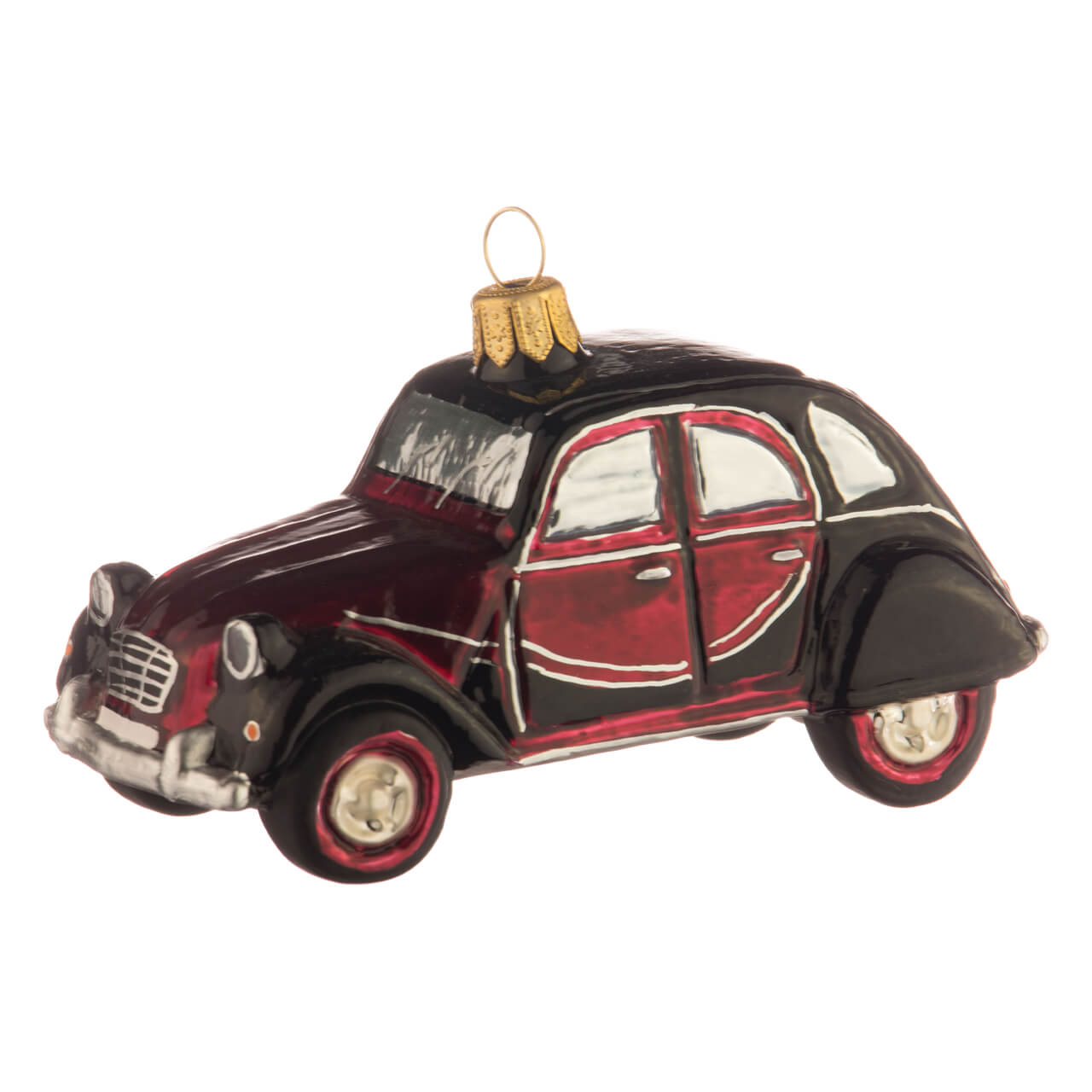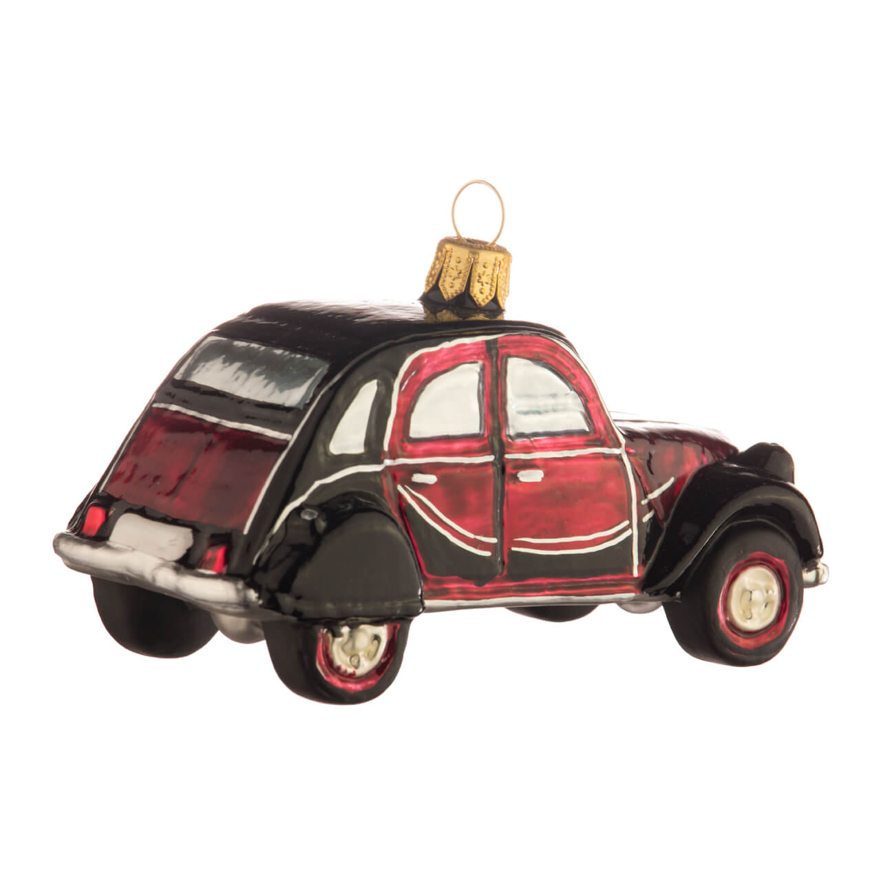 Este último no es reconocible en la versión de cristal para el árbol de Navidad, ya que los cristales plateados brillantes son demasiado reflectantes. Sin embargo, la figurita es todo un homenaje al modelo, que sigue siendo muy popular hoy en día y que reproduce con gran belleza en formato miniatura. La carrocería brilla en rojo oscuro y negro. Detalles como los limpiaparabrisas, los faros, la rejilla del radiador y los contornos curvados de las puertas se han aplicado con una fina pincelada plateada. Y los bajos de la carrocería también se han diseñado con un estilo purista: un acabado de pintura plateada mate también hace que el vehículo se vea bien desde abajo sin distraer la atención del vehículo real.