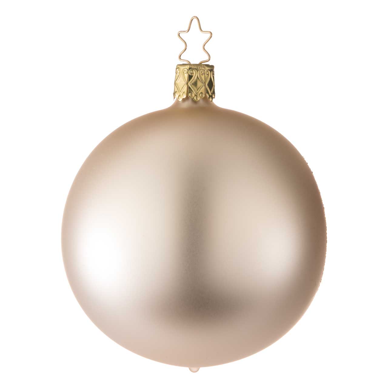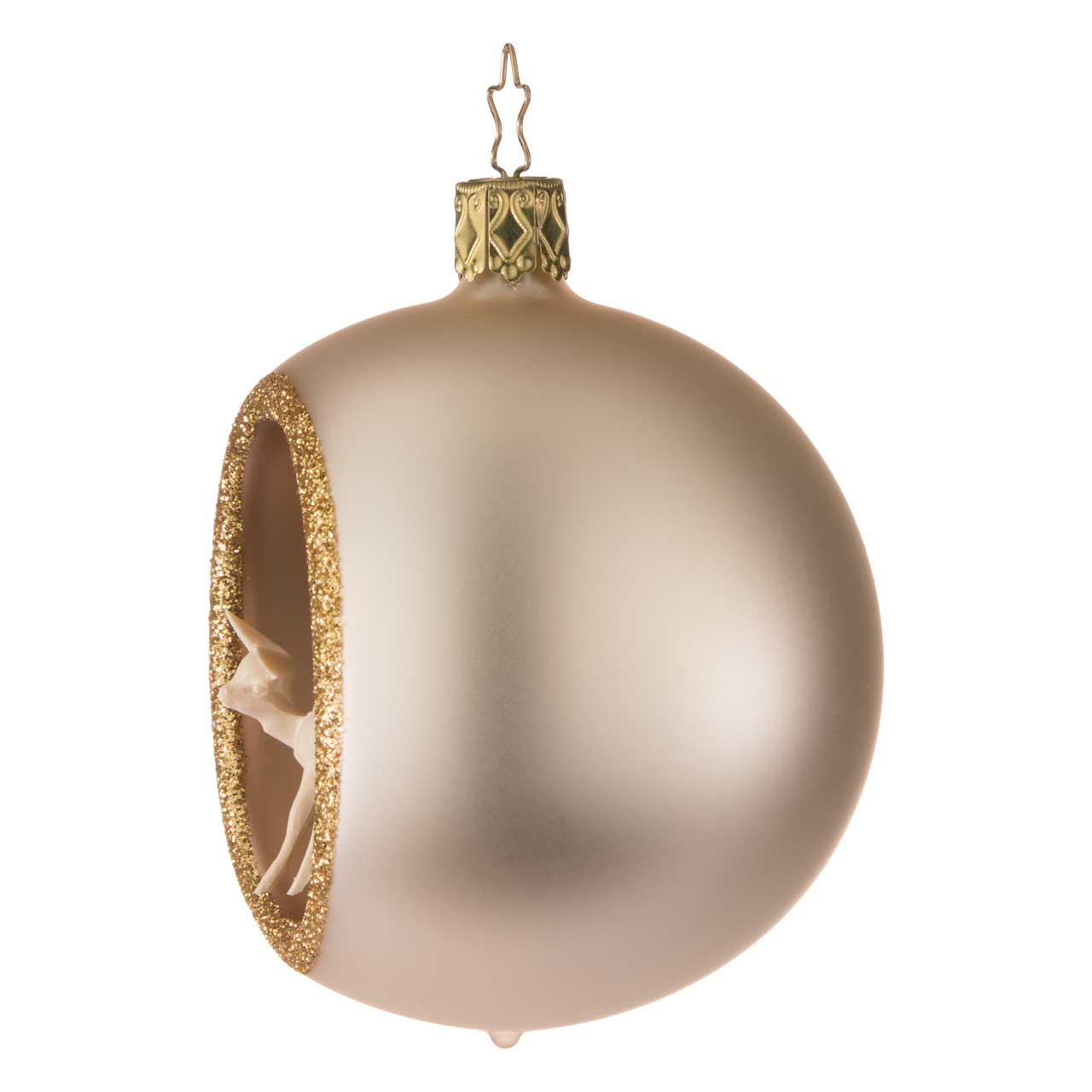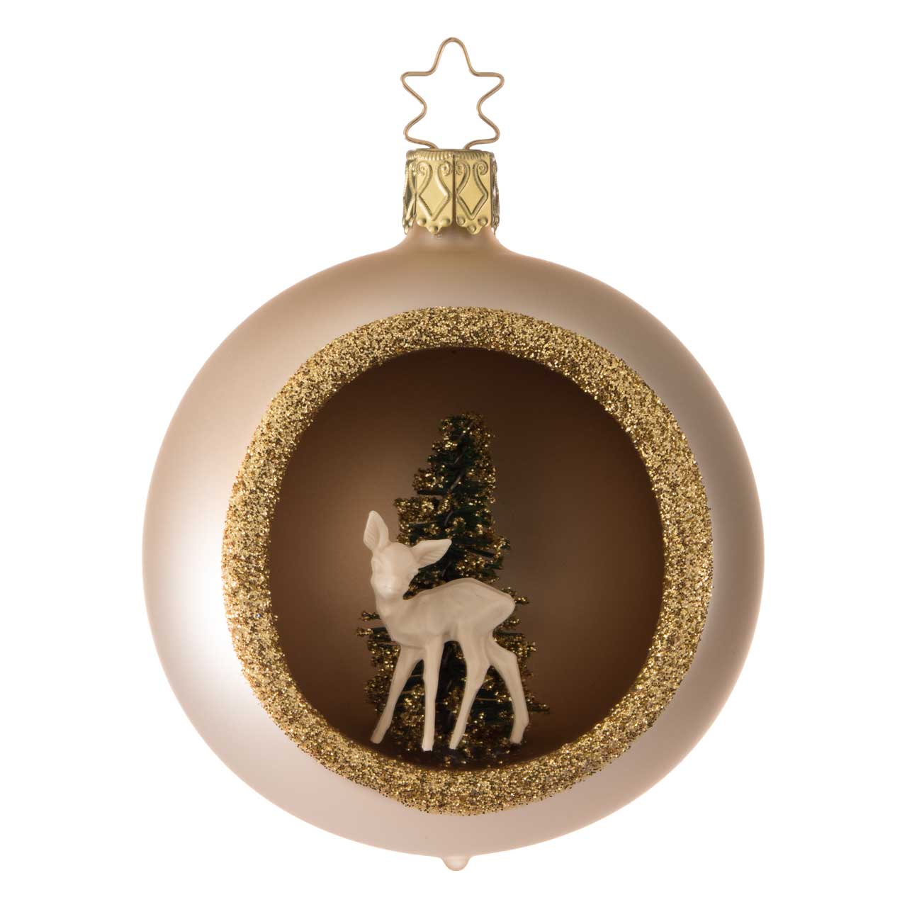 La esfera es de forma redonda clásica y está diseñada en un sofisticado color champán mate. Una abertura lateral con un reluciente borde dorado permite ver la detallada escena del interior: un delicado abeto de color oscuro y un delicado ciervo de color claro. La figurita tiene un aspecto elegante, tranquilo y de gran calidad: un pequeño y atmosférico panorama invernal en armoniosos tonos naturales y dorados.