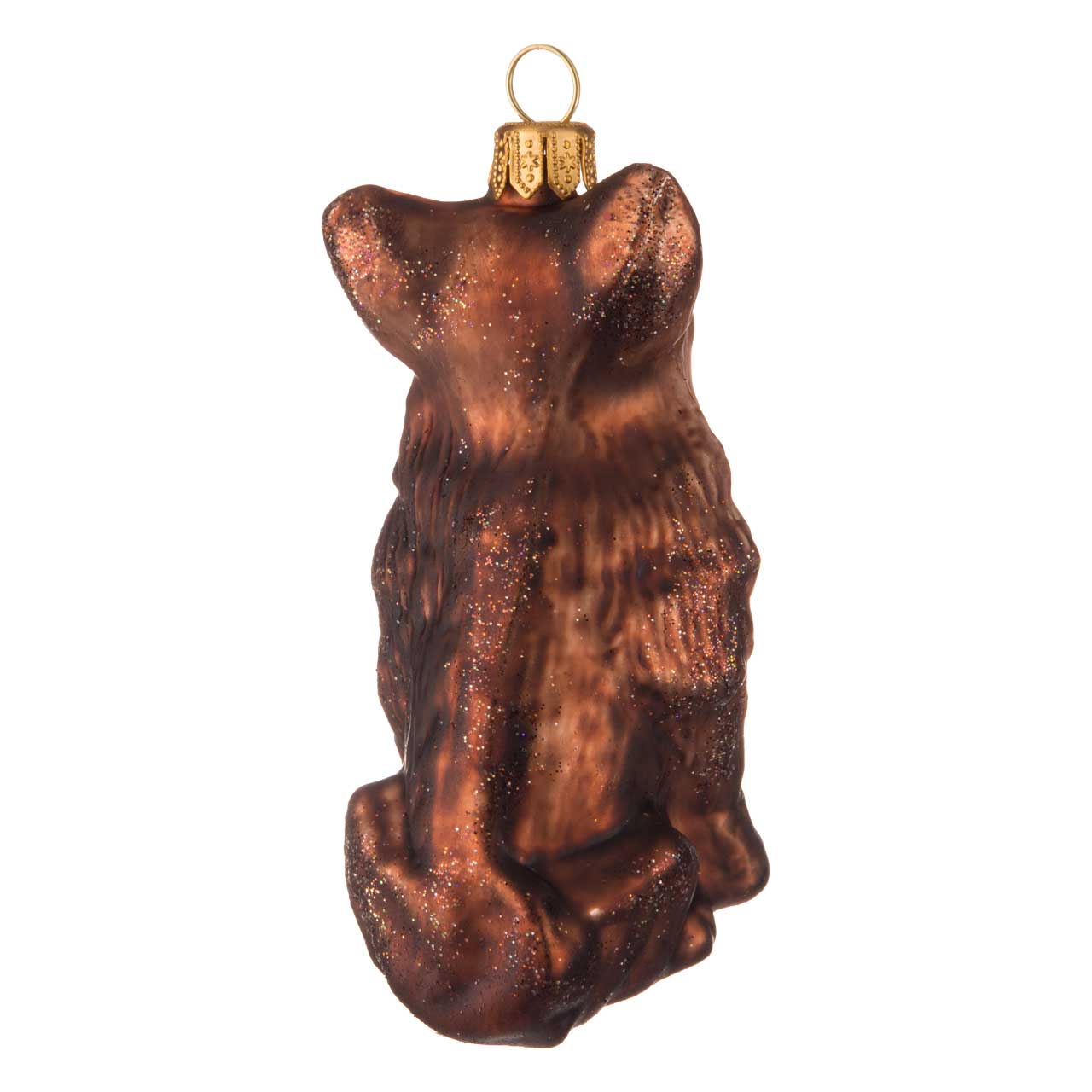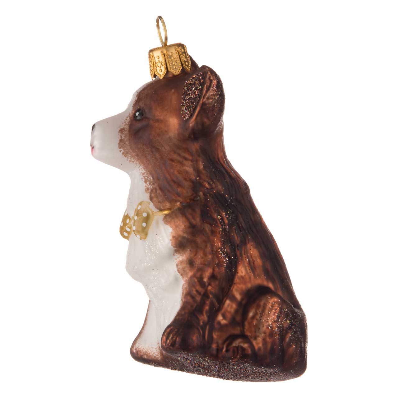 El corgi se queda quieto y su pelaje es fácilmente reconocible. El vientre y el hocico son blancos. El lomo es de color marrón oscuro. En el pecho lleva una mosca dorada con puntos blancos.