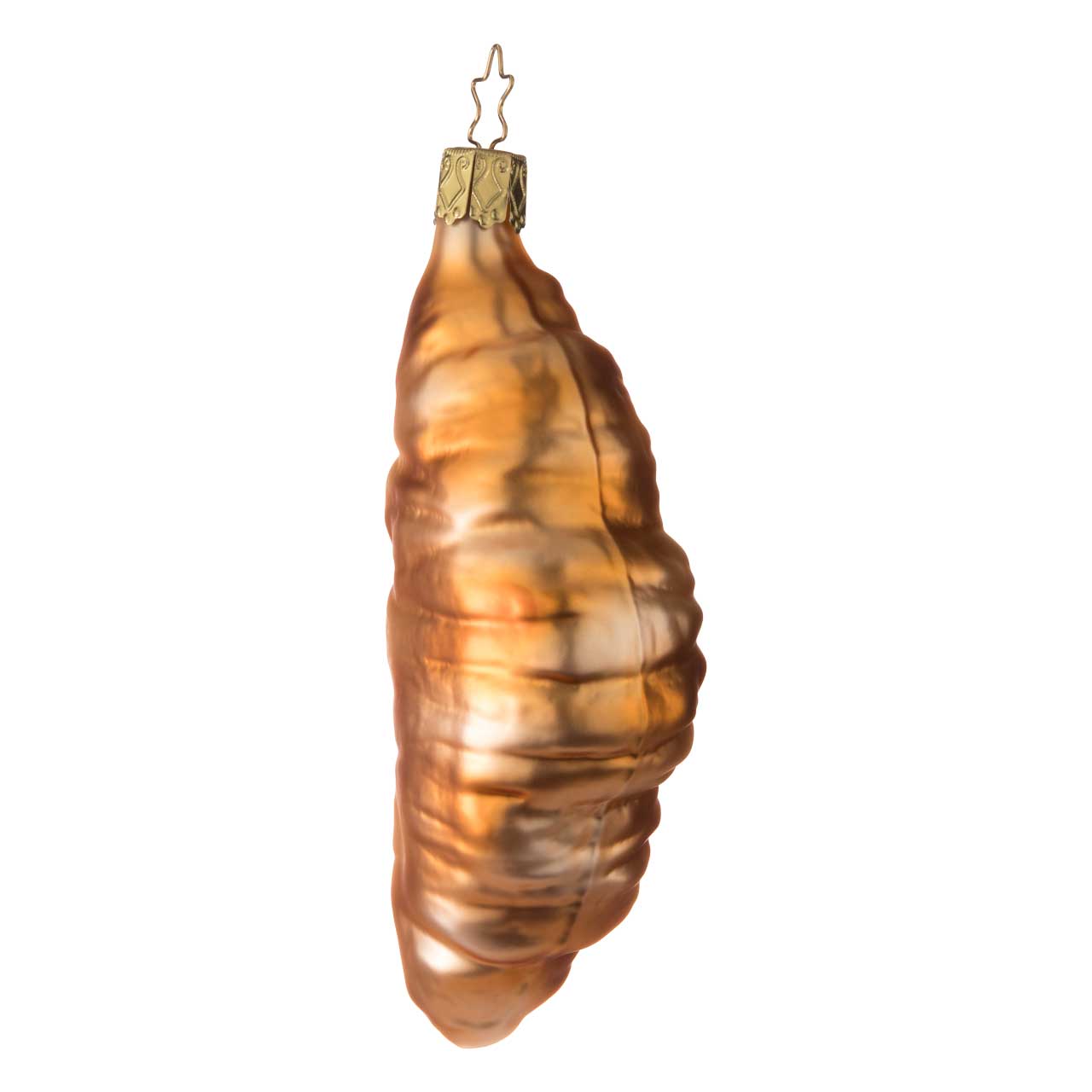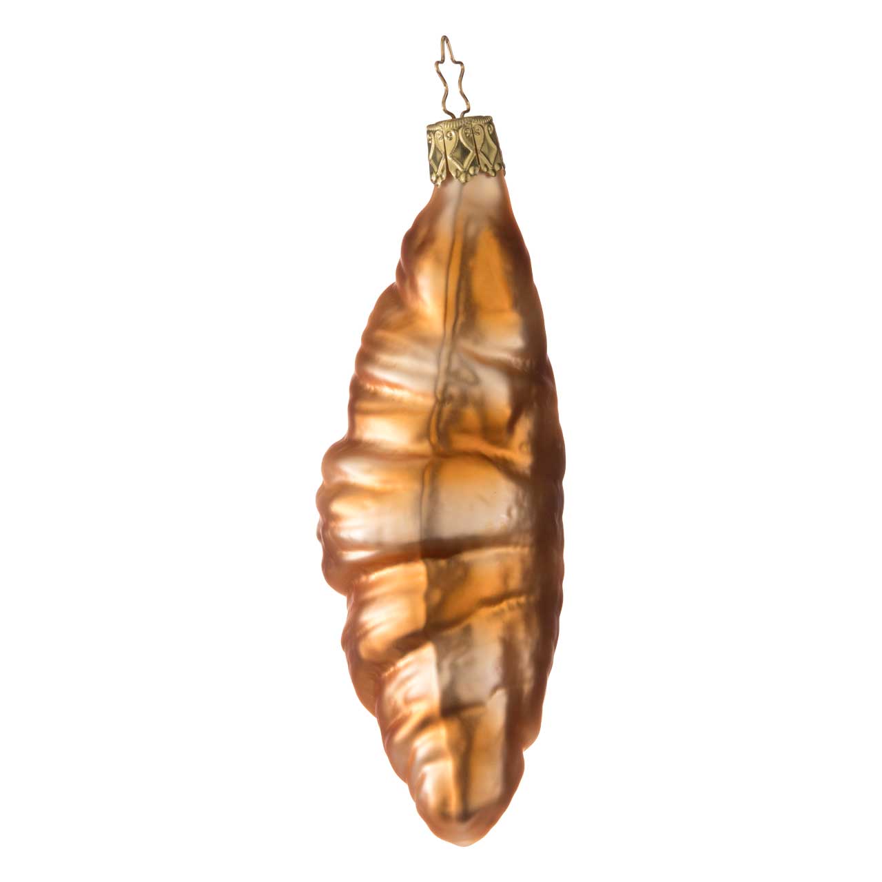 La figurita tiene la forma de un croissant alargado y retorcido, e impresiona por su cálido color marrón dorado con matices brillantes. La superficie tiene un efecto ligeramente texturizado y recuerda al típico aspecto de hojaldre, mientras que el brillo crea un aspecto sofisticado.