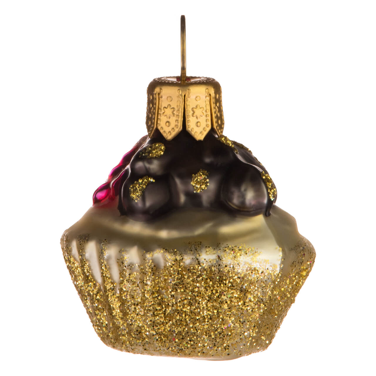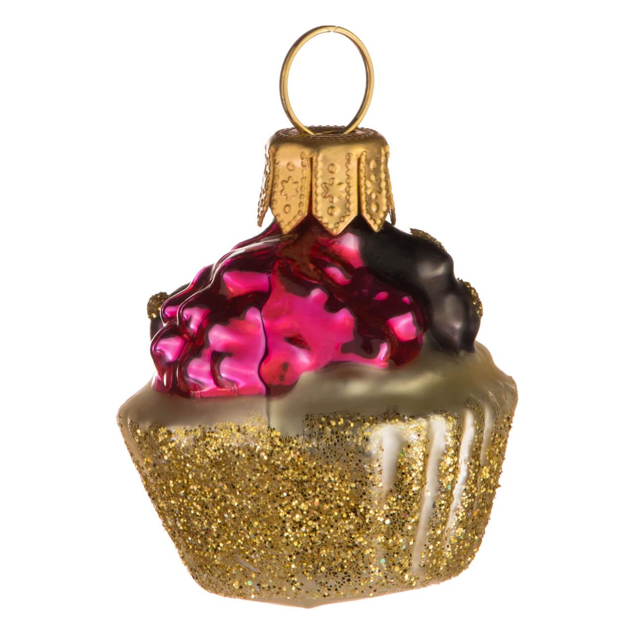 La típica forma dentada de magdalena brilla con purpurina dorada. El glaseado mate brilla en color champán. Encima brillan dos bayas de color rosa y gris antracita, cuyos arándanos también se han salpicado con purpurina dorada.