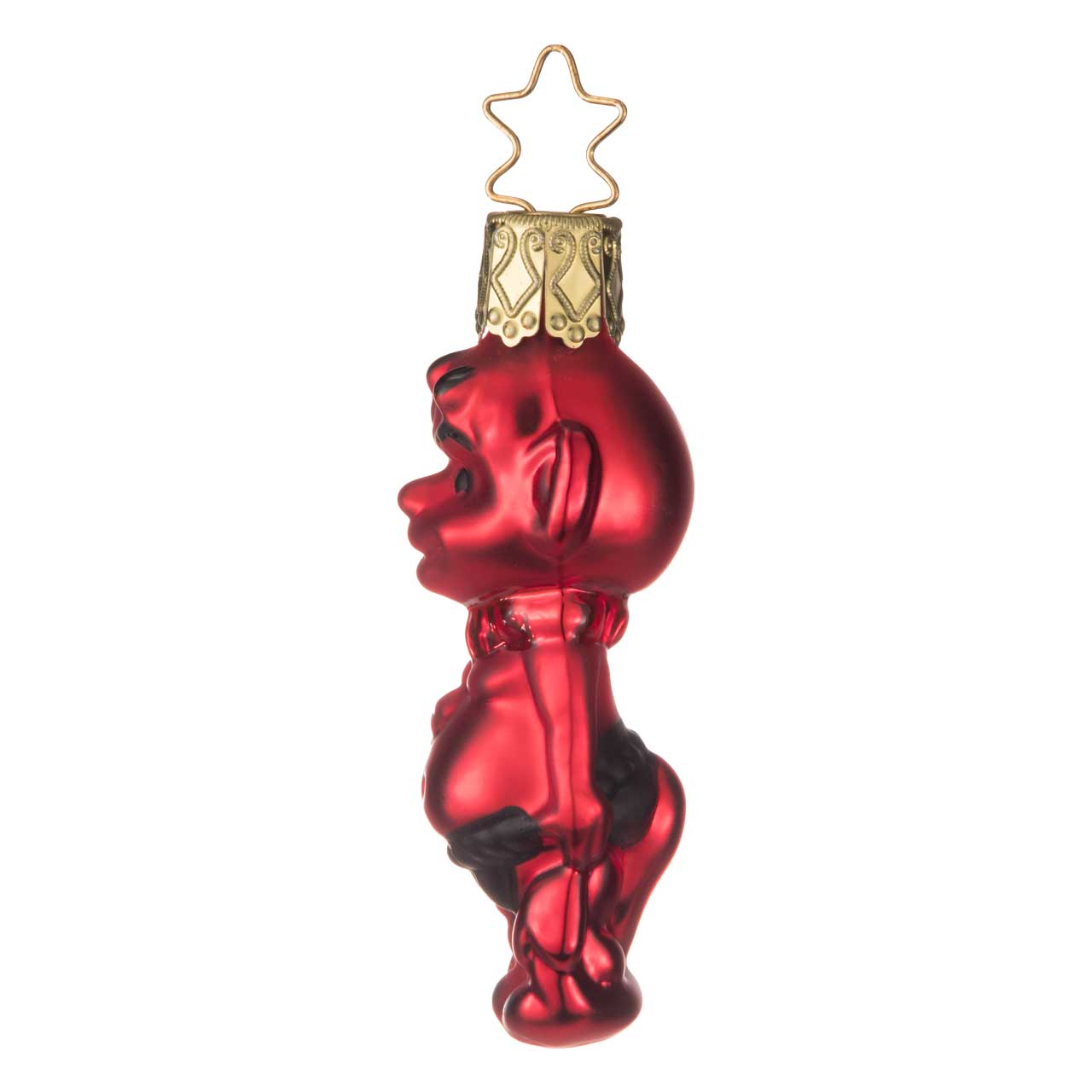 La figurita muestra un diablillo brillante de color rojo vivo con detalles negros en los pantalones y el cuello. Su forma redondeada con cabeza acentuada, pequeña barriga y amplia sonrisa le confiere un carácter juguetón, casi infantil. Una pieza llamativa que capta inmediatamente la atención por su fuerte contraste de colores.