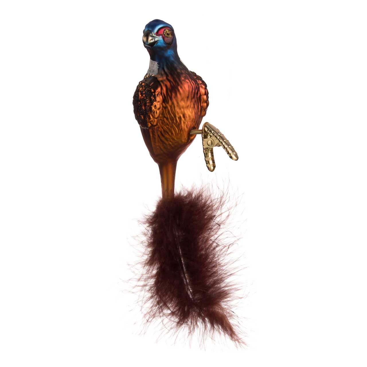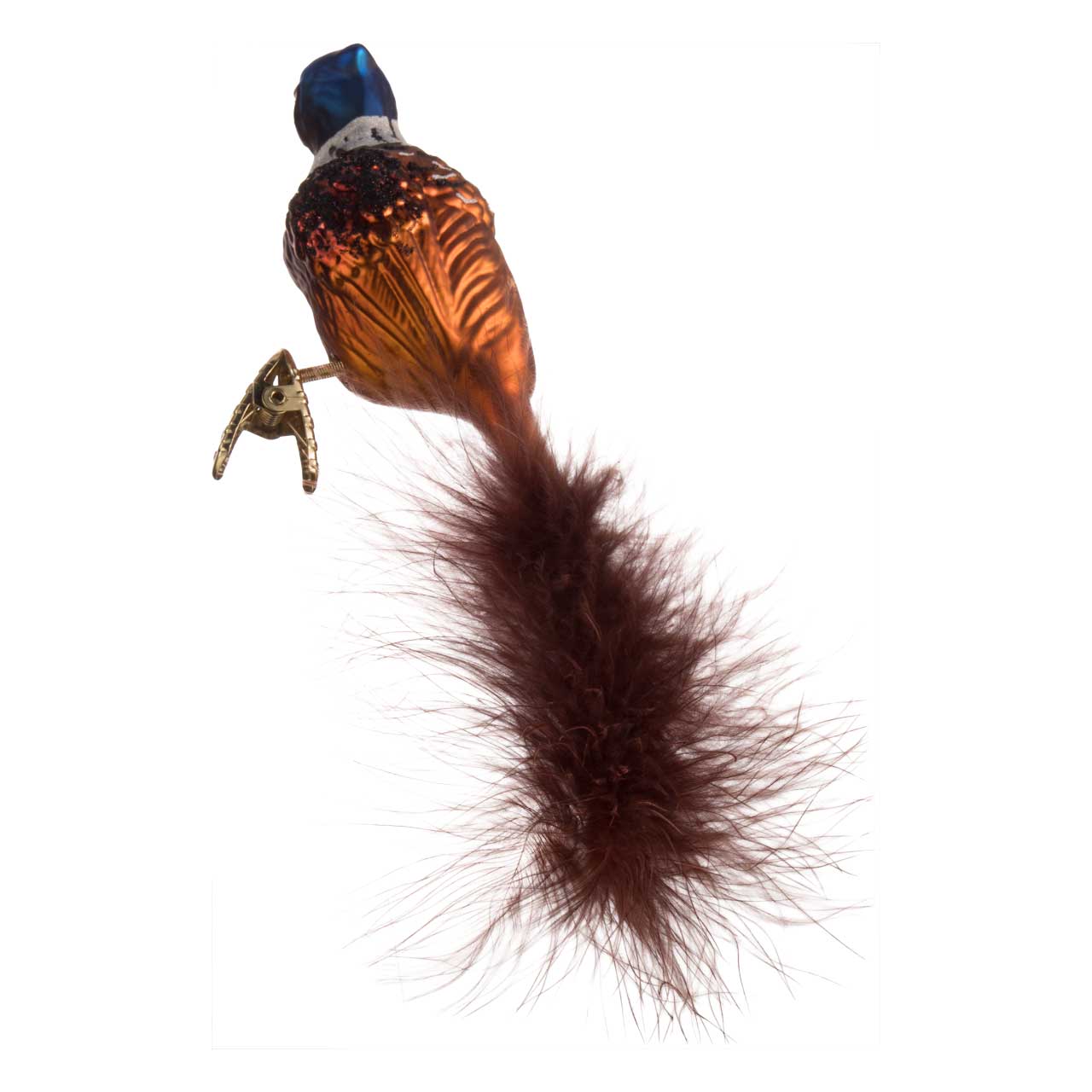 Este ejemplar para el árbol de Navidad no es una excepción. Brilla elegantemente con el plumaje azul de la cabeza y los característicos ojos de color rojo sobre un clip dorado. Una cresta blanquecina brillante en el cuello forma la transición a la grupa marrón claro. Polvo de purpurina marrón oscuro marca las alas a derecha e izquierda. Varias plumas reales, unidas al pájaro de cristal, forman la cola del ornamentado animal.