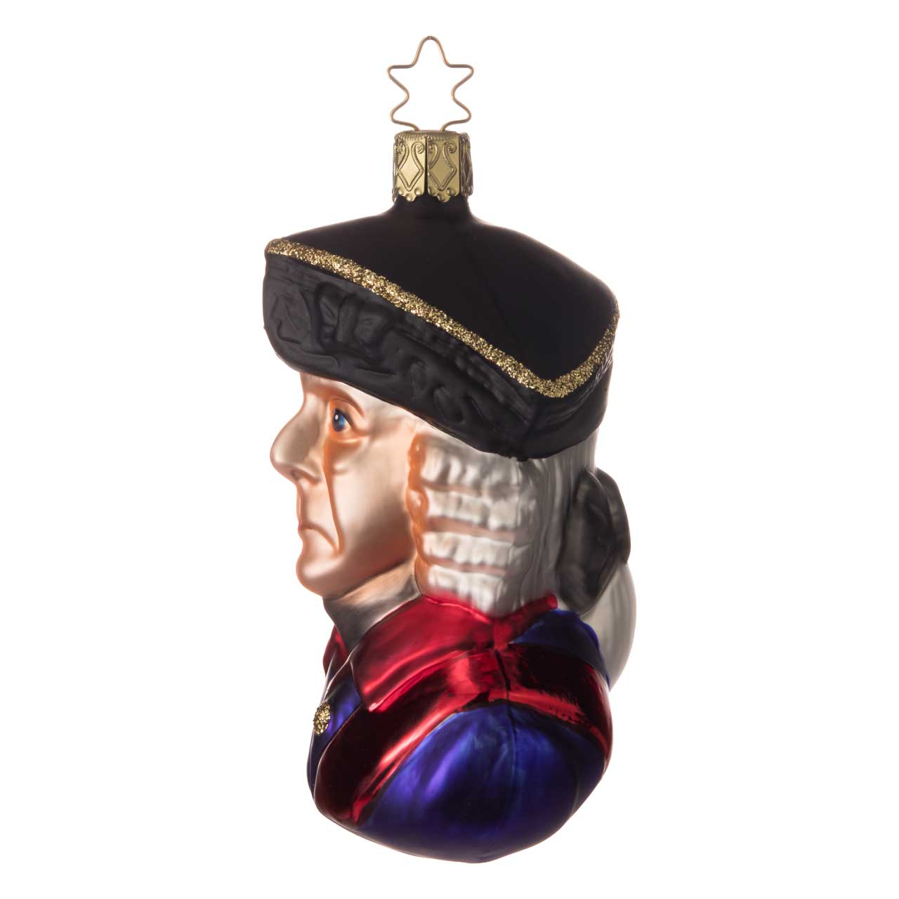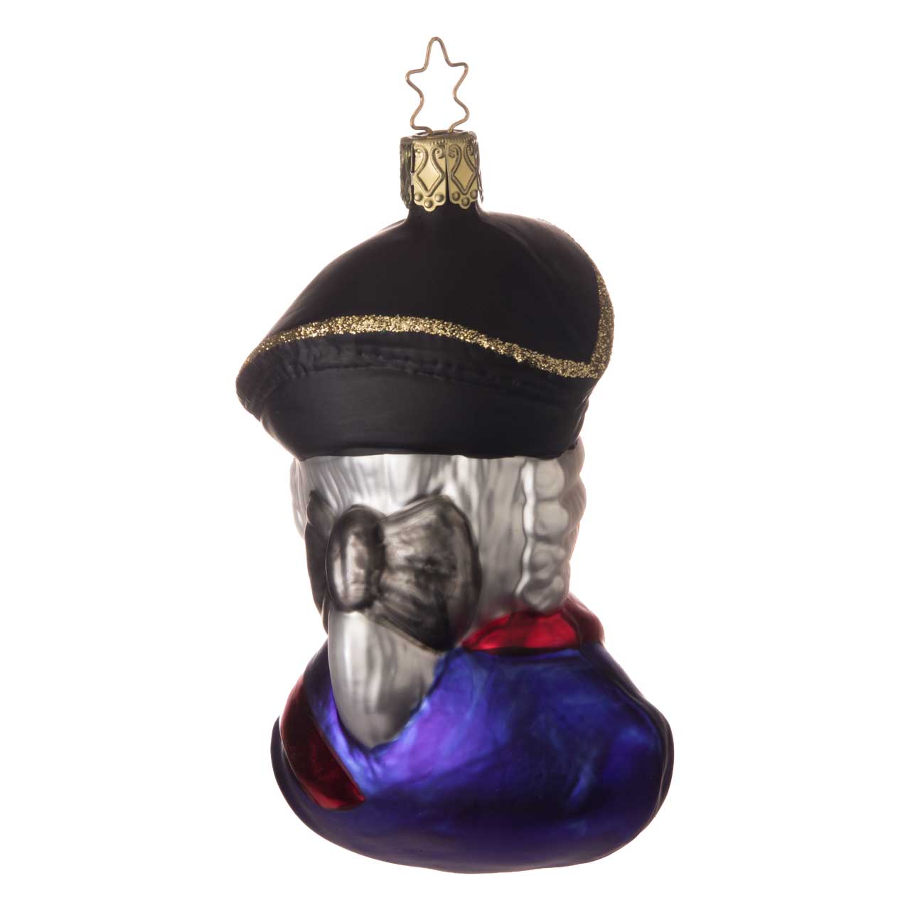La Bola de Navidad representa a Federico el Grande en un detallado busto. Con rasgos faciales realistas, una peluca blanca rizada, un sombrero tricornio negro con adornos dorados y un uniforme azul y rojo brillante con detalles dorados, resulta especialmente impresionante.