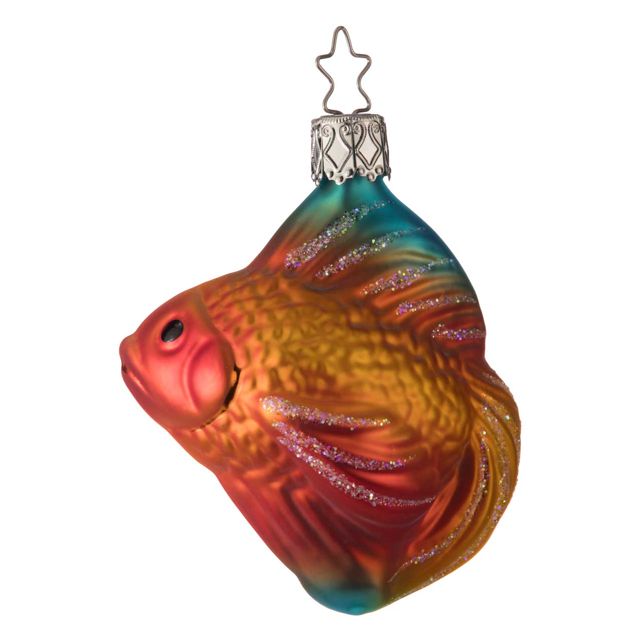 Los peces en el árbol de Navidad tienen ya una larga tradición. Este pez velo combina ambas cosas: el motivo de probada eficacia con la última técnica de coloración y una forma inusual y artística. El animal, criado originalmente como pez dorado en China, impresiona no sólo por su color rojo anaranjado, sino también por sus enormes aletas