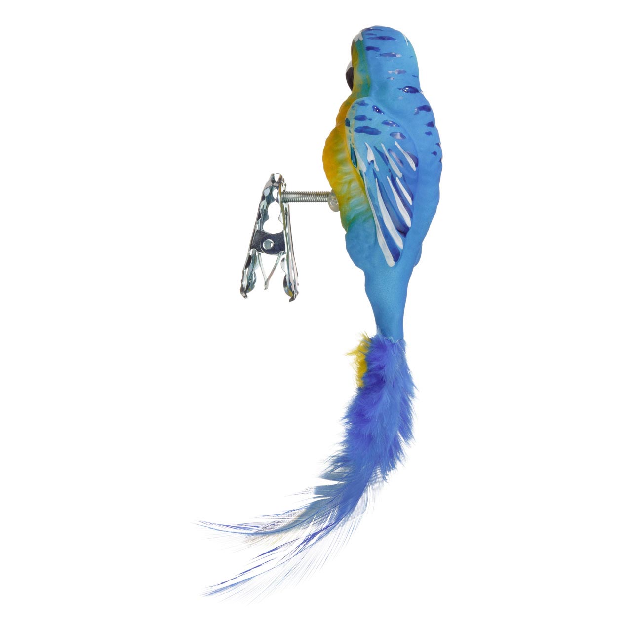 Algo exótico para el árbol: ¿qué clase de hermoso pájaro azul está posado en el verde del abeto? Con el dorso mate, la cabeza verdosa y un llamativo pecho amarillo junto con una cola amarillo-azulada hecha de plumas reales, está posado sobre un clip plateado en las ramas, sin dejar lugar a dudas: