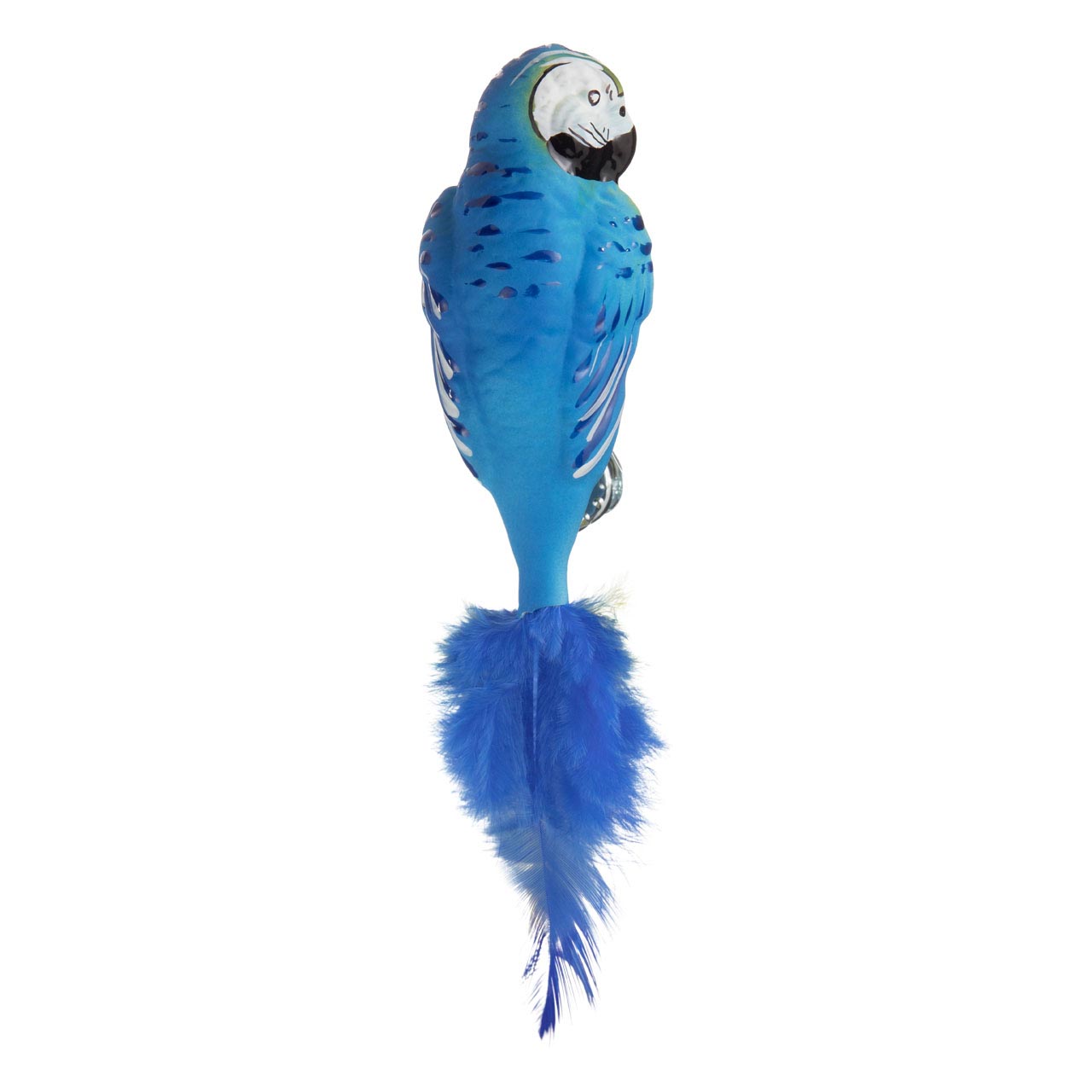 Se trata de un guacamayo de pecho amarillo. Y uno especialmente ornamentado. Hecho de cristal y pintado con hábiles pinceladas, tanto artificialmente como con gran detalle, se parece asombrosamente a su modelo natural. El pico brilla en negro, la característica coloración facial resplandece en blanco con numerosas y finas líneas negras. El plumaje de las alas también se ha coloreado repetidamente con contornos azules y blancos.