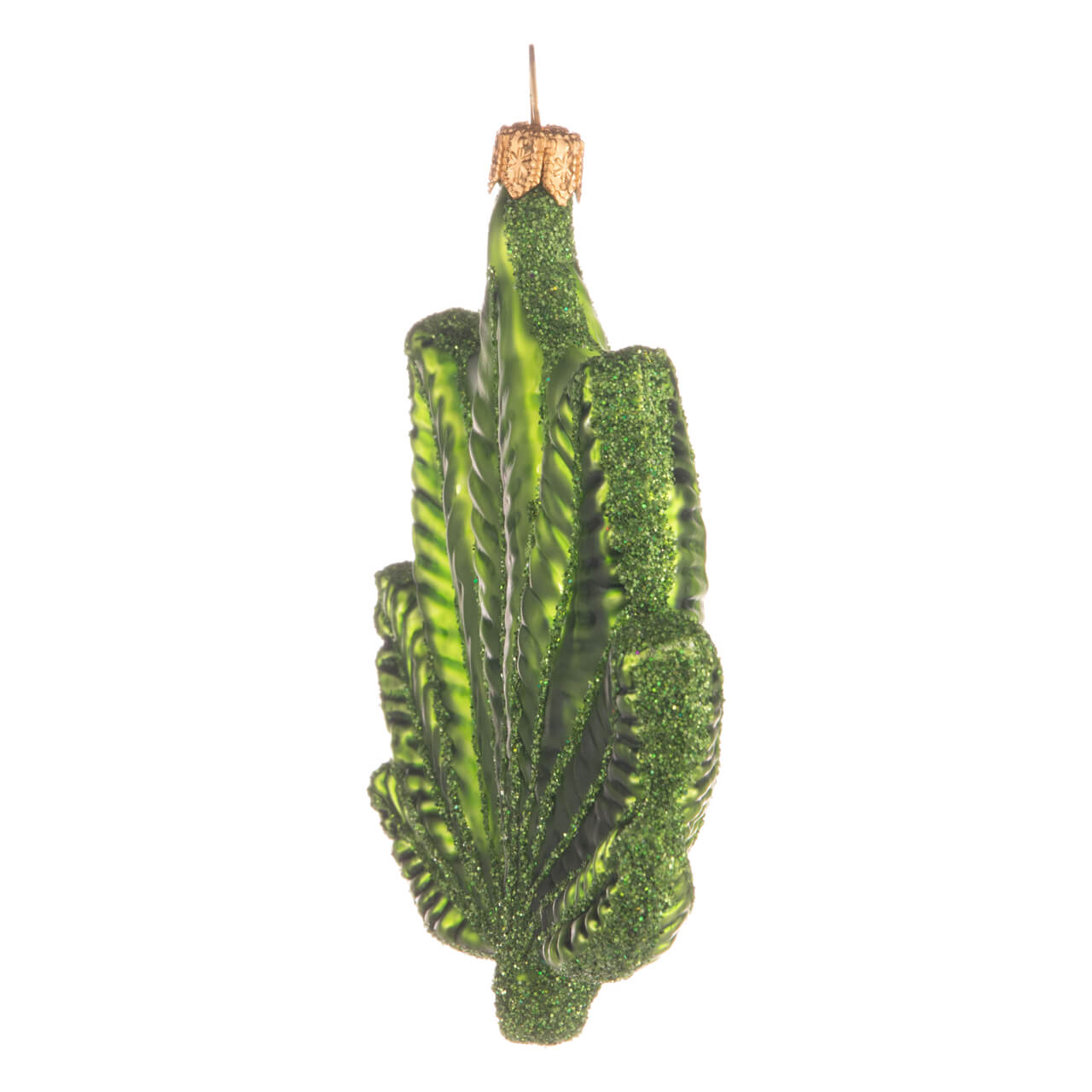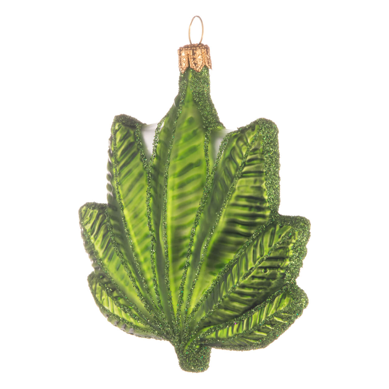 Silenciosa, un poco brillante, pero absolutamente inofensiva y simplemente hermosa a la vista, ahora adorna aquí el árbol de Navidad en forma de figurita de cristal. Un total de siete dedos se abren en abanico en semicírculo, formando un interior ligeramente abollado y un dorso ligeramente curvado. Unas delicadas líneas verdes resaltan las venas de cada hoja, mientras que el polvo de purpurina verde cubre los contornos y los bordes.