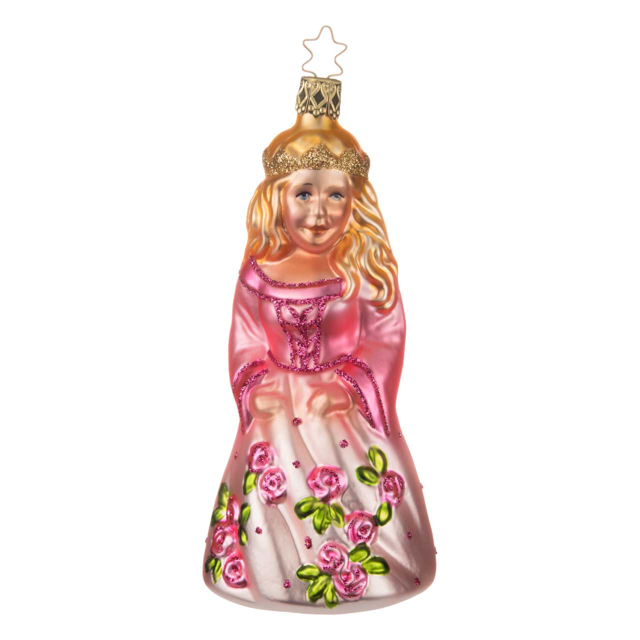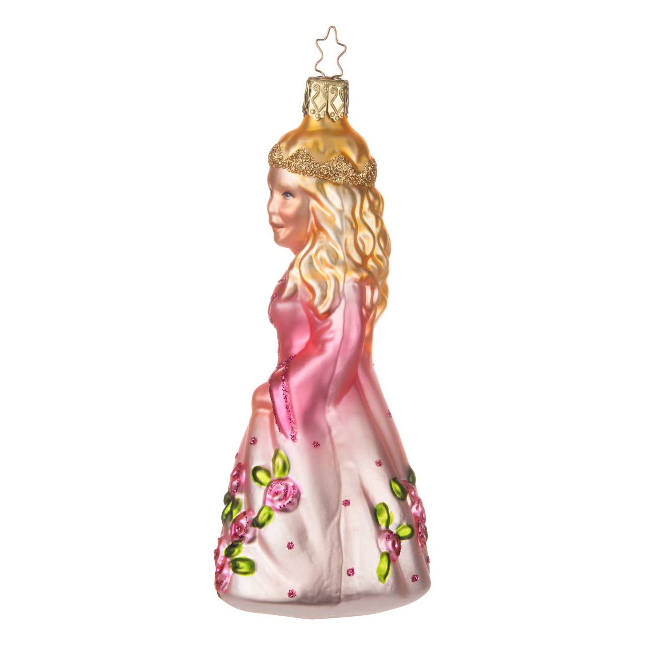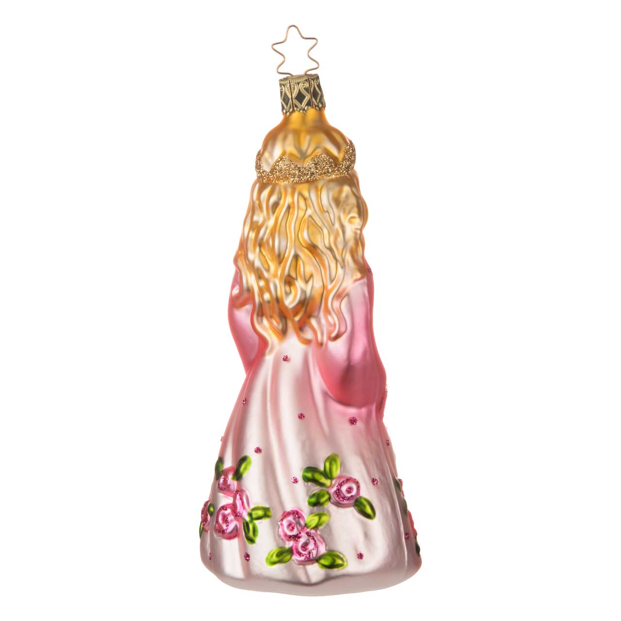 La figura muestra a la Bella Durmiente como una princesa con cabellos dorados y una corona de oro. Su vestido está diseñado en rosa y blanco brillantes, decorado con relucientes adornos de rosas en rosa y verde. La forma es figurativa, con líneas fluidas que acentúan la elegante caída del vestido.