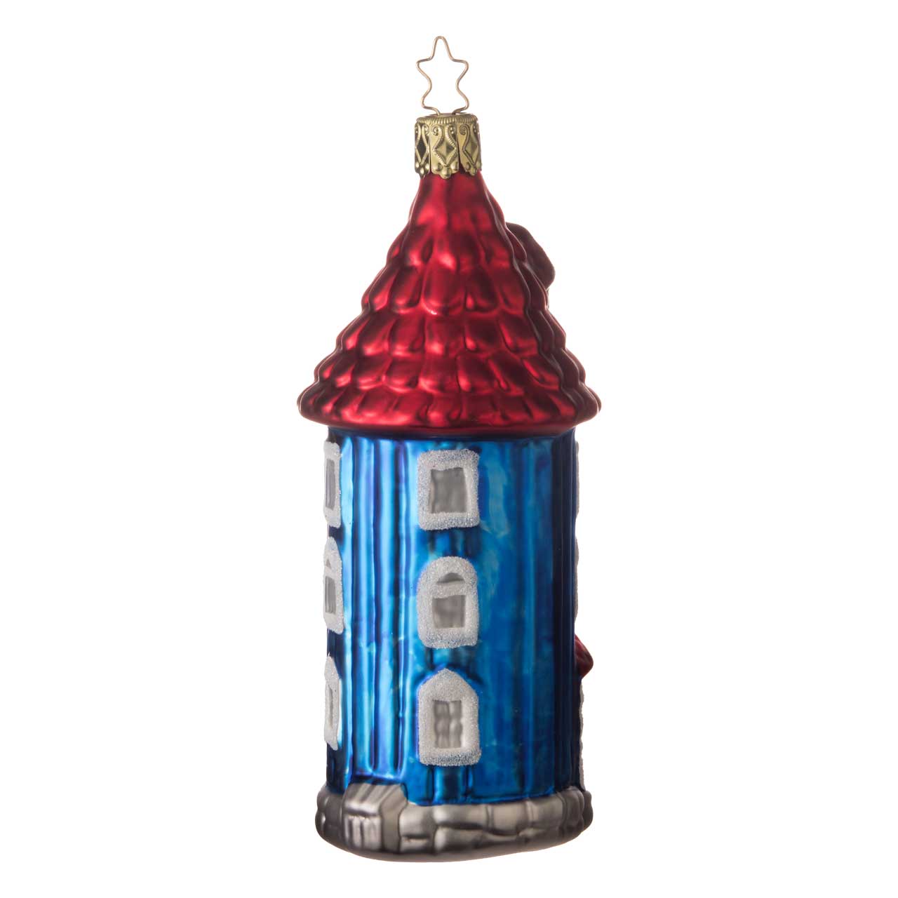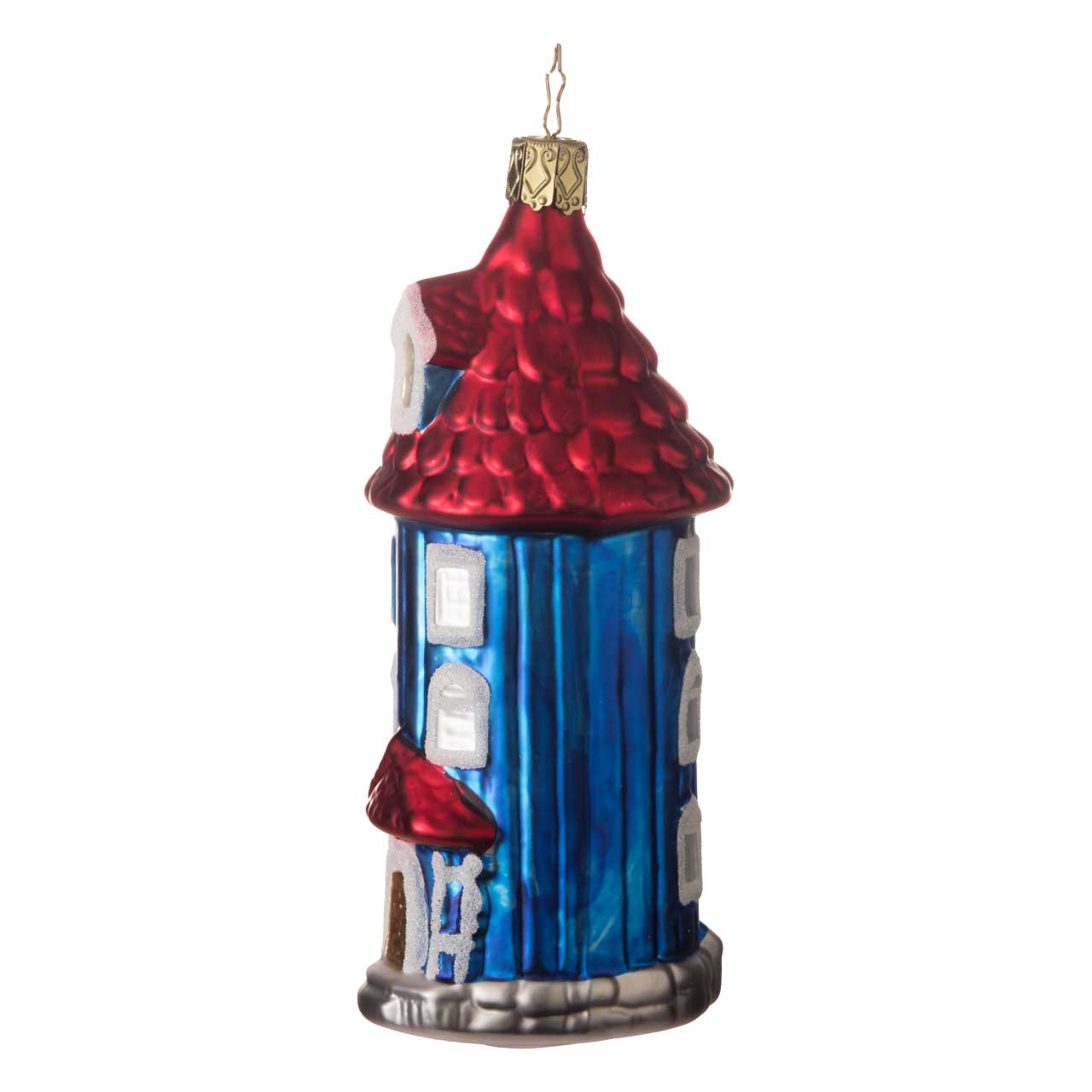 La figurita muestra la famosa casa en forma de torre alargada. Está diseñada en azul brillante, con muchas ventanas blancas resaltadas con purpurina plateada. El tejado brilla en rojo intenso, mientras que la base y la puerta son de color gris y dorado. Un diseño detallado y colorista que llama inmediatamente la atención.