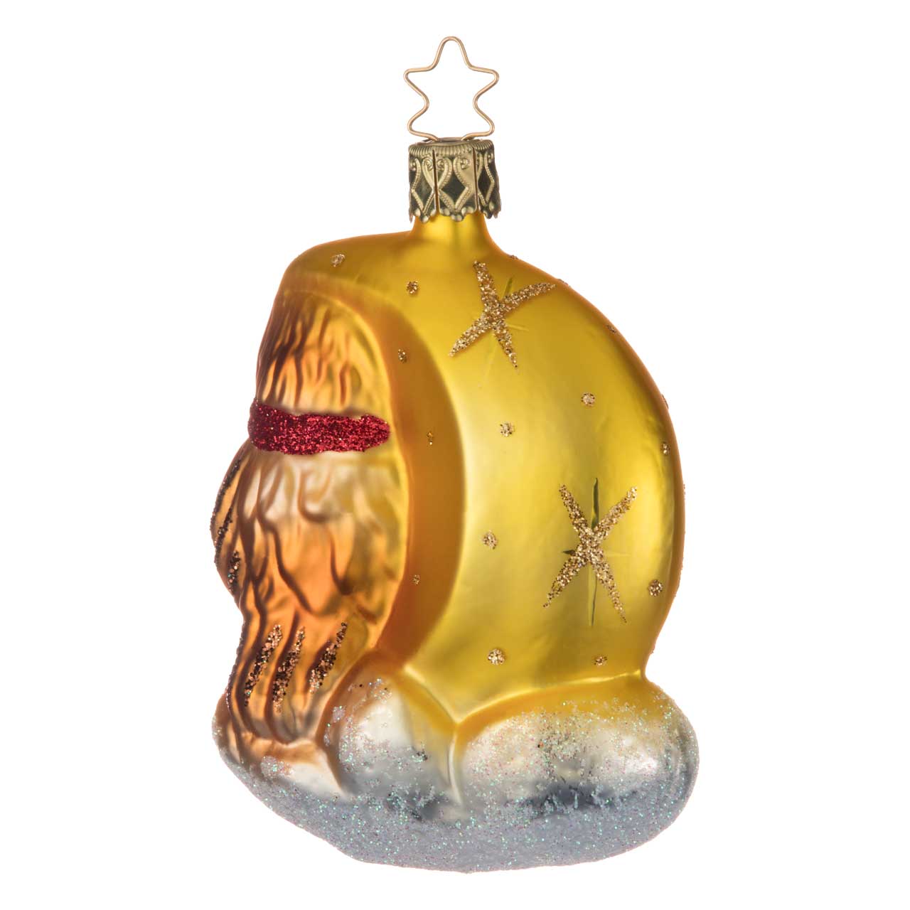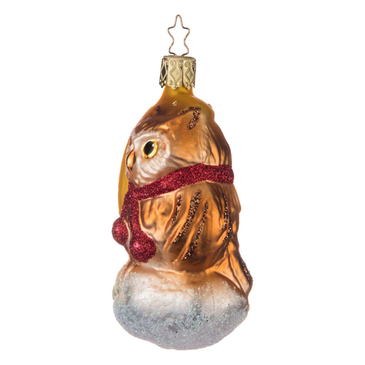 Esta estatuilla muestra un búho marrón dorado de grandes ojos vigilantes sentado en un suelo cubierto de nieve. Alrededor del cuello lleva un pañuelo rojo brillante. En el fondo se alza una brillante luna de color amarillo dorado, decorada con centelleantes estrellas. La combinación de cálidos tonos marrones y dorados con nieve plateada y toques rojos hace que el motivo atraiga todas las miradas.