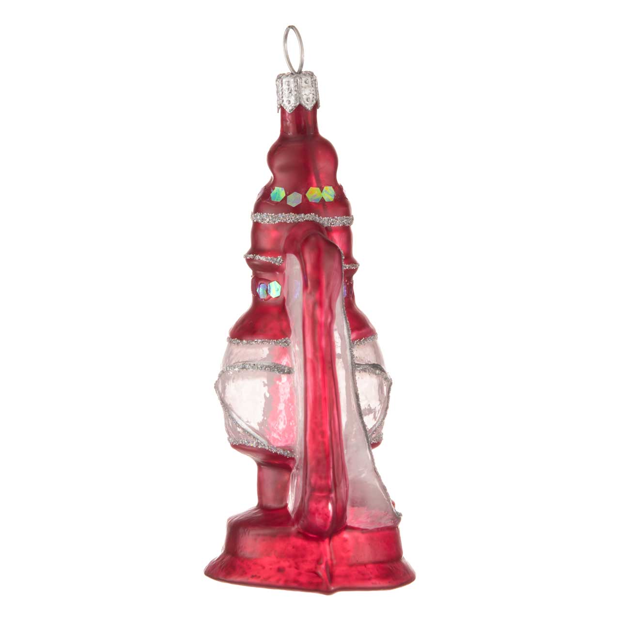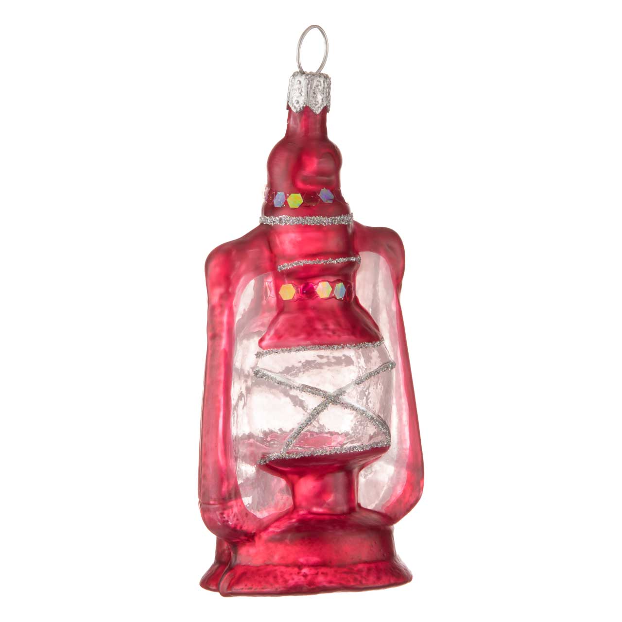 La lámpara es muy delicada. Las partes metálicas de la lámpara son de color rojo. Las ranuras de ventilación están indicadas con una cinta brillante. Y, por supuesto, también se ve claramente el asa plateada y los cables cruzados de la pantalla, que protegen el cristal. Ojalá esta Bola de Navidad fuera tan robusta como la original.
