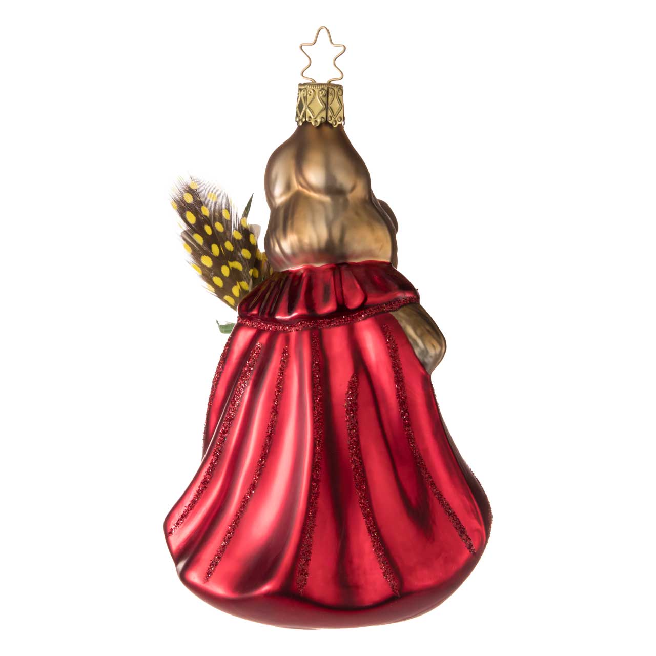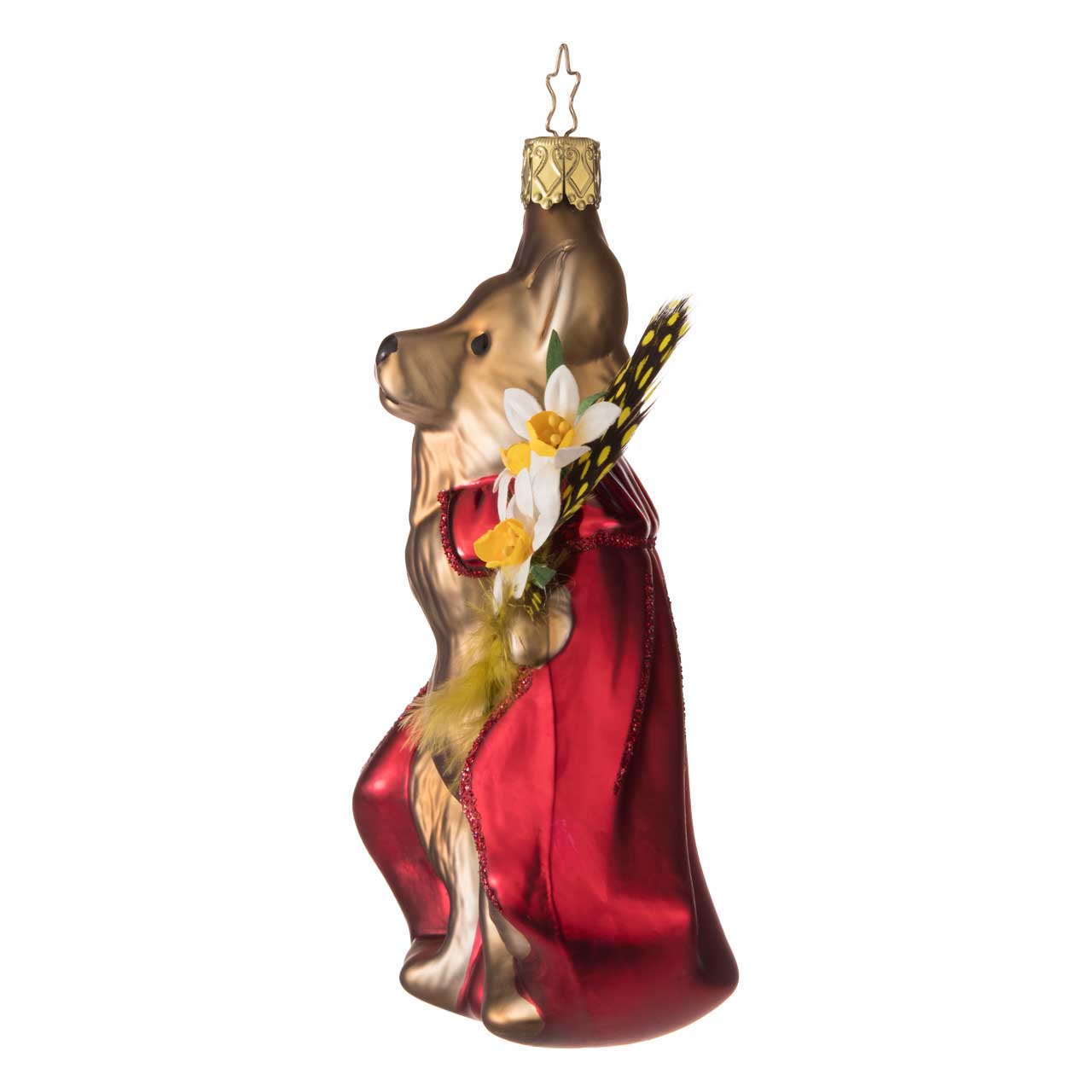 La figura muestra al lobo erguido, vestido con un llamativo manto rojo con detalles brillantes y un cálido pelaje de color marrón dorado. Sostiene un pequeño ramo de flores en la pata, creando un juguetón contraste. La figura está esculpida y detallada, con una combinación de tonos rojos brillantes, dorados y naturales.