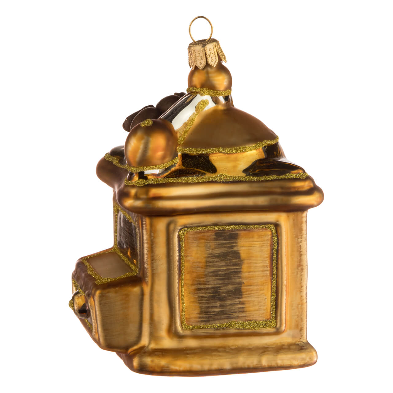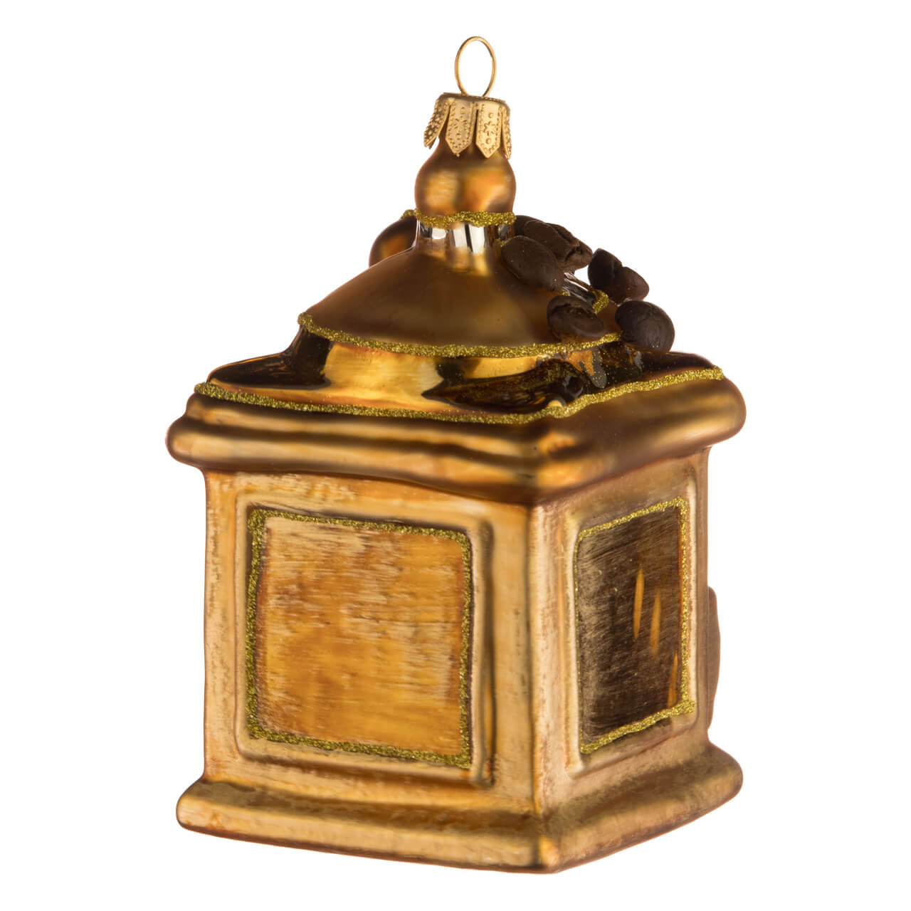 Debe tener un brillo dorado mate, de madera, como éste, que además está decorado con finas líneas de purpurina dorada que separan sus contornos y los distintos niveles en mate y brillante. Tampoco puede faltar un cajón medio abierto en la parte delantera. Su futuro contenido está estampado en la tapa como un divertido accesorio, donde se han pegado cuidadosamente granos de café marrones de verdad con un pequeño toque de pegamento.