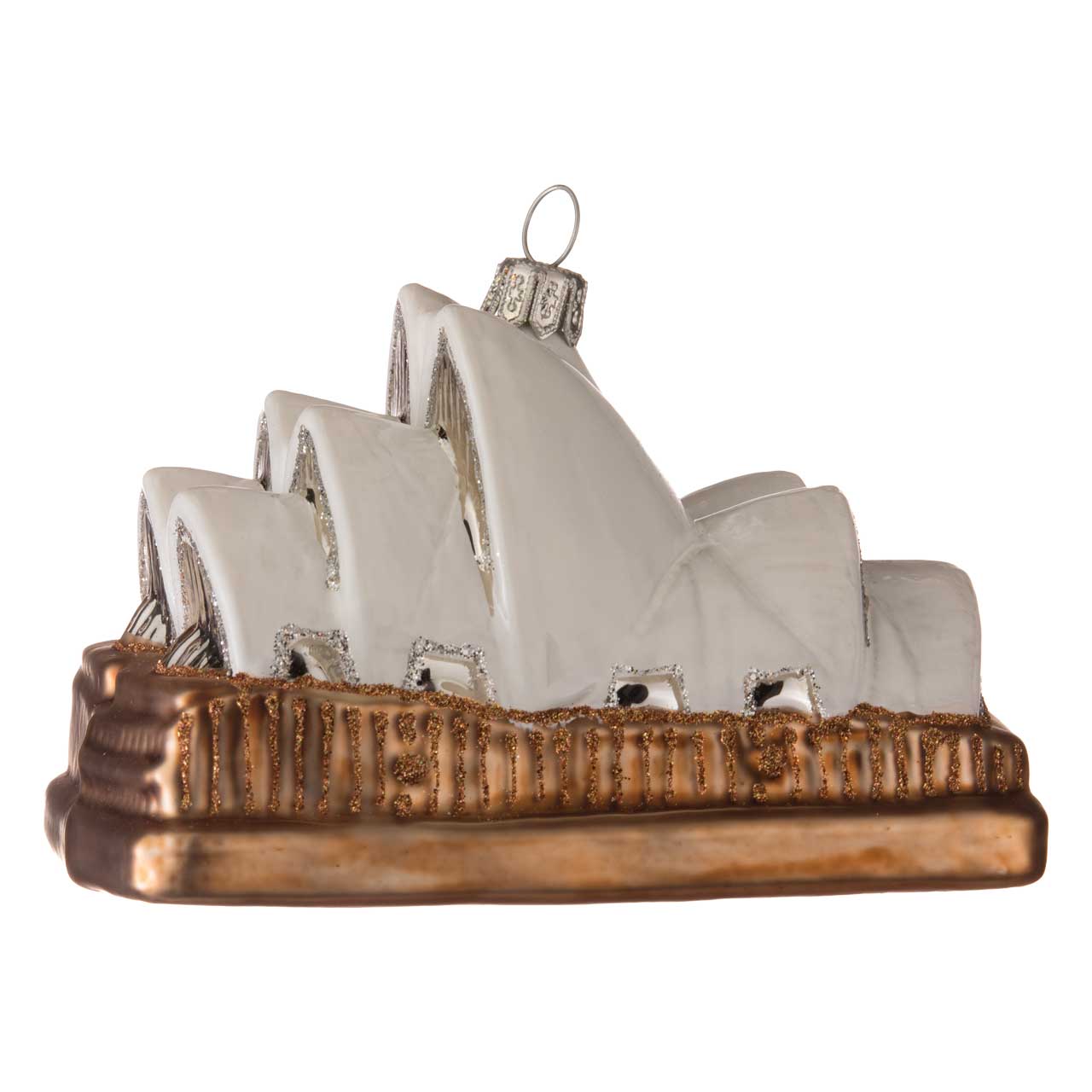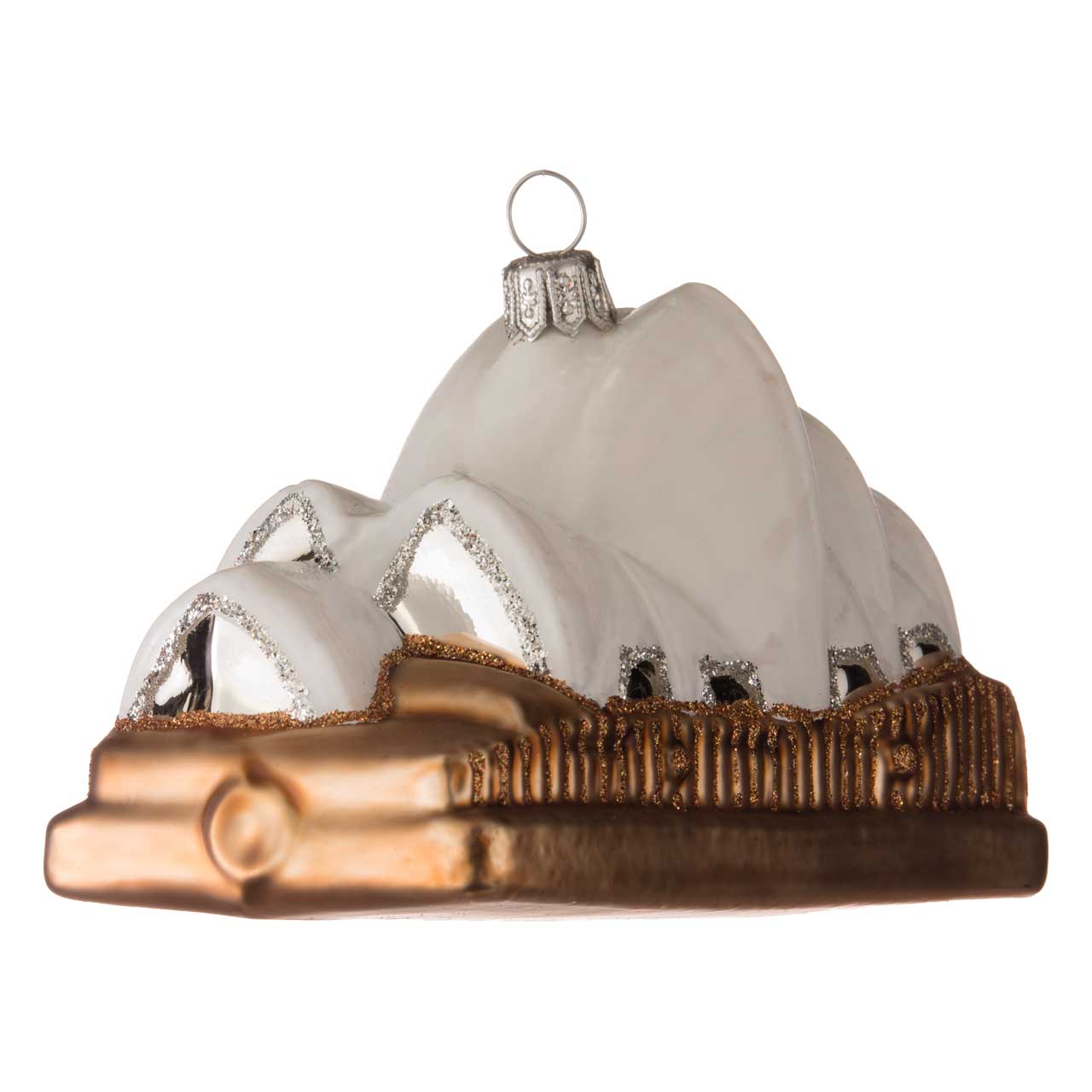 Esta detallada réplica muestra la forma característica del teatro de la ópera con sus tejados curvados en blanco y plata, acentuados por finas líneas brillantes. La base brilla en un cálido tono bronce y forma un sofisticado contraste con las superficies de color claro. Una pieza de diseño artístico que combina belleza arquitectónica y elegancia festiva.