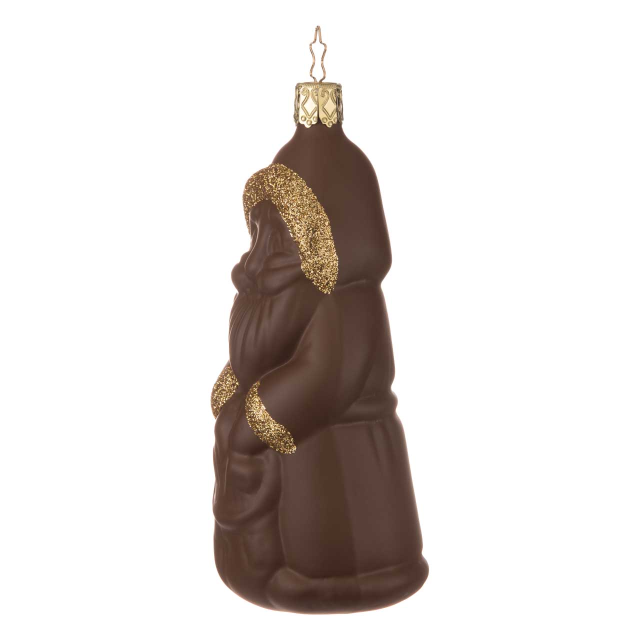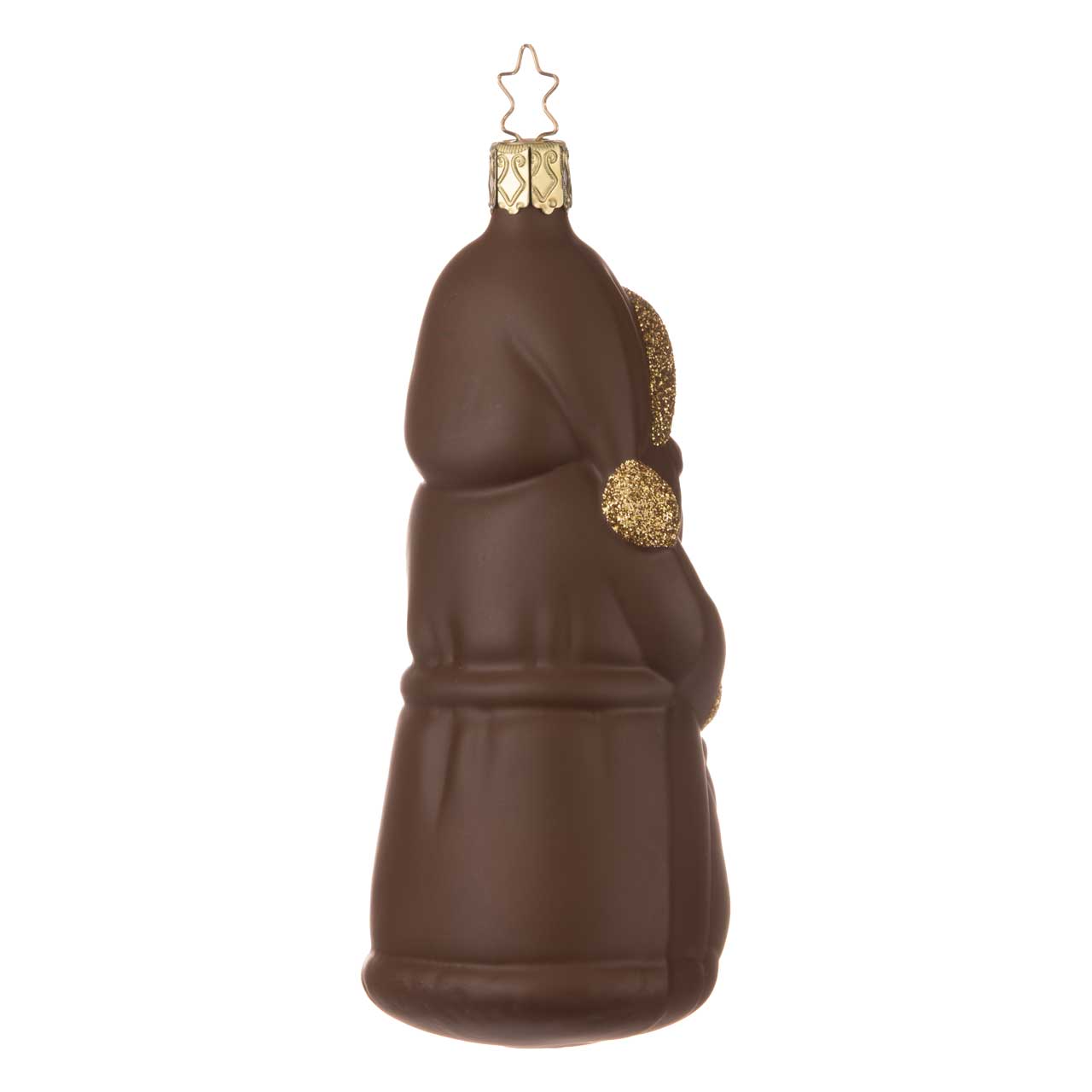 La figura muestra a Papá Noel en un look de chocolate marrón con brillantes detalles dorados en la capucha, las mangas y el abrigo. La forma es clásica y redondeada, y el colorido recuerda engañosamente a un cuerpo de chocolate hueco. Una pieza encantadora que despierta de inmediato el apetito navideño, y tal vez un trocito de chocolate.