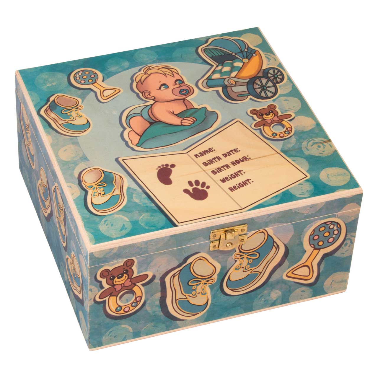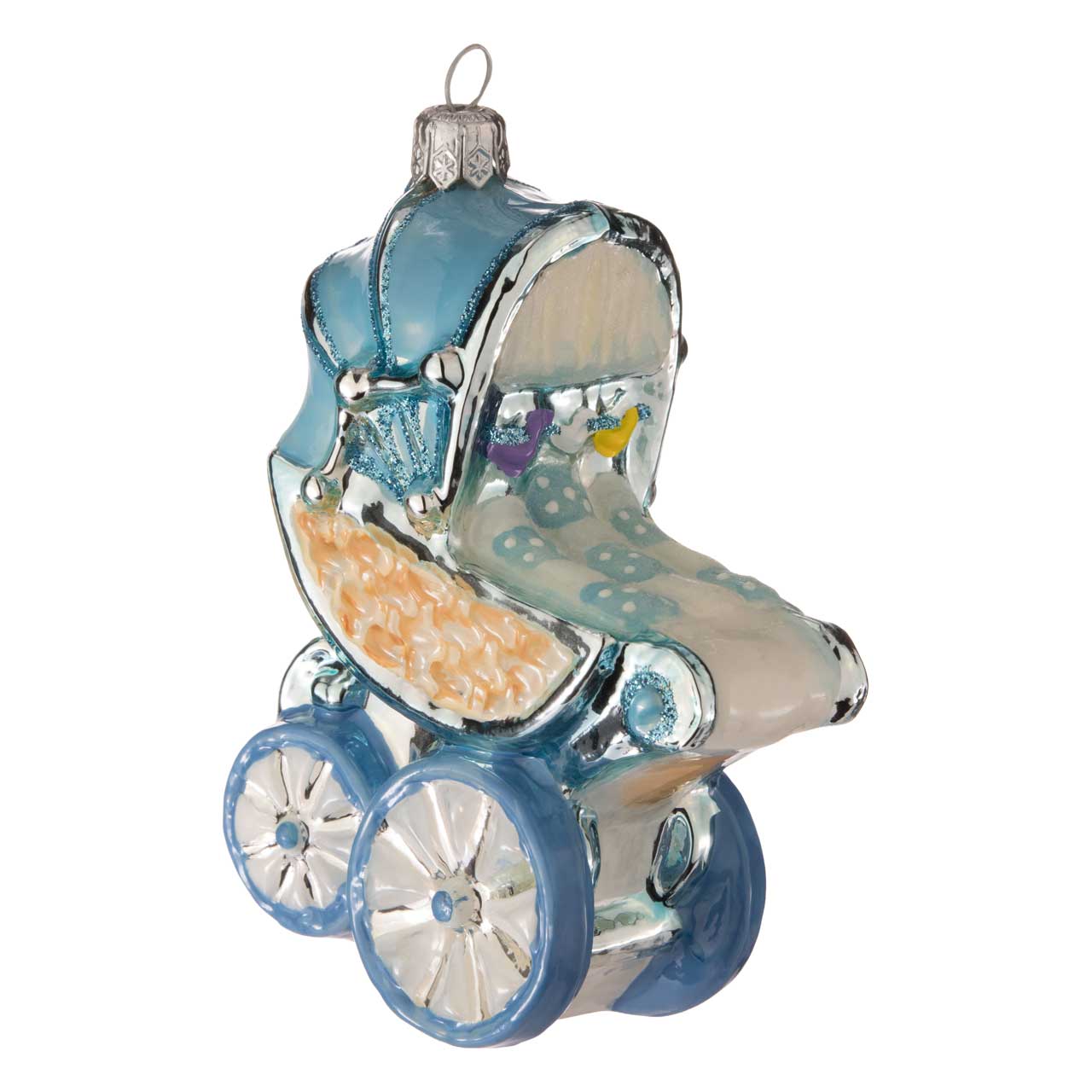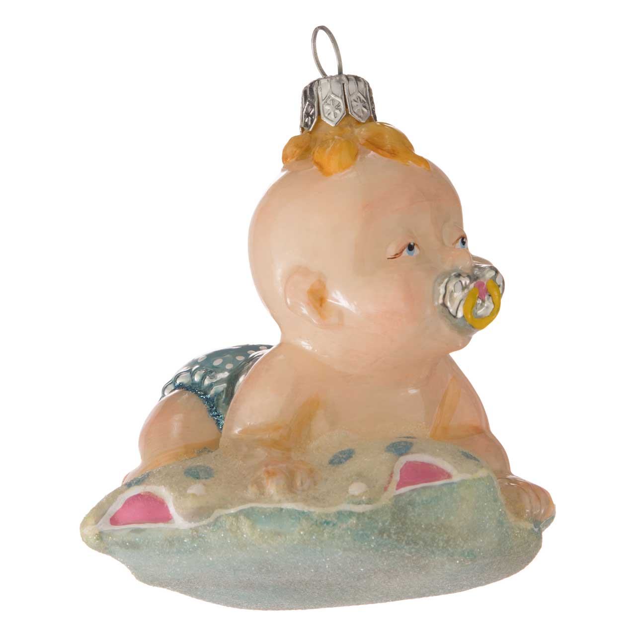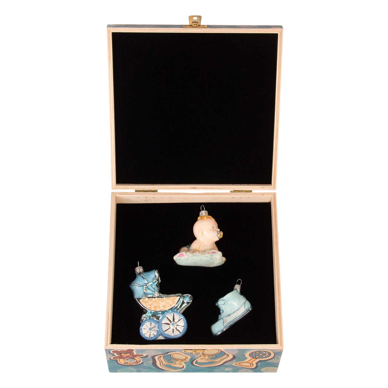 El set consta de un total de tres figuras para el árbol de Navidad, que vienen en una caja de madera de alta calidad y elaboradamente impresa: un cochecito de aspecto histórico con amorosos detalles, un simpático zapato de bebé y, por supuesto, un bebé gateando encaramado a un cojín y mirando alegremente a su alrededor con un chupete en la boca.
