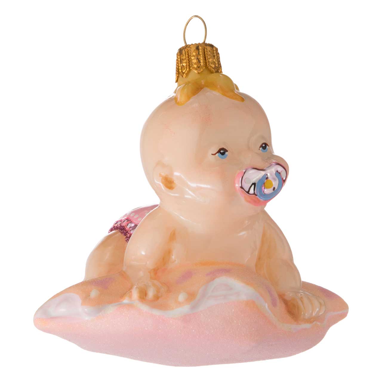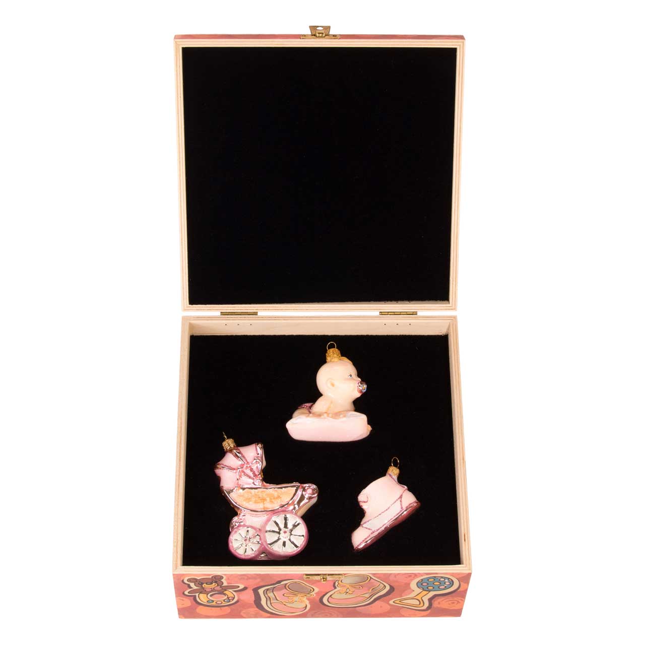 El set consta de un total de tres figuras del árbol de Navidad, que vienen en una caja de madera de alta calidad y elaboradamente impresas: un cochecito de aspecto histórico con amorosos detalles, un simpático zapato de bebé y, por supuesto, un bebé gateando encaramado a un cojín y mirando alegremente a su alrededor con un chupete en la boca.