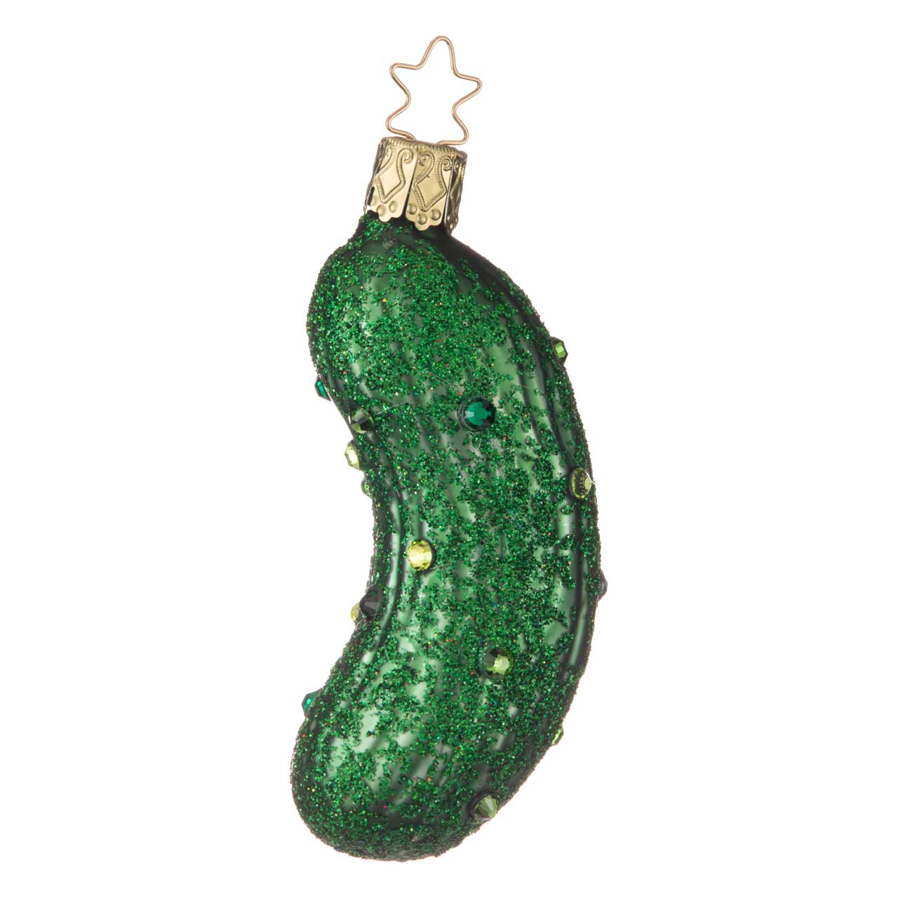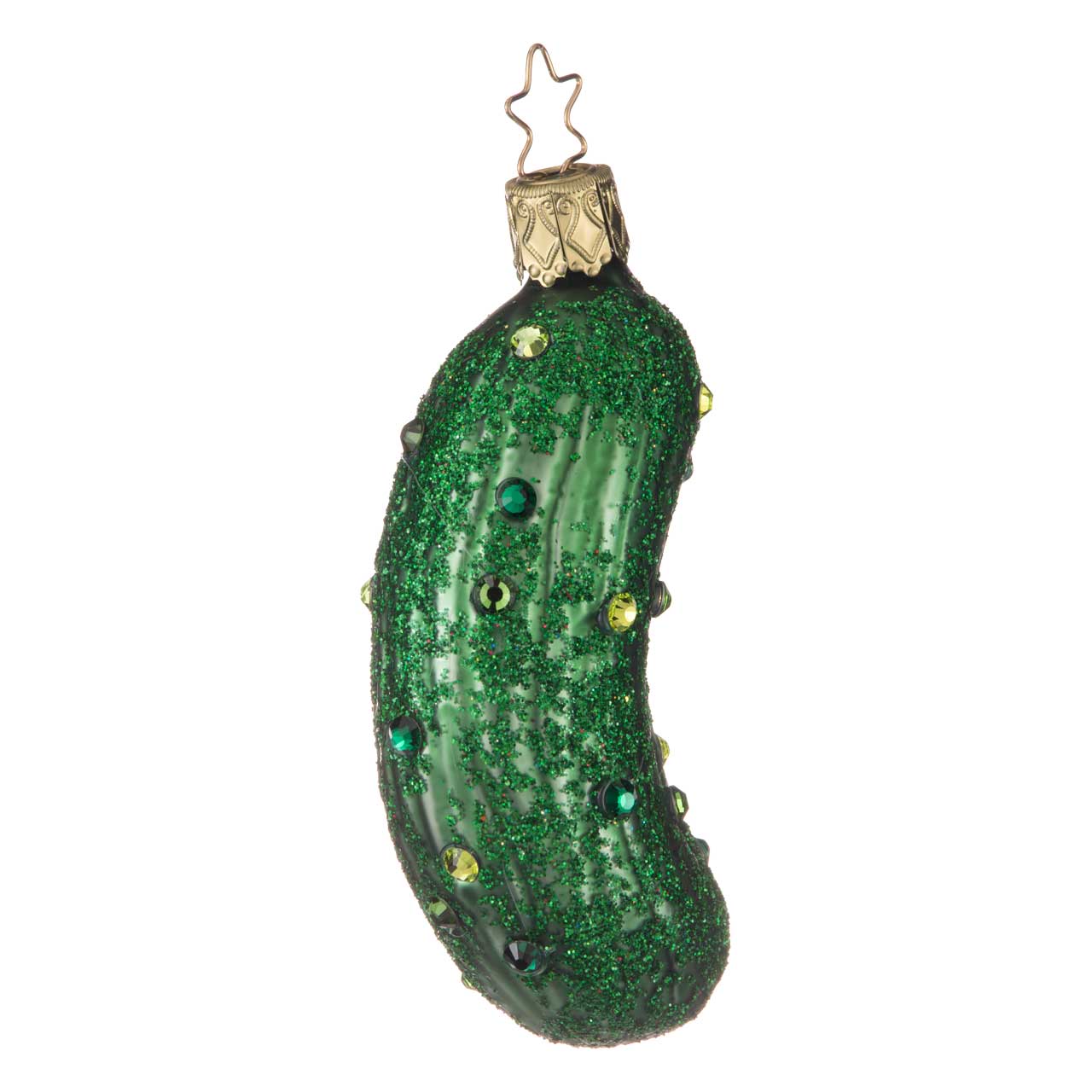 La figurita tiene la clásica forma curvada de un pepino y se presenta en un vibrante color verde. Detalles brillantes de purpurina y pequeñas piedras preciosas de colores decoran la superficie y confieren al motivo un brillo lujoso y festivo.