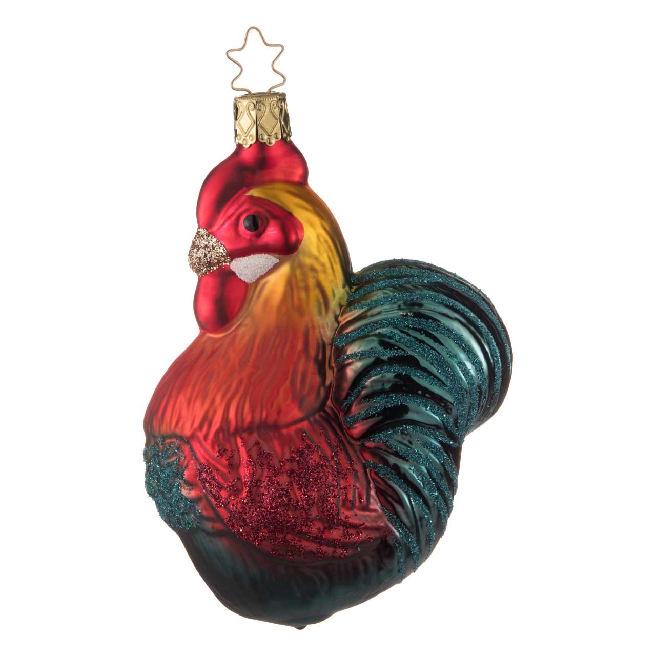 Esta versión muestra al gallo en una detallada forma curvada con una fuerte cabeza roja, cuello dorado y un magnífico cuerpo en rojo-naranja con detalles azules. La cola turquesa, brillante y artísticamente diseñada, es especialmente llamativa y está adornada con purpurina, lo que confiere al motivo un brillo adicional.