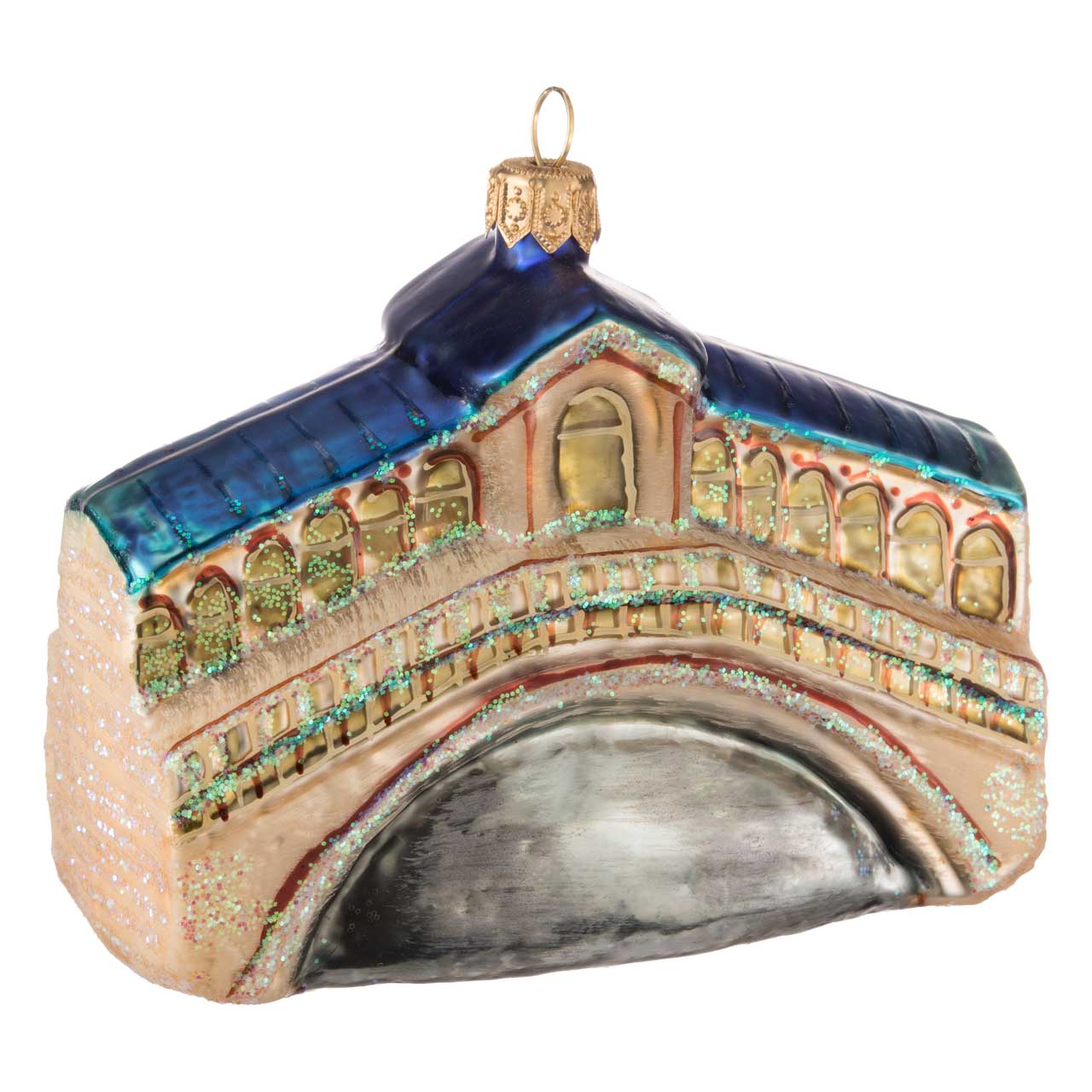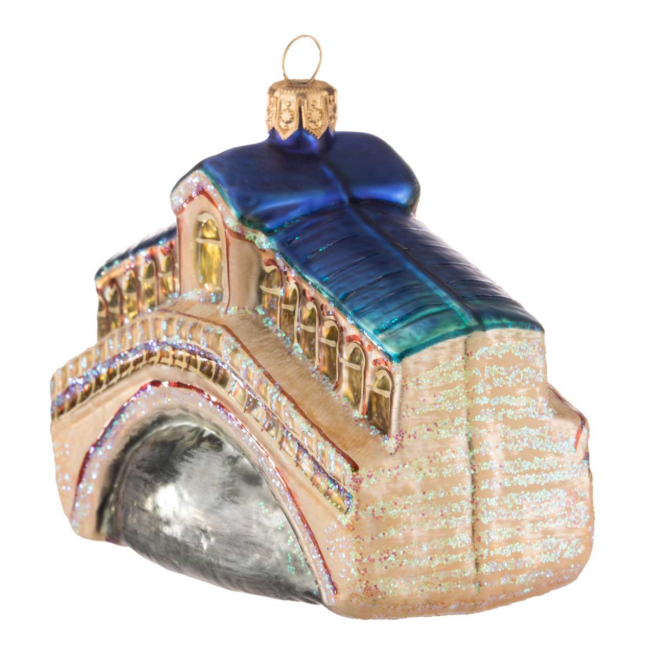 La figura es un poco más colorida que el puente original. Las paredes son de un cálido color beige y el tejado brilla en un azul marino. Finas líneas de purpurina insinúan la mampostería. Los arcos típicos de los techos abovedados de las tiendas son tan reconocibles como las barandillas. El espacio bajo el arco del puente es de un gris resplandeciente que insinúa el paso por el canal. Verdaderamente, una pequeña obra maestra de precisión y simplificación.