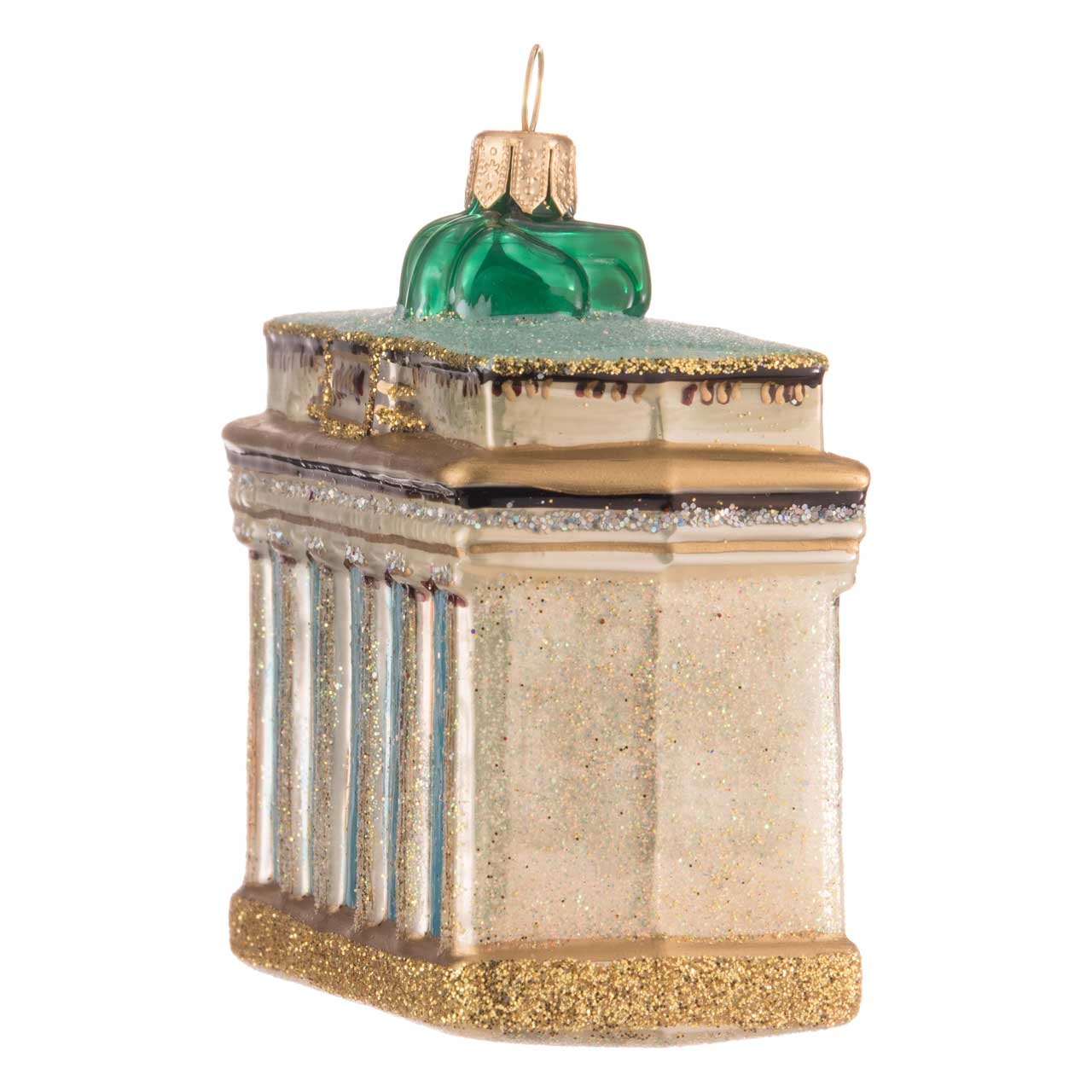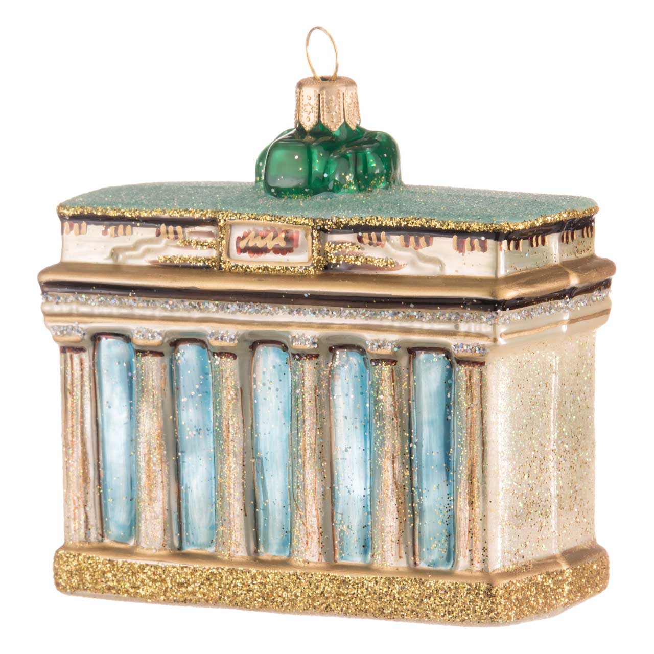 Angular, diseñada con mimo y dotada de los importantes detalles que la hacen inconfundible. Se ha pintado en diferentes tonos de dorado y beige. El cielo brilla en azul intenso a través de los llamativos seis pilares que sostienen el poderoso tejado. Los capiteles y los adornos se han simplificado con cuidadosas pinceladas. Los brillos dorados confieren al edificio un toque glamuroso. A la cuadriga de cobre también se le ha dado un toque maravillosamente estilizado: como un pomo verde, que muestra claramente dónde se dirigía antaño hacia el este y el oeste, está entronizada en lo alto bajo la corona dorada de suspensión.
