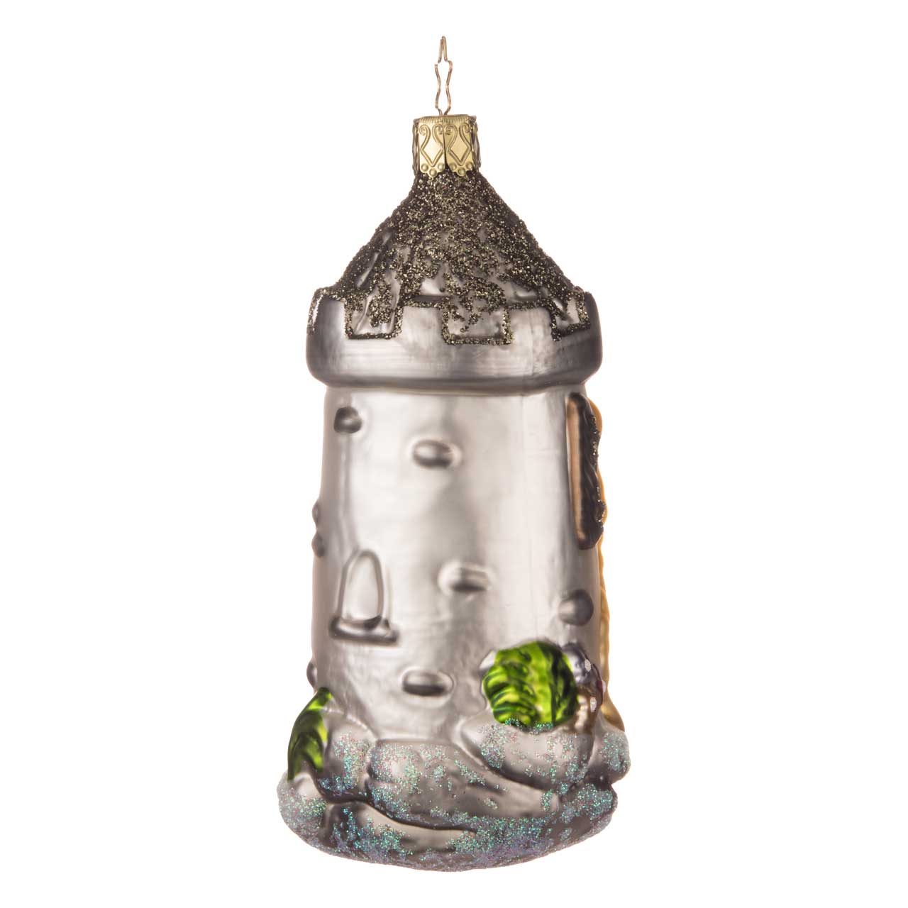 Esta figurita de cristal muestra a Rapunzel en su torre gris con tejado puntiagudo, enmarcada por detalles brillantes. Su larga melena rubia cae por la ventana hasta las flores verdes y coloridas a los pies de la torre. La forma es cilíndrica, los colores van del plateado y gris al dorado y rubio, pasando por fuertes tonos verdes y pequeños toques rojos.