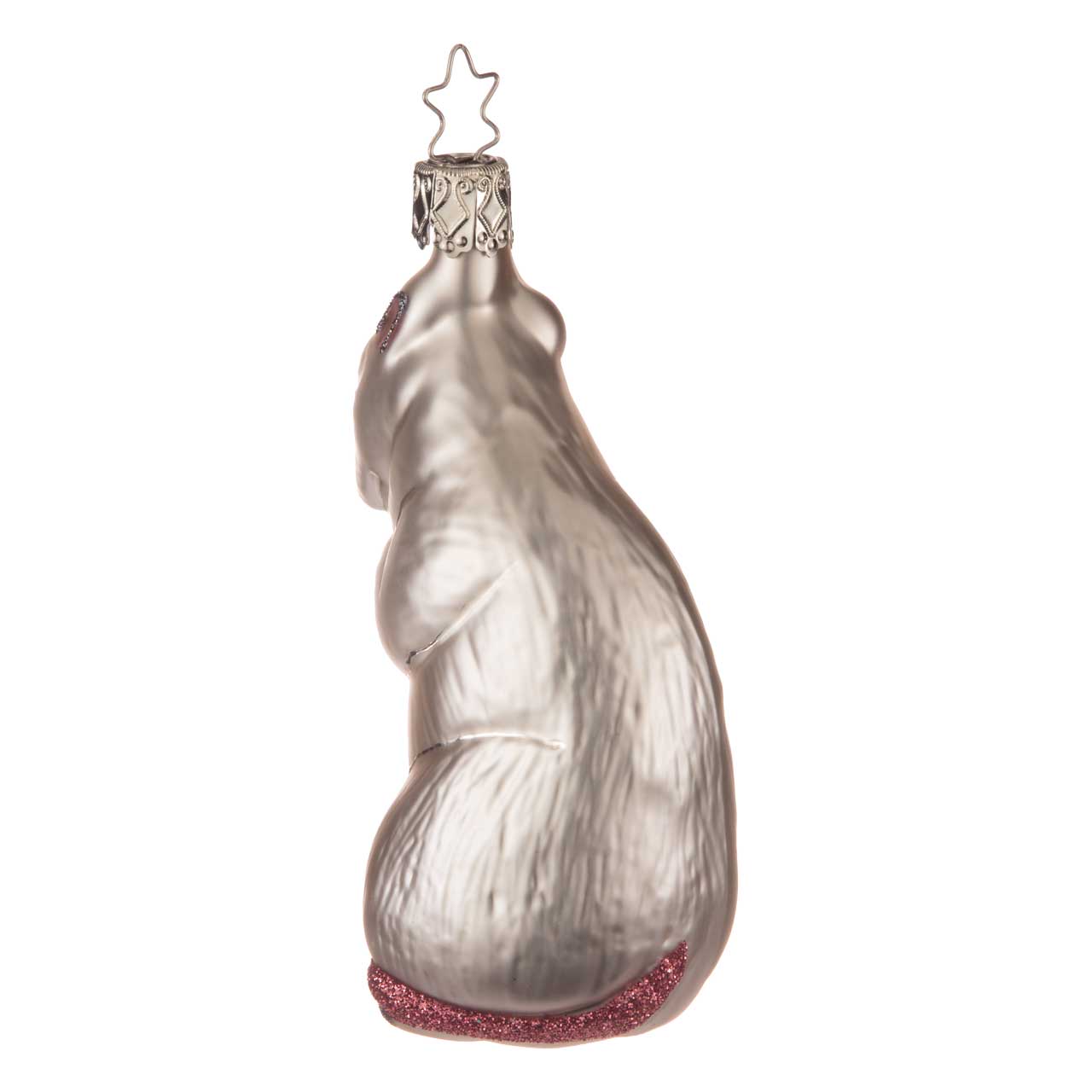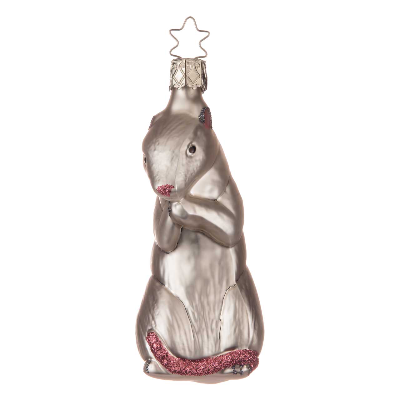 Aquí se muestra a la rata en posición vertical con las patas juntas, casi como si observara o esperara en silencio. El pelaje está diseñado en tonos gris plateado, mientras que los detalles finos, como la nariz rosa, las orejas brillantes y la larga cola roja chispeante, animan la imagen general. La forma es realista y esbelta, con un cuerpo ligeramente curvado que parece vivo y elegante.