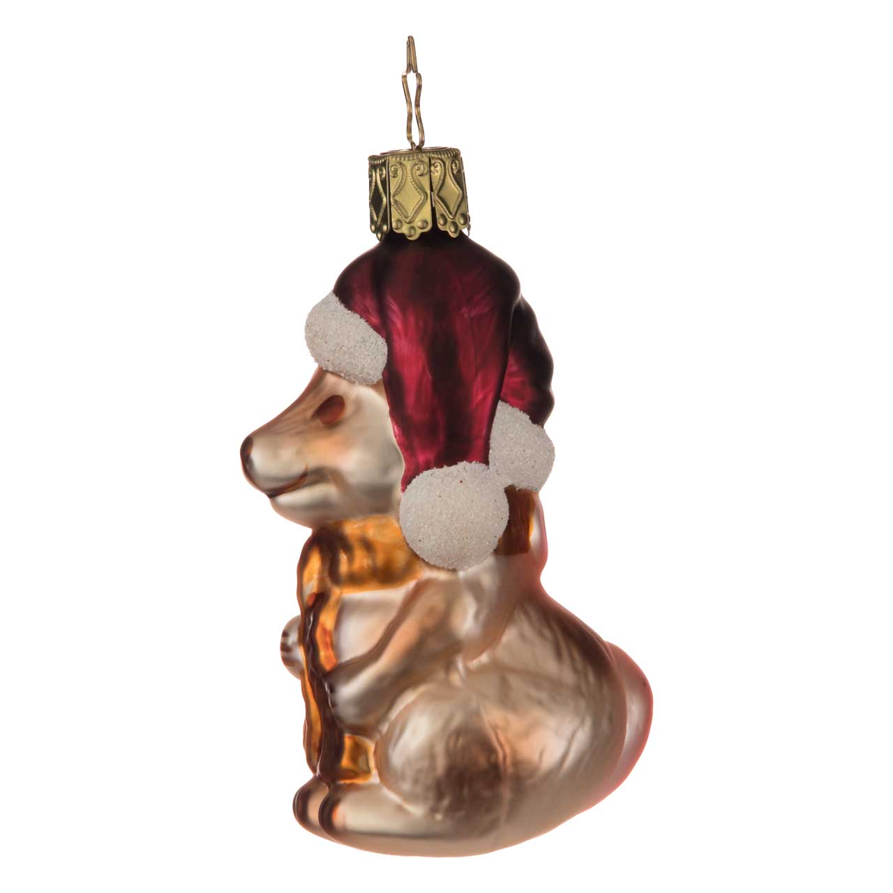 La figura muestra a un ratón sentado en suaves y brillantes tonos marrones, con un gorro rojo con ribetes blancos y una bufanda amarilla dorada. La forma y la postura parecen simpáticas y juguetonas, mientras que los colores aportan un toque cálido y navideño.