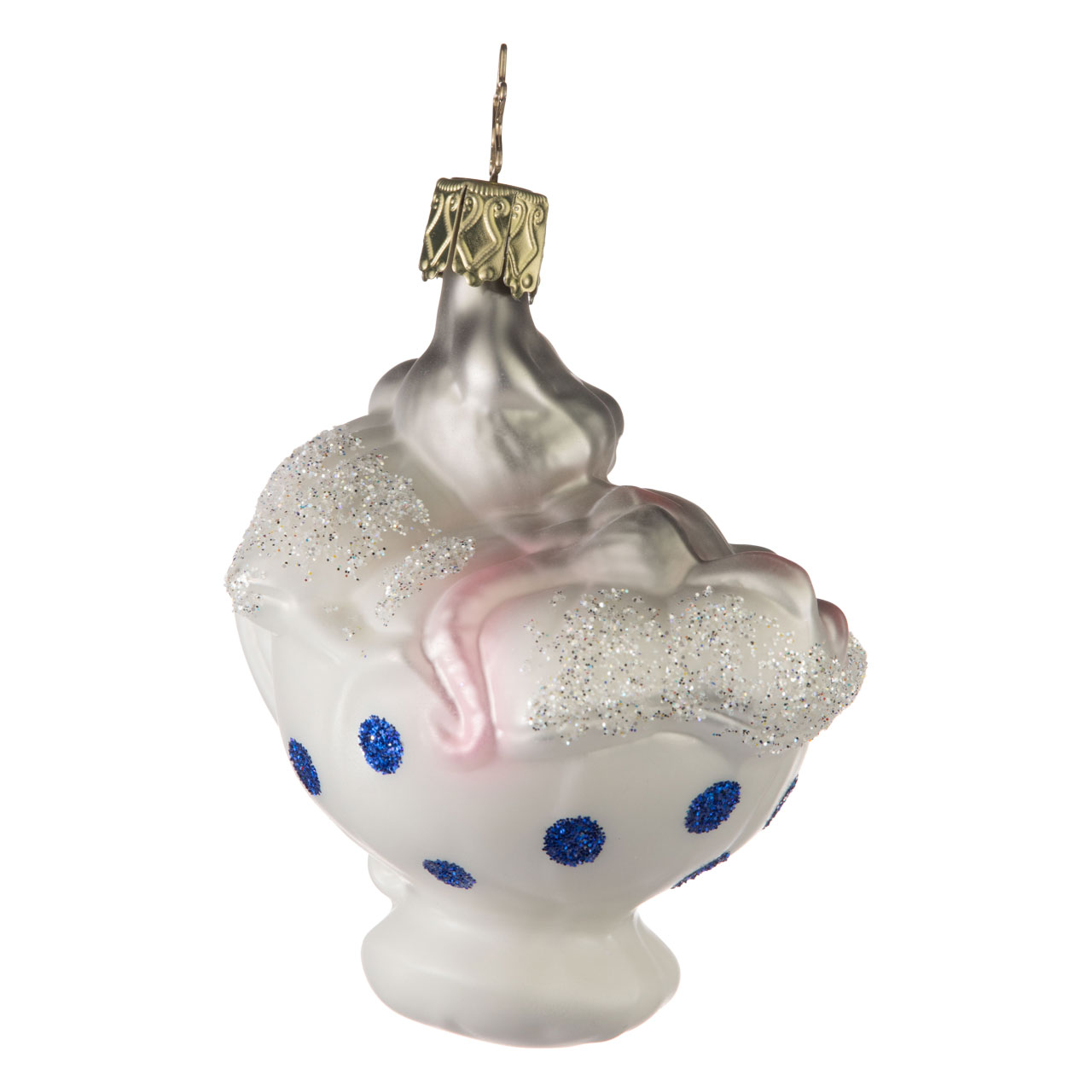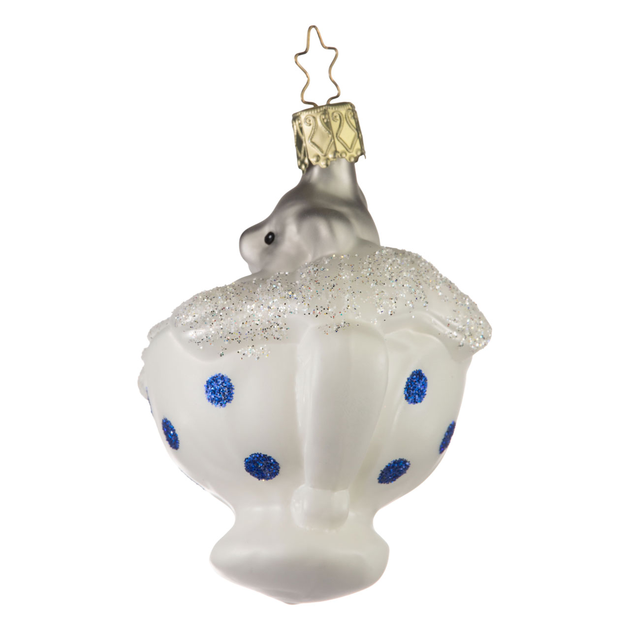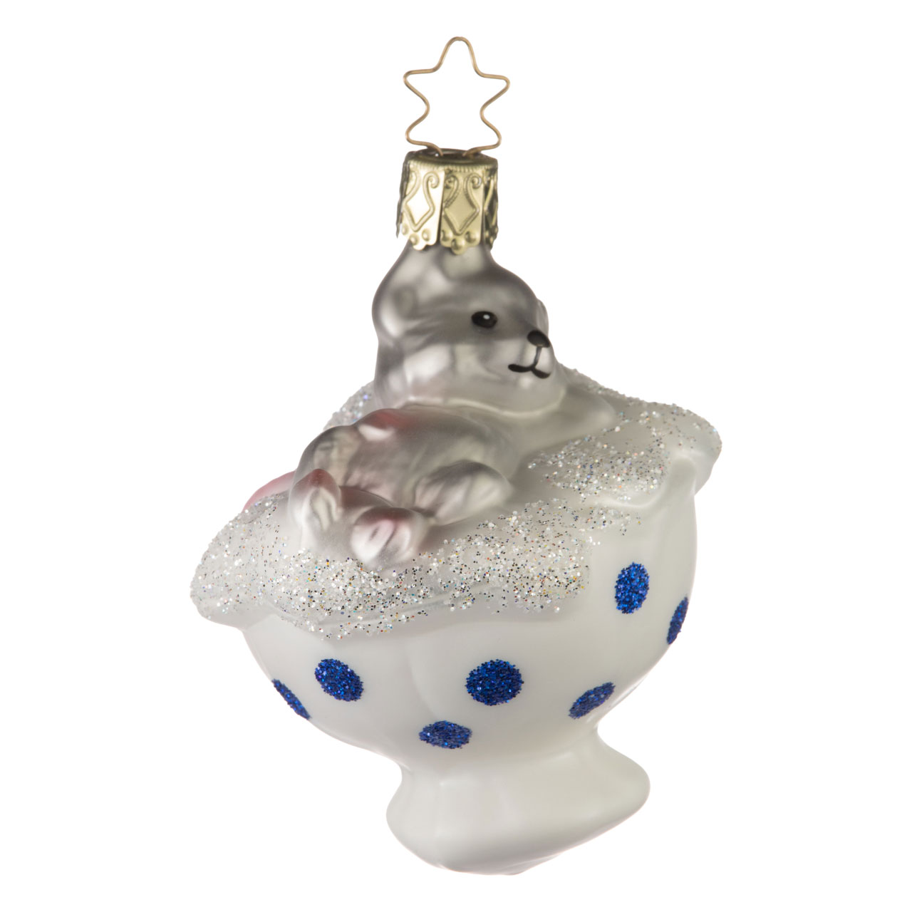 Como un principito, el simpático ratoncito está sentado despreocupadamente de espaldas, con un brazo doblado bajo la cabeza y la cabeza vuelta fríamente hacia el espectador. Su sedoso pelaje brilla en un sencillo gris. Sólo el hociquito y los ojitos de botón forman un contraste negro. Como una cama: la crema debajo, que a su vez se rellena en una elegante taza con diseño de porcelana blanca. Y como es habitual en muchos servicios, puntos azules de purpurina adornan la forma ligeramente antigua.