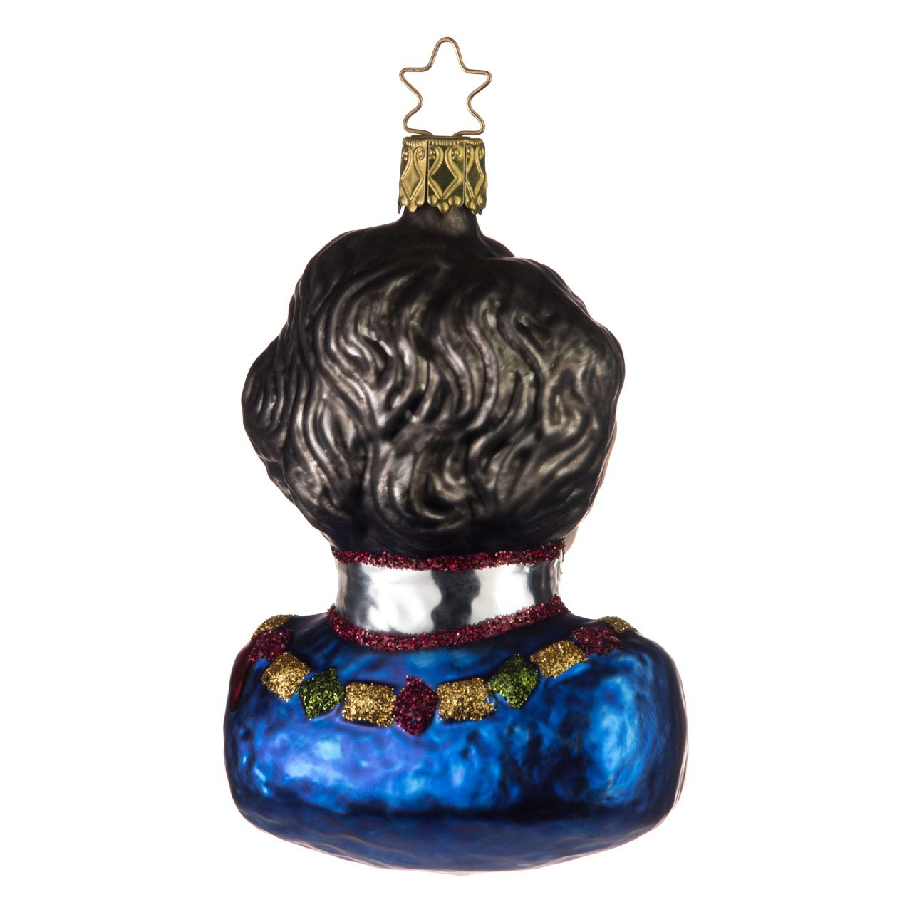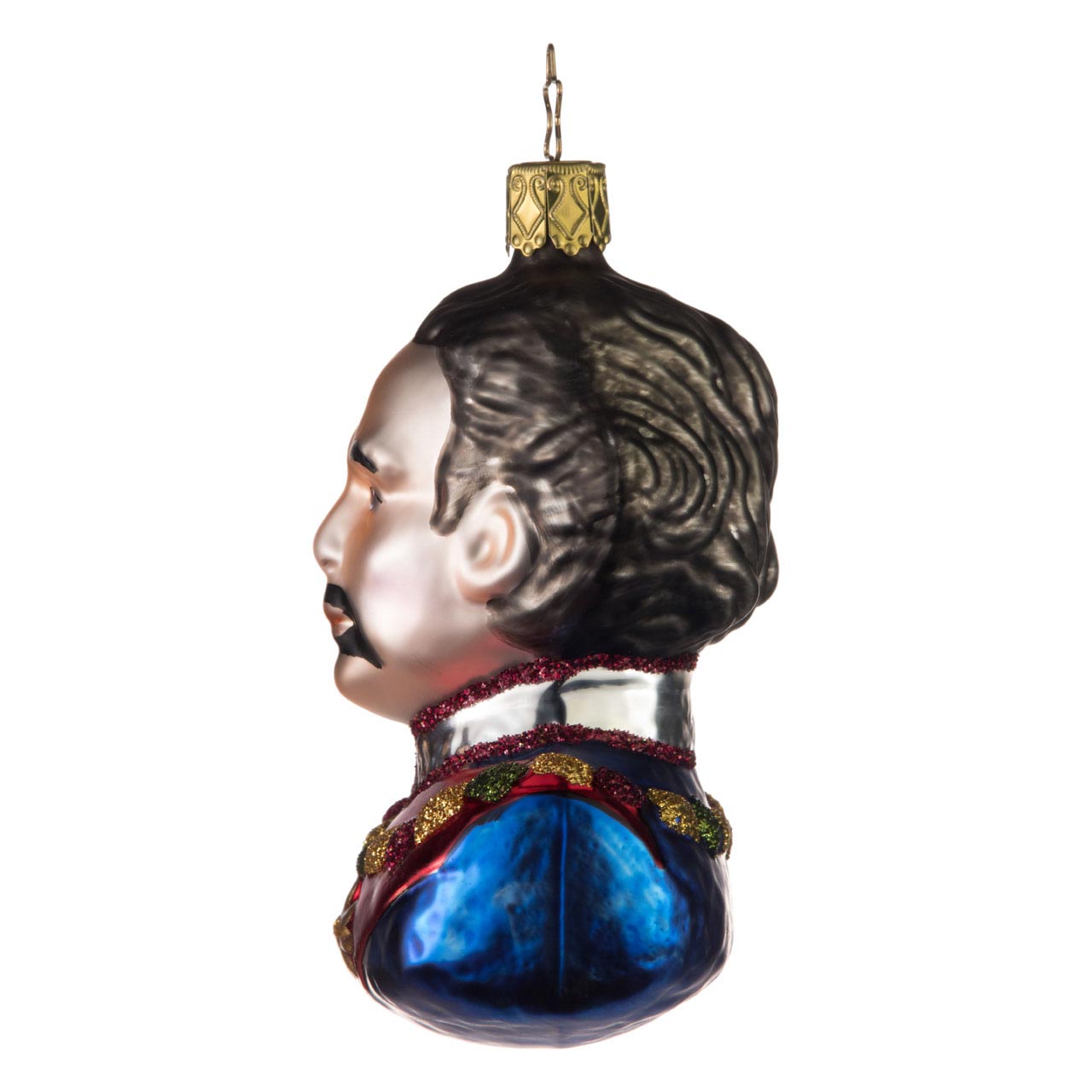 Ya es hora de erigir un monumento al propio entusiasta mecenas de la cultura y la estética arquitectónica, en forma de un pequeño y fino busto para el árbol de Navidad. Brillante, por supuesto, la chaqueta del uniforme real en azul, el fajín obligatorio en rojo carmesí. El majestuoso collar con una estrella dorada en el pecho brilla en dorado, rojo y verde. El rostro también impresiona con sus ojos delicadamente pintados y la típica barba afeitada con precisión. Sin olvidar la cabellera castaña, ligeramente curvada, que juega alrededor de la cabeza de Ludwig.