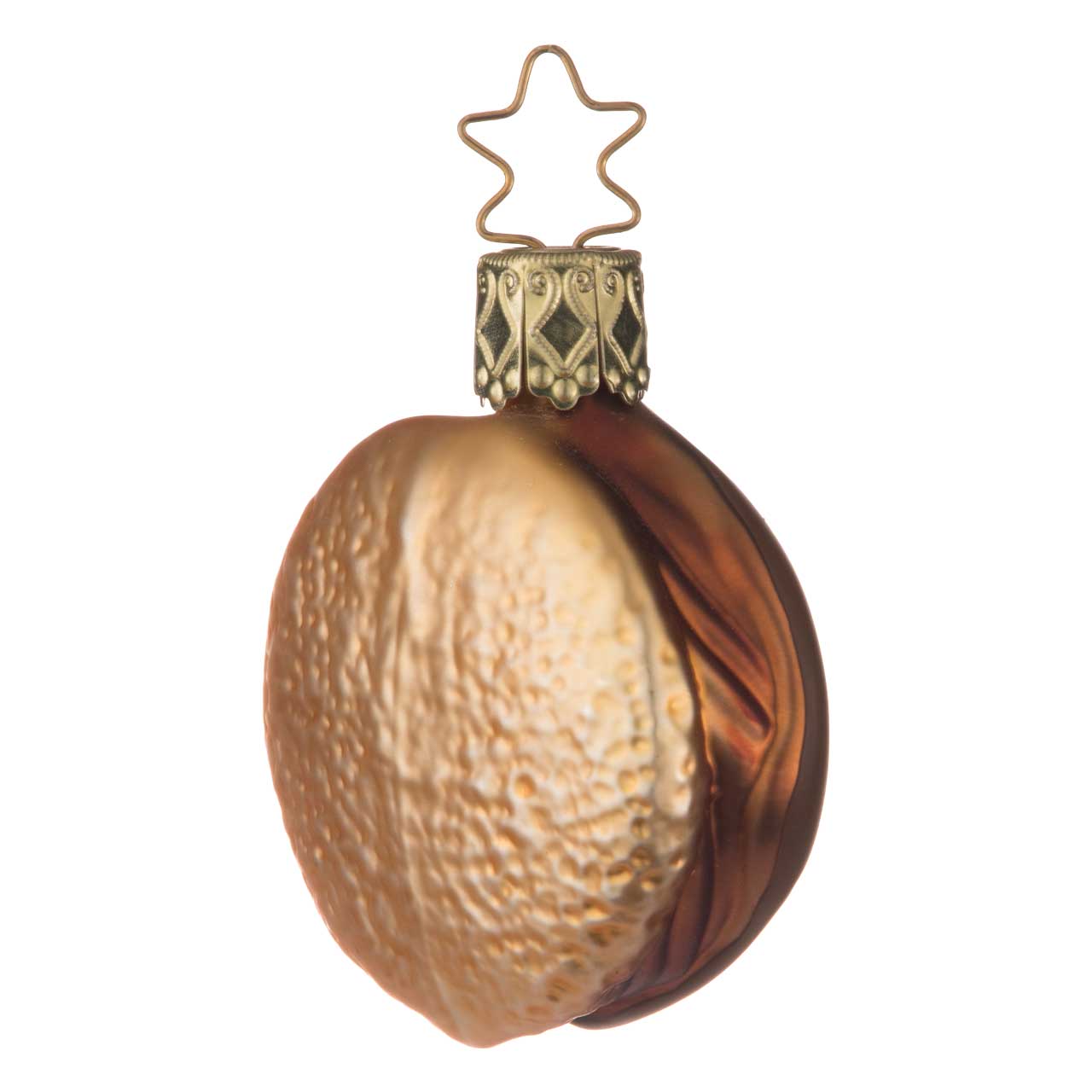 La Bola de Navidad presenta un Ischler Krapferl redondo con un diseño detallado: glaseado de chocolate marrón brillante con una almendra de color claro en el centro, además de la textura de la masa marrón dorada en el lateral. Los colores marrón, beige y dorado confieren a la bola un carácter apetitoso y nostálgico.