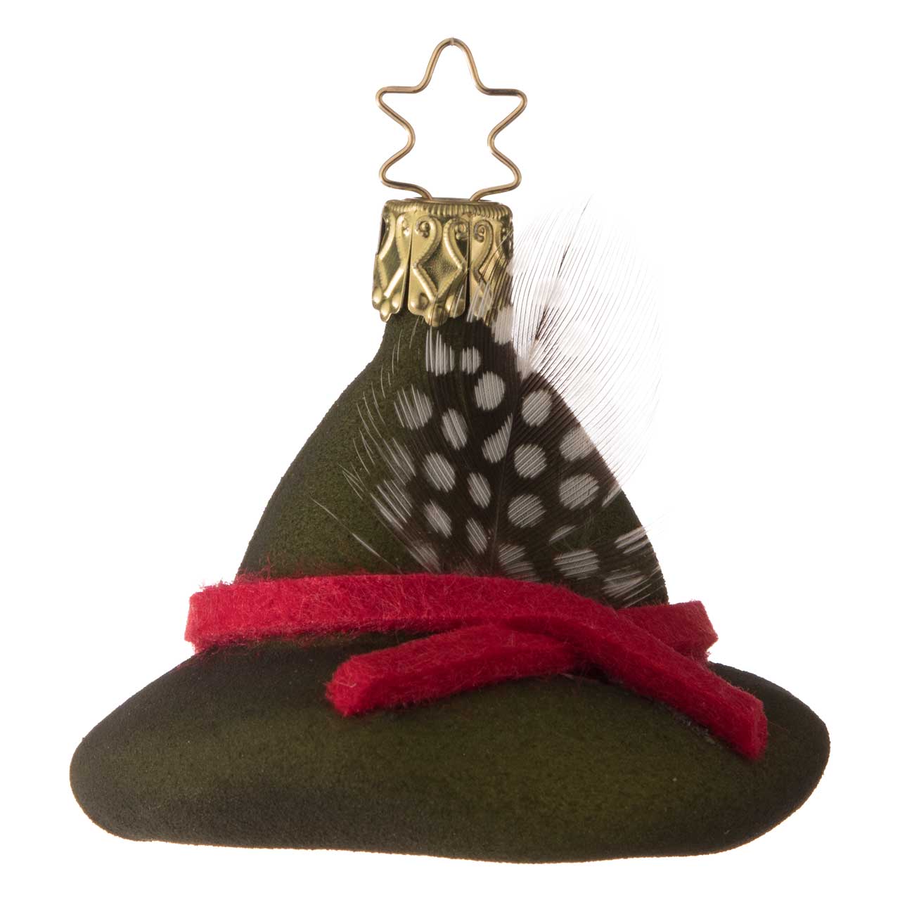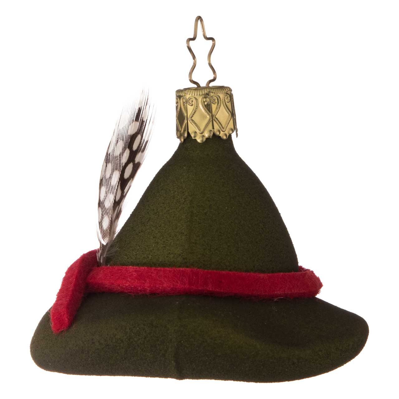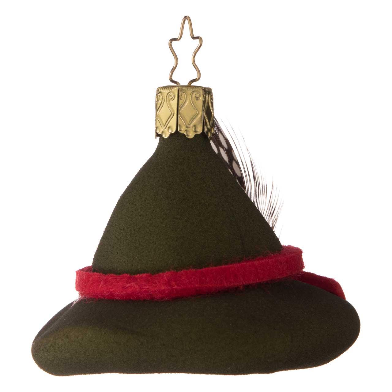 La figura está inspirada en el clásico sombrero de guardabosque, con ala ancha y copa ligeramente abombada. Se presenta en un color verde intenso y mate y se acentúa con una cinta roja y una pequeña pluma detallada. La bola combina un aspecto suave y textil con un diseño claro, lo que le confiere un aspecto especialmente auténtico y encantador.