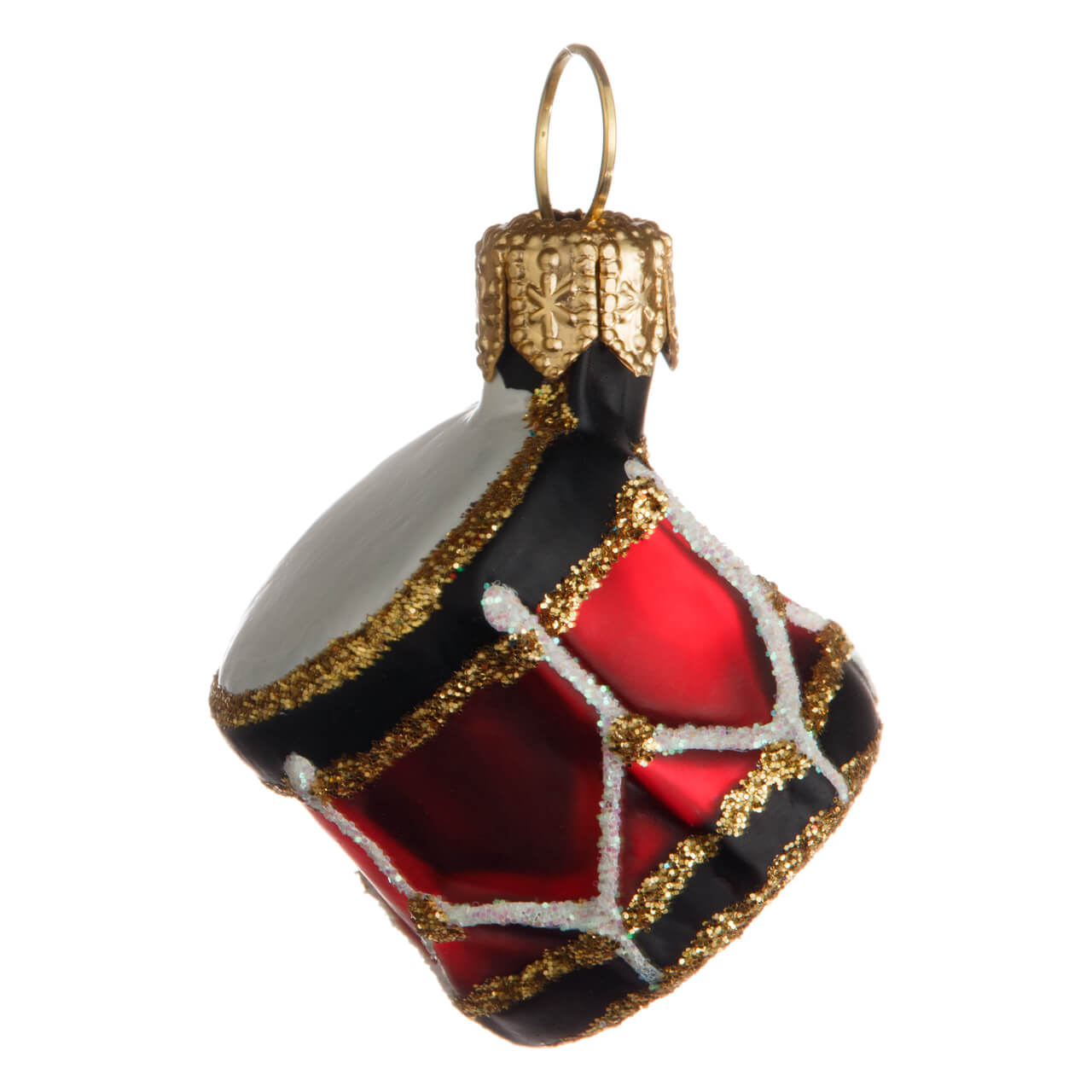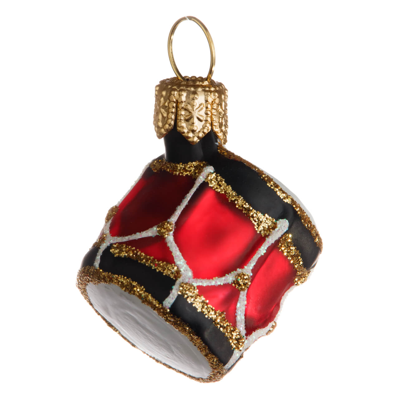 Bonito y acogedor, pero diseñado y pintado con arte y esmero. El cuerpo está pintado en rojo festivo, los bordes superior e inferior son negros, enmarcados por contornos dorados, las pieles del tambor son blancas, al igual que las correas, que también están decoradas con purpurina blanca.