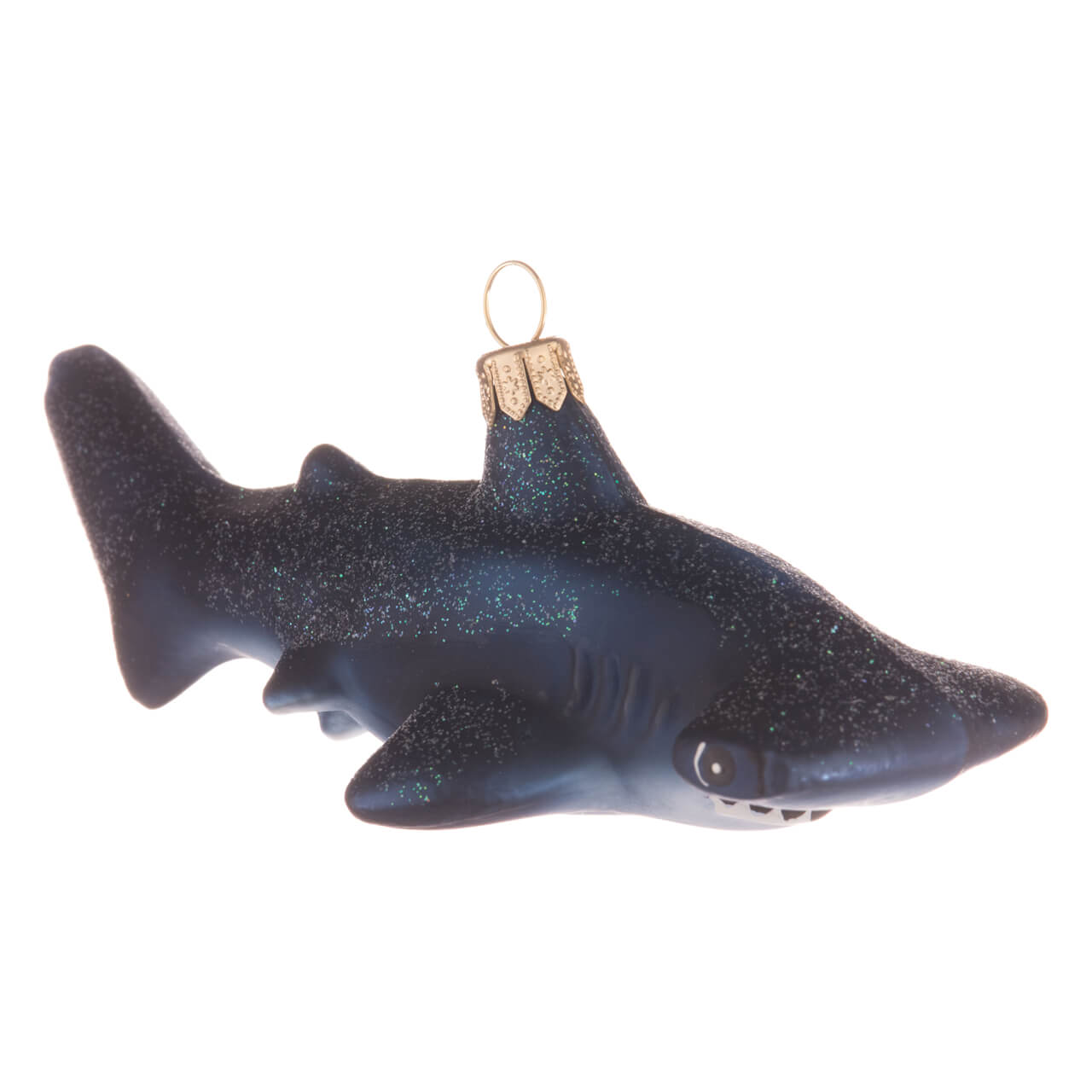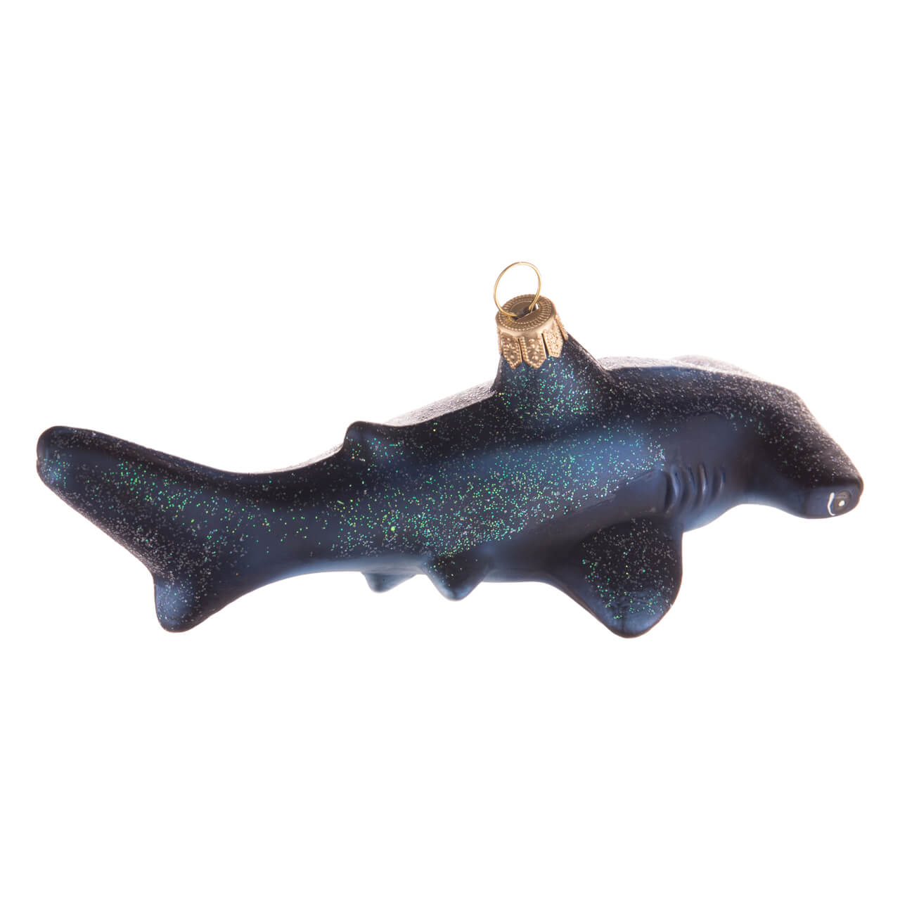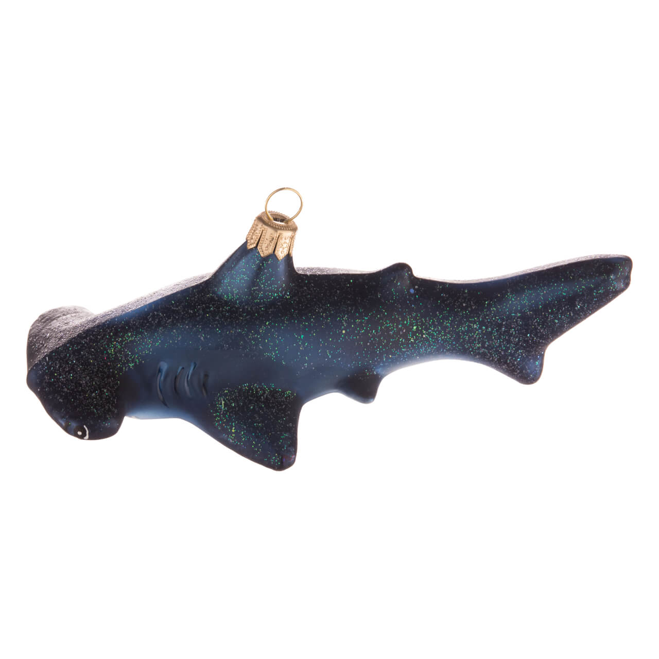 La característica forma de martillo adorna también la cabeza del animal como figurita de cristal para el árbol de Navidad. Unos ojos atentos a ambos lados y una boca con dientes blancos y una abertura oscura también forman el memorable rostro del animal depredador. El típico cuerpo en forma de tiburón del pez cartilaginoso es cortado y musculoso. Sólo en la coloración los pintores se inspiraron en el hermoso azul del océano: En lugar de un gris tiburón quizás monótono, el tiburón martillo brilla en un profundo azul marino, que también se transforma elegantemente en gris plateado en el vientre. El polvo de purpurina transparente azulado en el lomo del morador del mar también crea misteriosos efectos de brillo.
