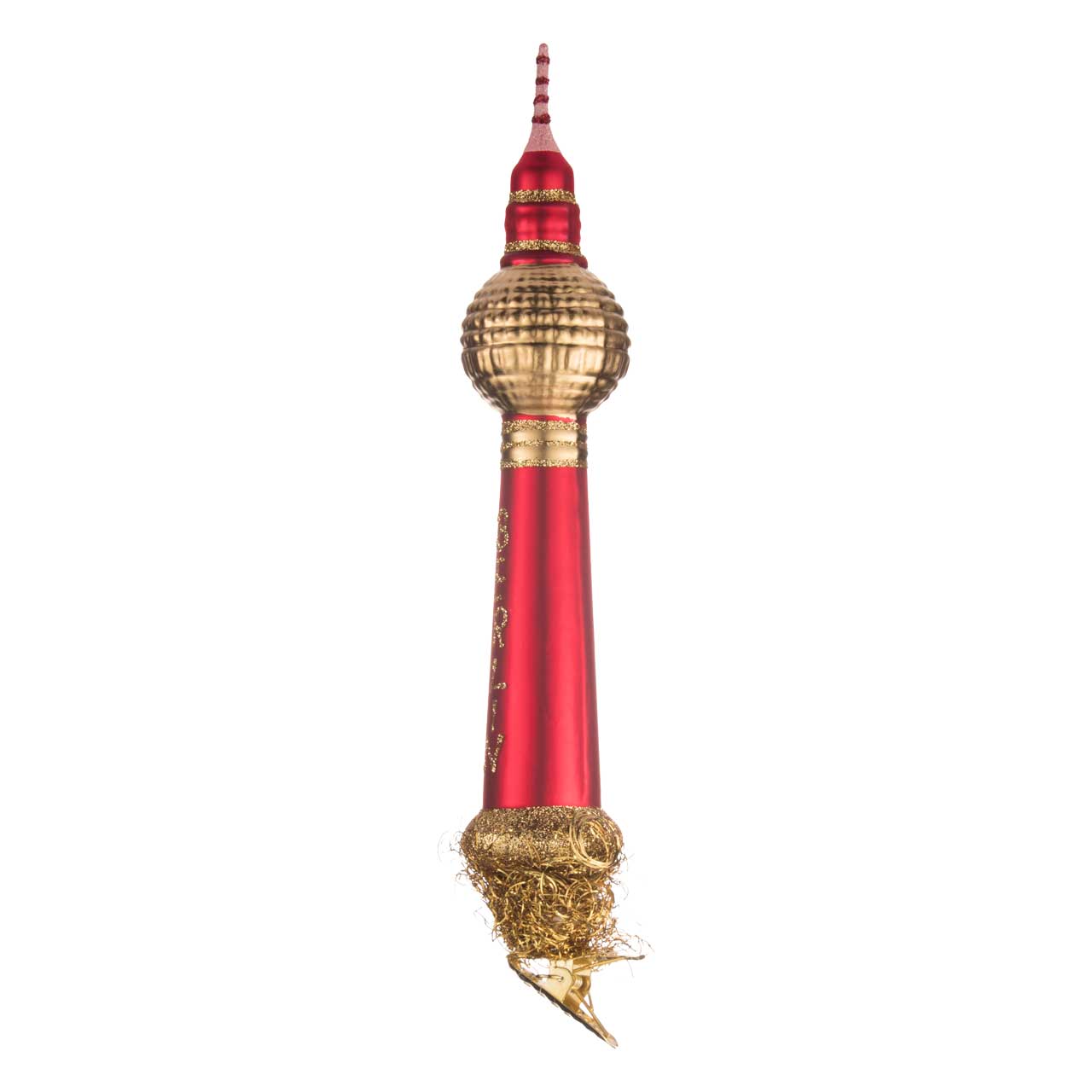 La figura muestra la torre de televisión de Berlín en una forma elegante y alargada, con un fuste rojo y una esfera dorada. Los detalles de purpurina dorada y la inscripción "Berlín" en la parte frontal confieren a la pieza un aspecto festivo. Un brillante centro de atención con una silueta clara y esbelta en rojo y dorado.