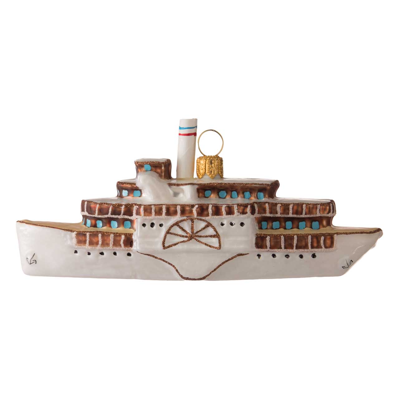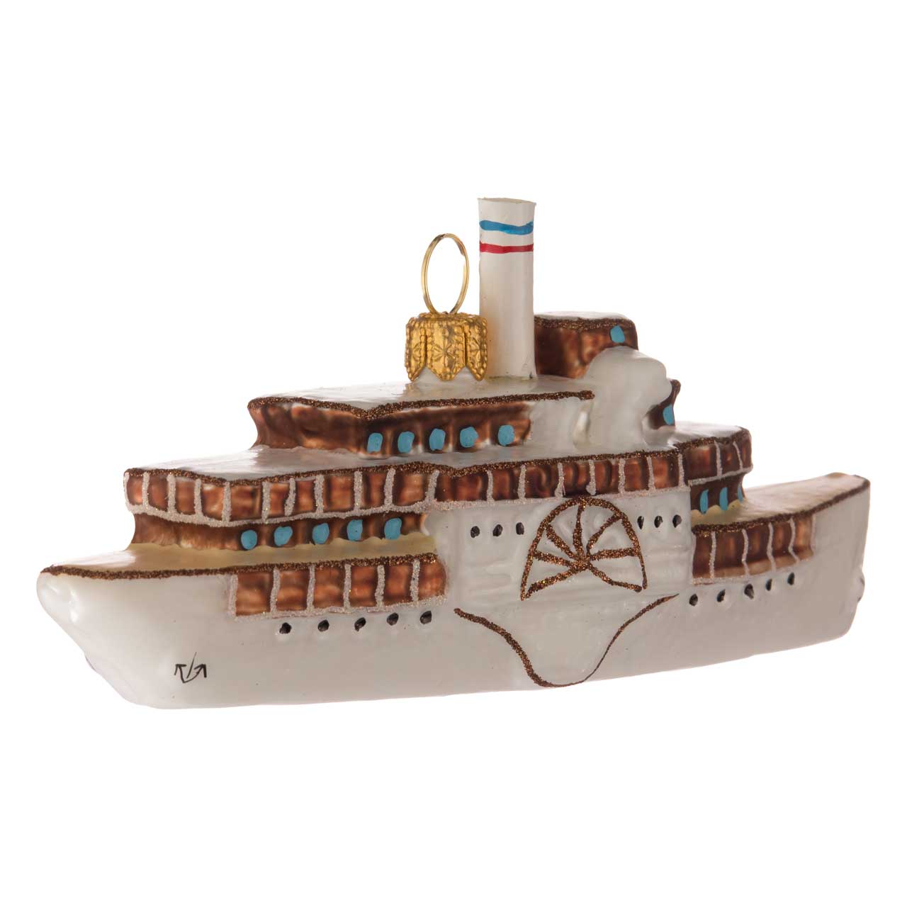 Esta detallada representación muestra un vapor de ruedas clásico en blanco perla con cubiertas de color bronce y finos detalles dorados. Las pequeñas ventanas azul turquesa dan un toque de frescura al barco, mientras que la llamativa rueda de paletas destaca artísticamente en el costado. La chimenea blanca, con sutiles franjas rojas y azules, completa el armonioso conjunto.